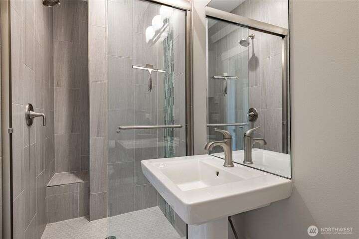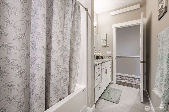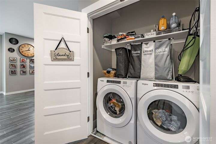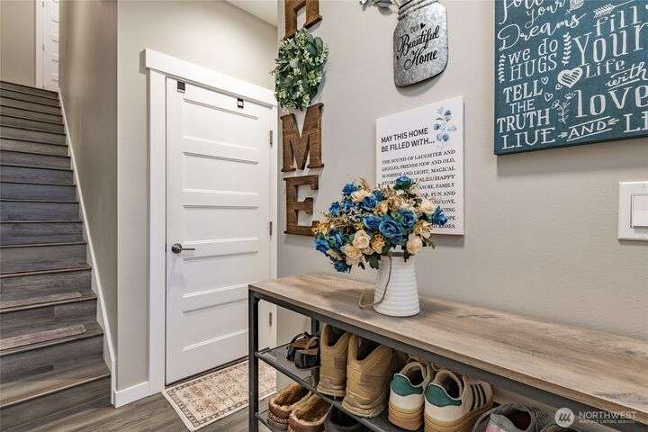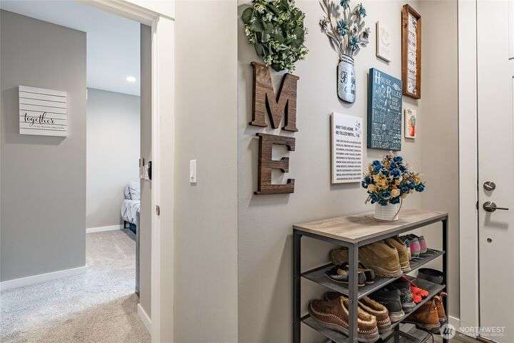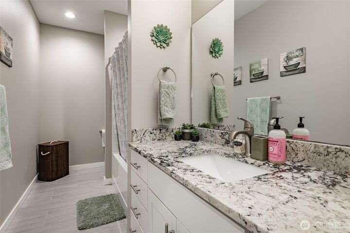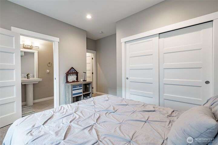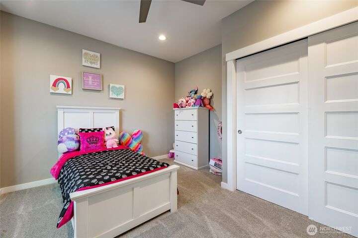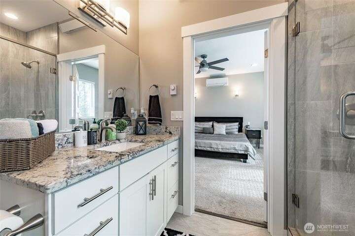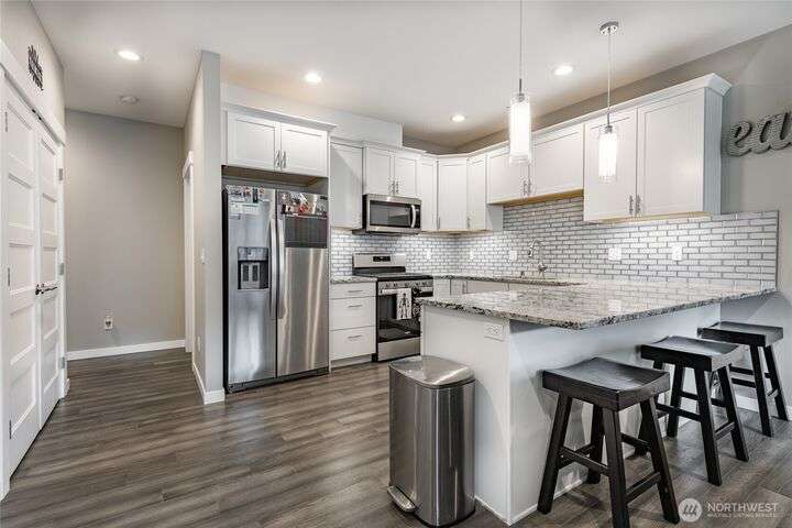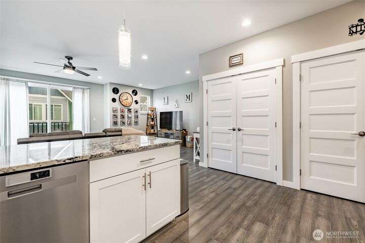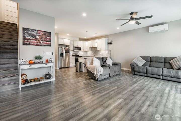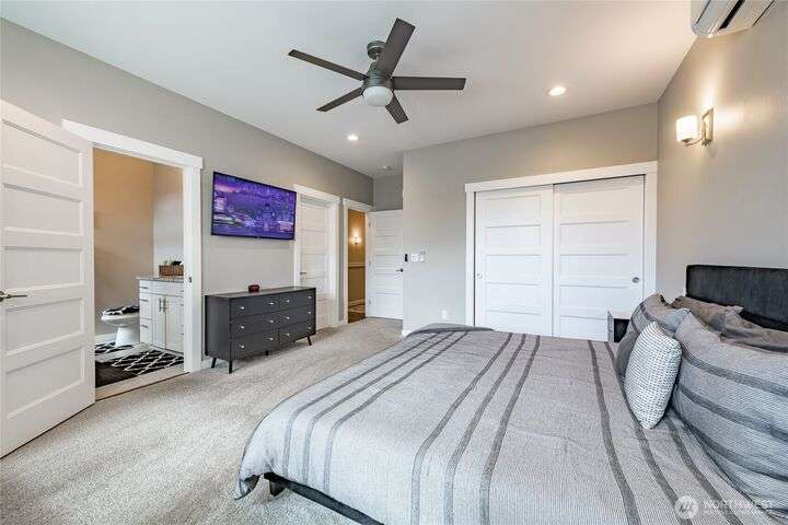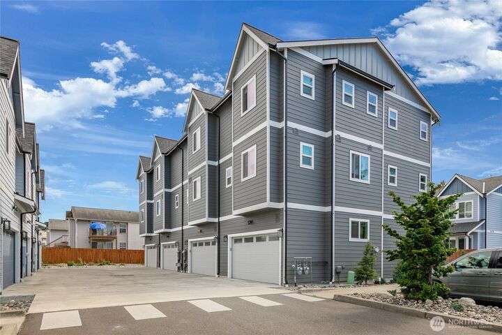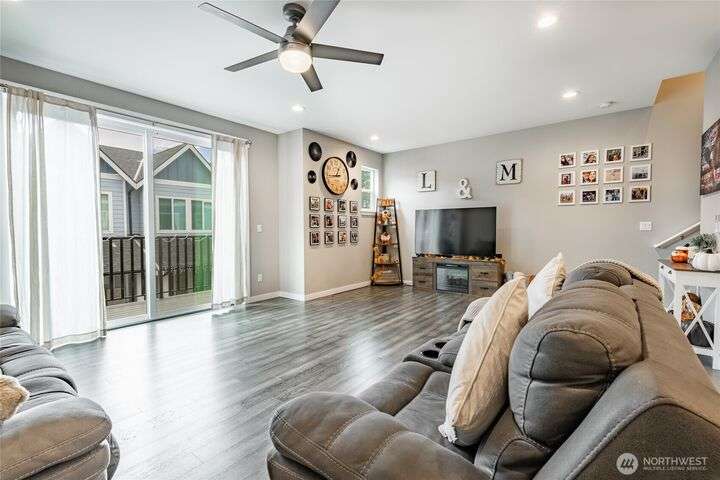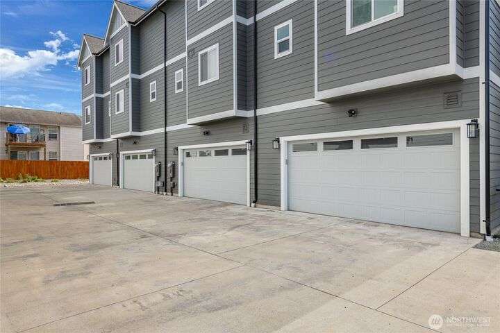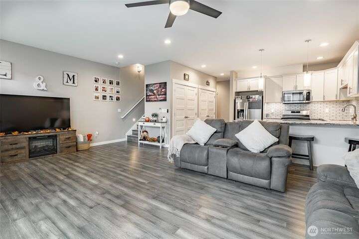 This 4 bedroom, 3 bath, south facing condo is light and bright in the heart of Ferndale is over 2000 SF. High end finishes throughout; stylish luxury vinyl planking, tile bathrooms & showers and granite countertops. The beautifully appointed, warm central kitchen is adjacent to living room, dining room, laundry and walkout deck. In addition to the mini-split heat pump with A/C, there are ceiling fans in every bedroom, with 9-foot ceilings throughout. Tons of storage including a 2 car garage with EV charger. 2nd primary bedroom with ensuite on the main floor. Close to shopping, I-5, the River Walk and play fields. Enjoy nature at Pioneer, Hovander and Tennant Lake Parks.