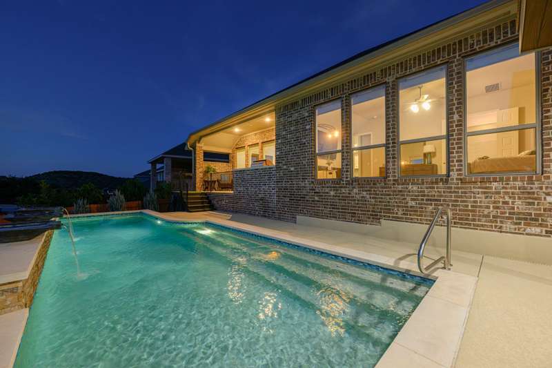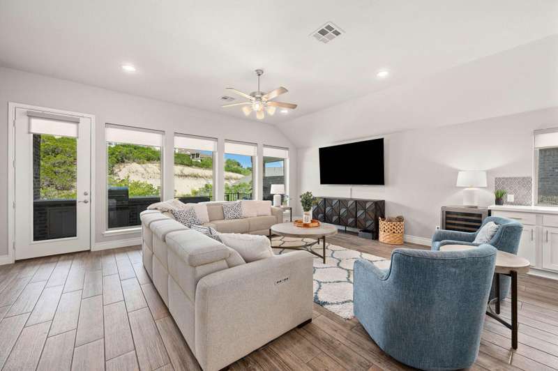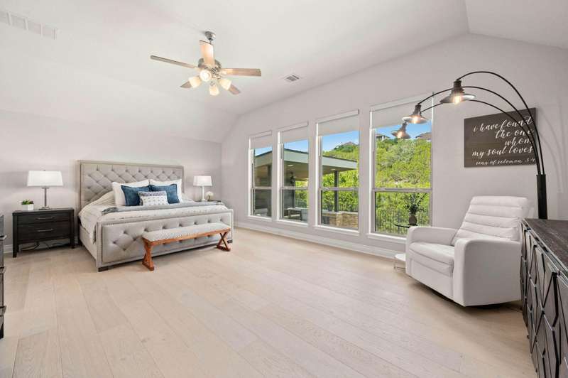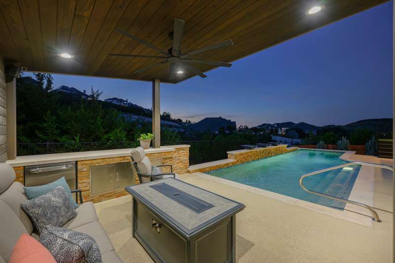 Inside, abundant natural light highlights the hardwood floors and tile throughout. The gourmet kitchen showcases stainless steel appliances, sleek white quartz countertops, and a large center island that opens to the dining area--ideal for everyday living and entertaining alike. The oversized, primary suite is framed with a wall of windows highlighting hill country views and the sparkling pool. Three additional bedrooms can be found; one with en-suite bathroom, as well as an additional bathroom. The extra private office provides the perfect work-from-home retreat.