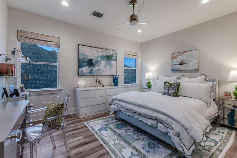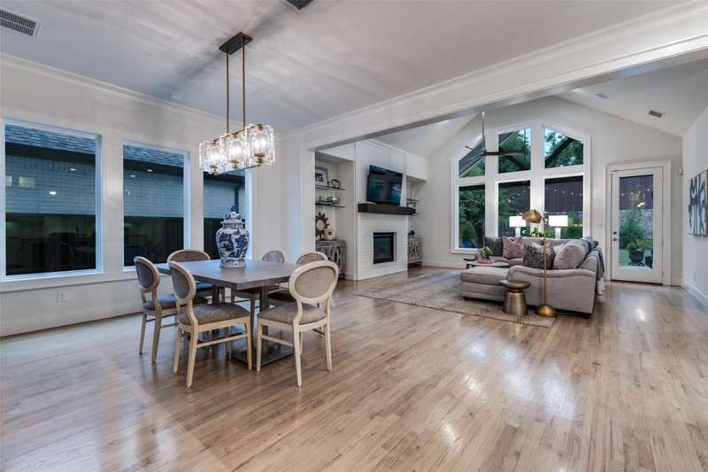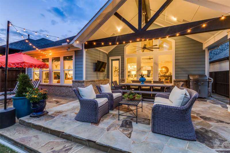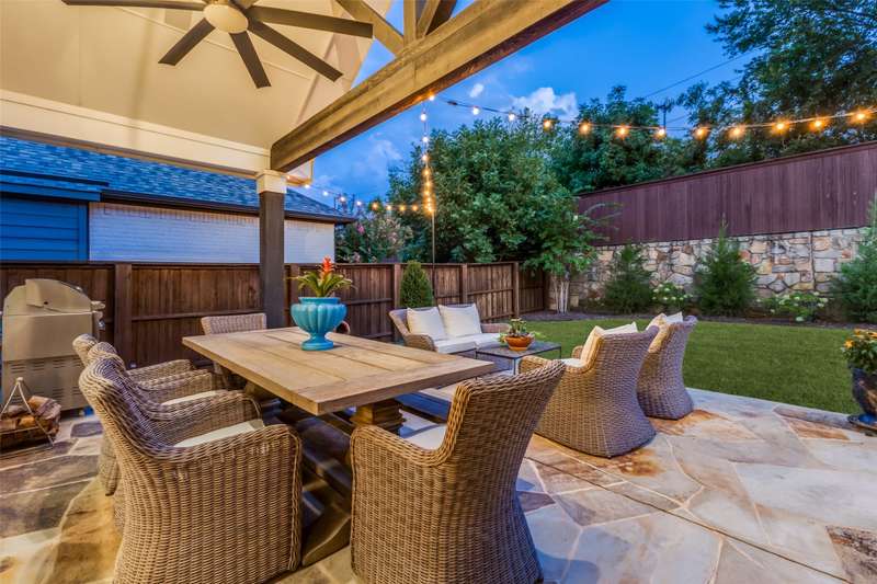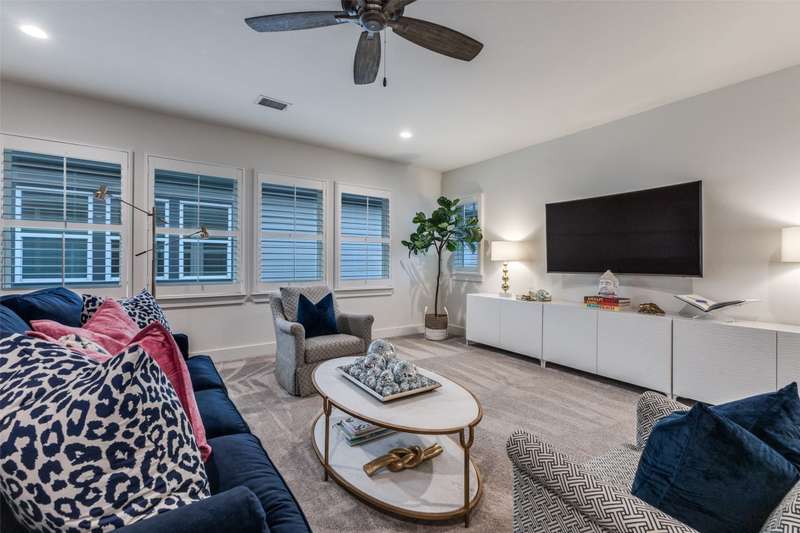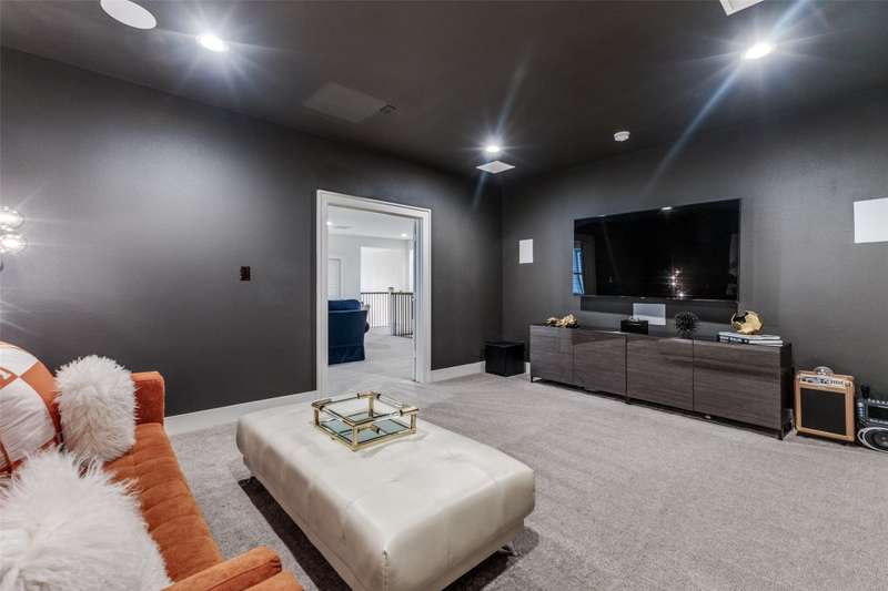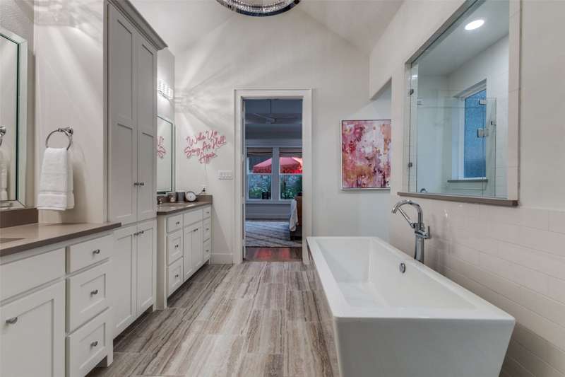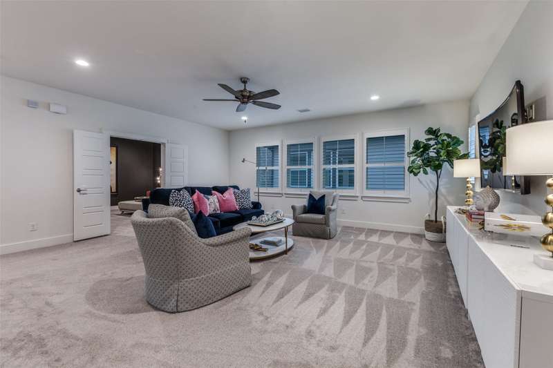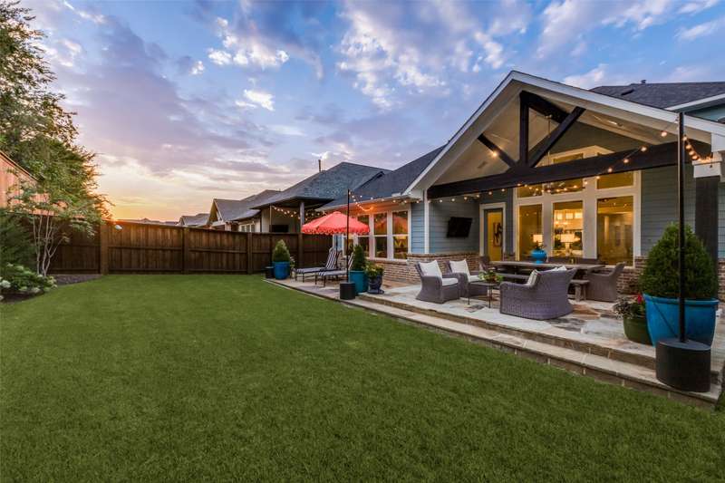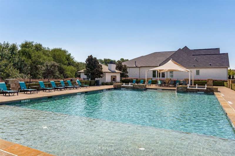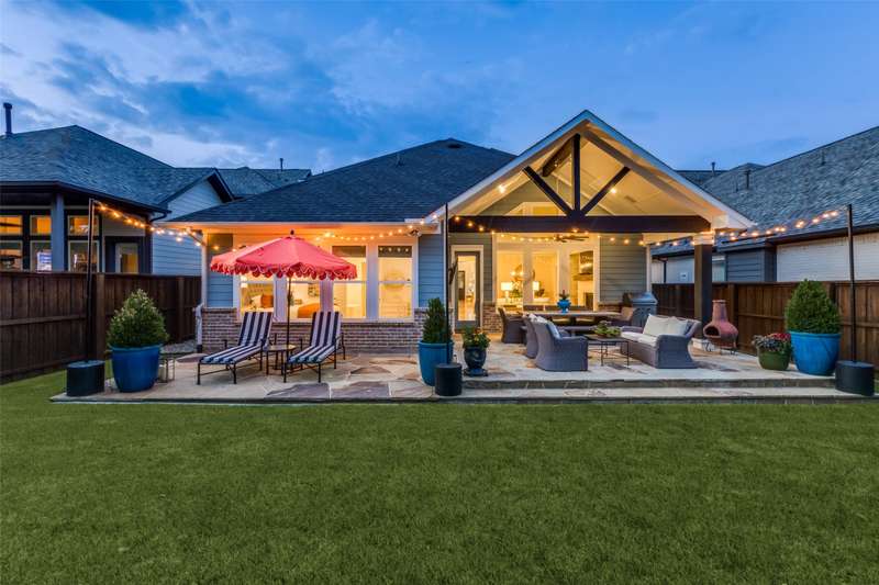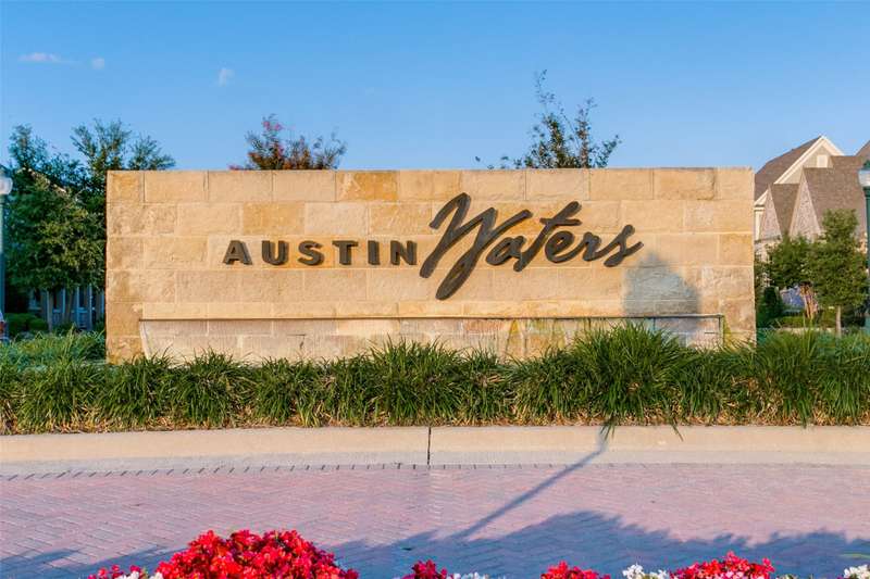 Backing to a canopy of mature trees, this stunning move-in ready, meticulously maintained Southgate custom home in the coveted Austin Waters community seamlessly combines nature, privacy, and sophistication. Walls of windows showcase the lush backyard, bringing the outdoors in with natural light and views. Welcoming two-story foyer leads to light-filled interiors with oak hardwood floors, designer lighting, and flexible, open floor plan. At the heart of the home, the gourmet kitchen features a seated island, quartz countertops, ceiling-height cabinetry, stainless steel appliancesincluding 6-burner gas cooktop with custom vent hood and convection double ovensand opens to the dining and family room with cathedral ceiling and cozy gas fireplace. Luxe primary suite offers a private retreat with sitting area, spa-inspired bath with vaulted ceiling, dual vanities, quartz countertops, freestanding soaker tub, oversized, seamless glass, walk-through shower, and custom closet complete with chandeliers. First-floor bedroom suite is ideal for guests, private study, or multigenerational living. Upstairs are two additional bedrooms each with full baths (one ensuite), a spacious game room, media room pre-wired for surround sound, and walk-in attic storage. The very private outdoor living is equally impressive, with a pool-sized backyard featuring an expanded Oklahoma flagstone patio, board-on-board fence, lush landscaping, and plenty of grassy area for play and pets. Additional highlights include first floor powder room, 3-car garage, extensive storage throughout, and access to community pool and playground. Minutes from DNT, 121, Grandscape, Legacy West, Toyota HQ, Stonebriar Country Club, The Clubs of Prestonwood Hills, Prestonwood Christian Academy, Arbor Hills Nature Preserve, and world-class shopping, dining, and entertainment. Home is North facing.