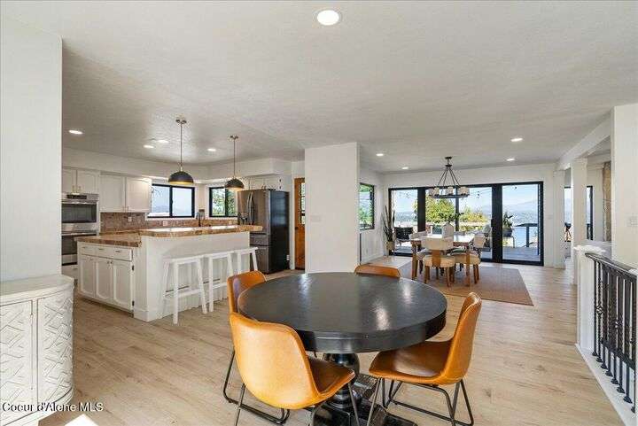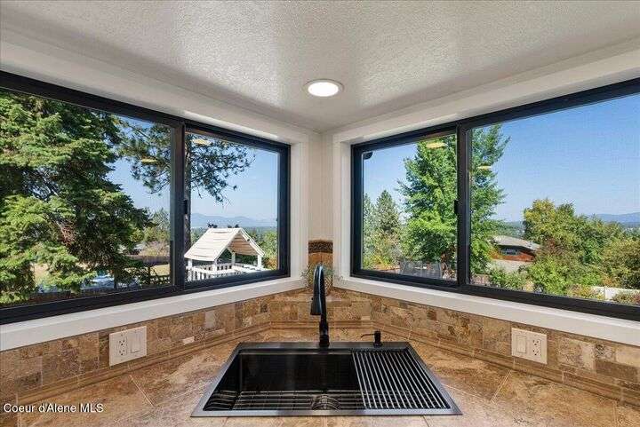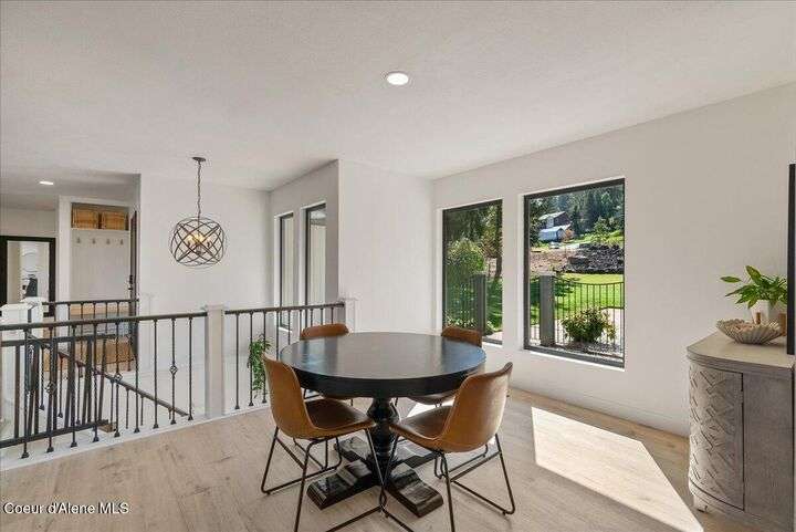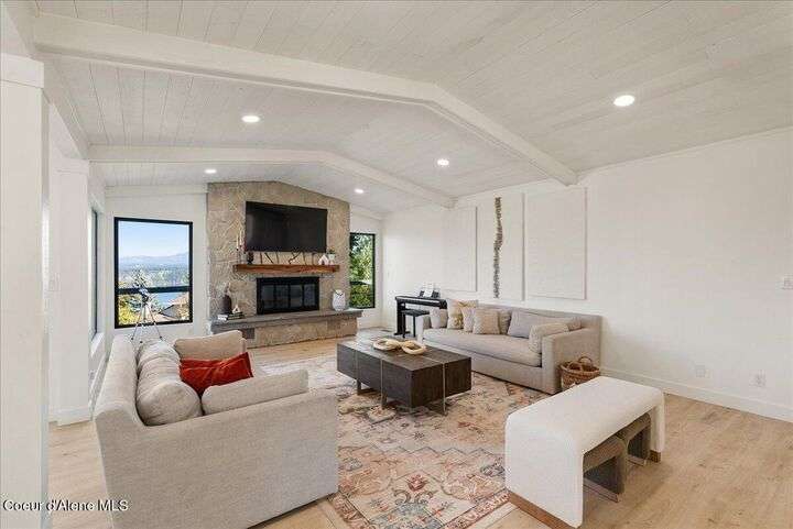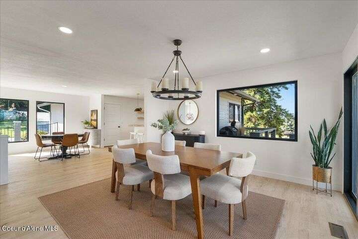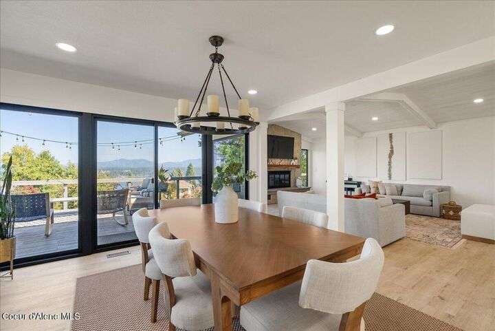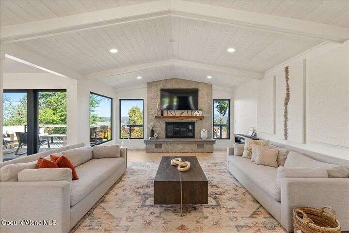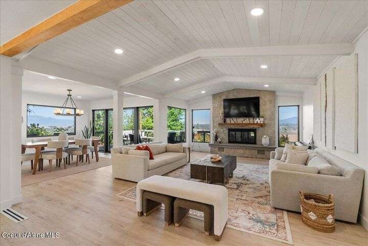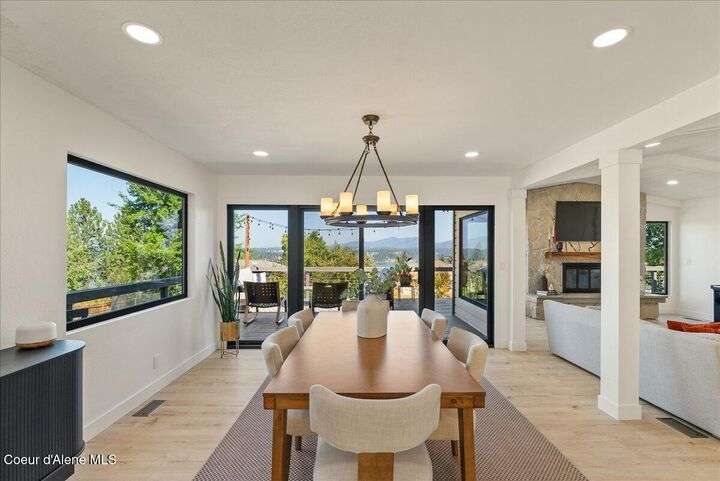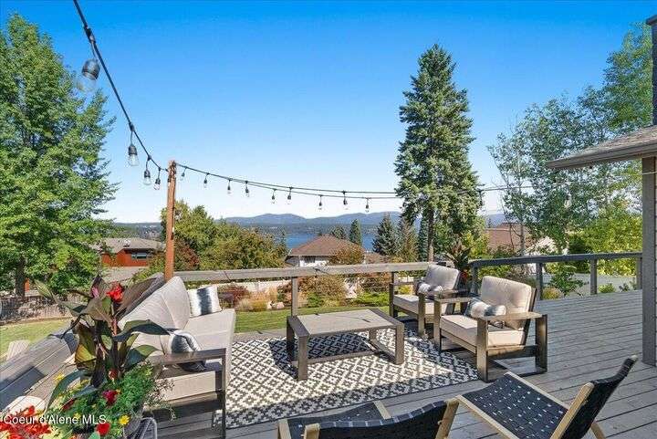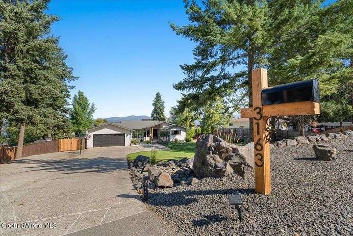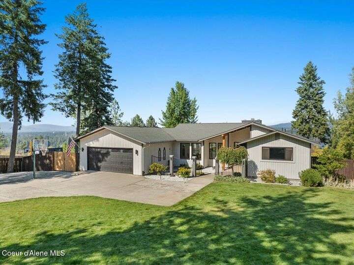 Mid-century modern home offers filtered views of Hayden Lake & surrounding mountains. Just minutes from downtown CDA, Hayden Marina, Honeysuckle Beach, golf courses, shopping & schools. The open-concept design recently updated boasts new LVP, carpet, and vinyl windows to maximize natural light & views. The kitchen opens to an 800 sq ft wraparound deck—perfect for entertaining, 4th of July fireworks, or backyard fun around the firepit & sledding hill. Features include a main floor master, 2 water heaters, a spacious laundry/utility room, 2 wood-burning fireplaces & bedrooms w/dual closets. Outdoors enjoy RV parking, a level backyard with potential for a shop, fruit trees, garden, play structure, hot tub pad & French drains. A rare find combining modern updates, comfort & functionality in a sought-after location.