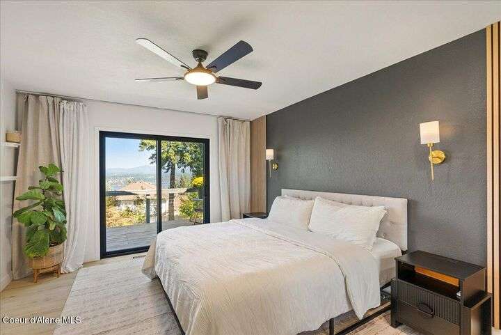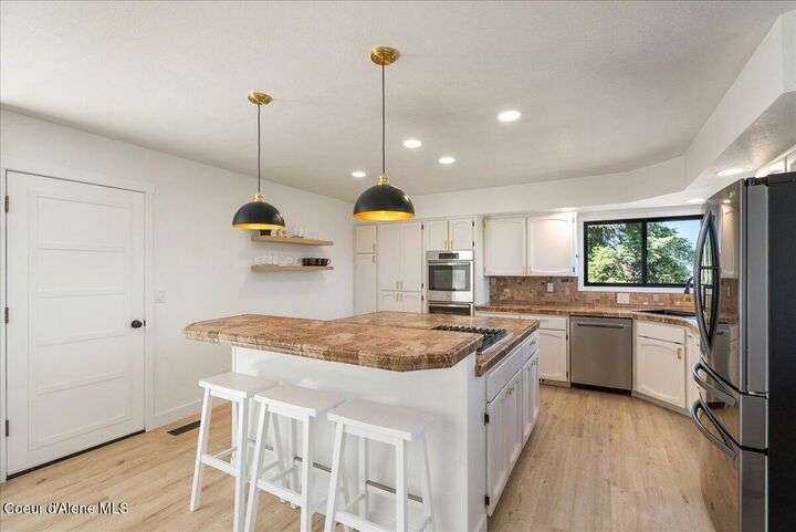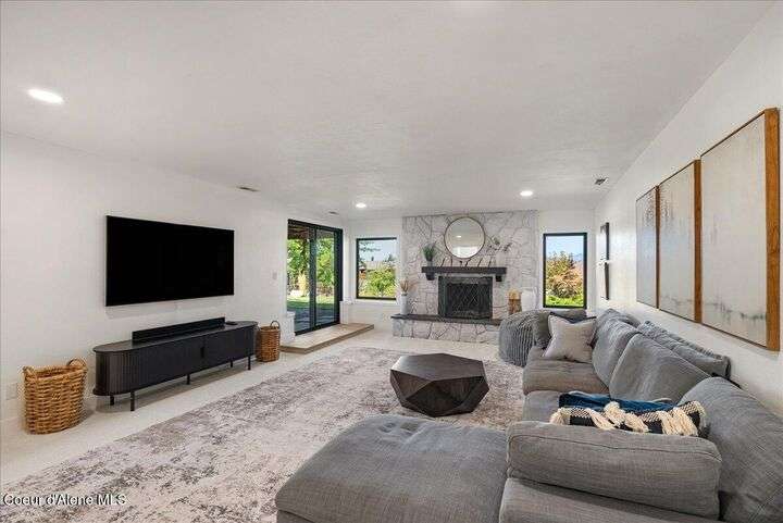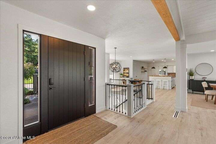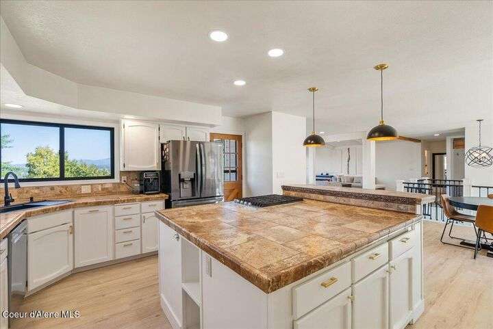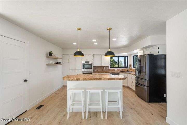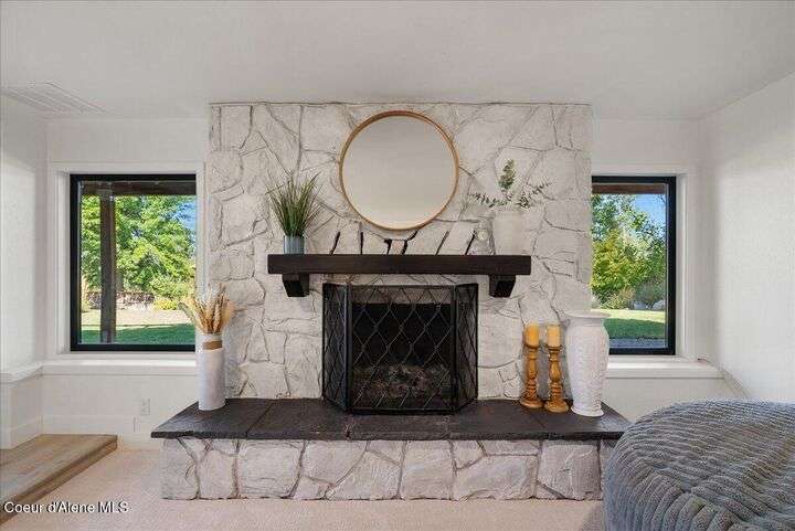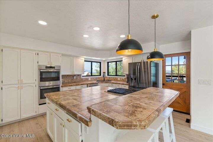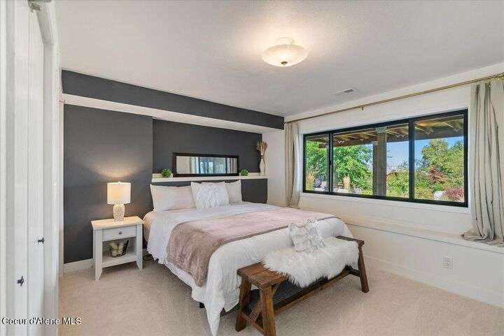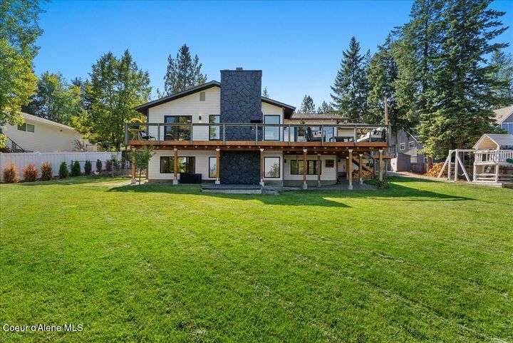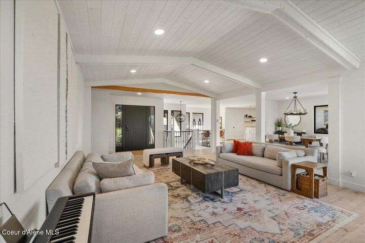 Mid-century modern home offers filtered views of Hayden Lake & surrounding mountains. Just minutes from downtown CDA, Hayden Marina, Honeysuckle Beach, golf courses, shopping & schools. The open-concept design recently updated boasts new LVP, carpet, and vinyl windows to maximize natural light & views. The kitchen opens to an 800 sq ft wraparound deck—perfect for entertaining, 4th of July fireworks, or backyard fun around the firepit & sledding hill. Features include a main floor master, 2 water heaters, a spacious laundry/utility room, 2 wood-burning fireplaces & bedrooms w/dual closets. Outdoors enjoy RV parking, a level backyard with potential for a shop, fruit trees, garden, play structure, hot tub pad & French drains. A rare find combining modern updates, comfort & functionality in a sought-after location.