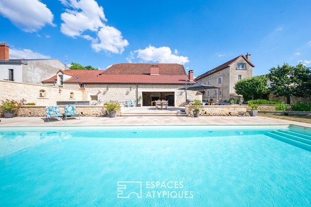 In Is-sur-Tille, this rare real estate complex combines heritage and modernity in a green setting. Built on a 2,700 sqm plot bordered by a mill race, it consists of a 19th-century residence of approximately 240 sqm, fully renovated, and a 17th-century outbuilding of over 300 sqm, with a heated and secure swimming pool, terraces, and landscaped garden.
