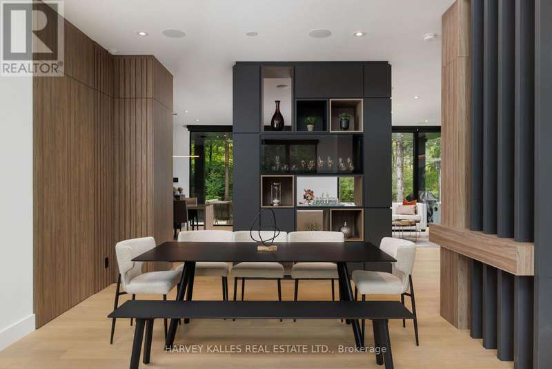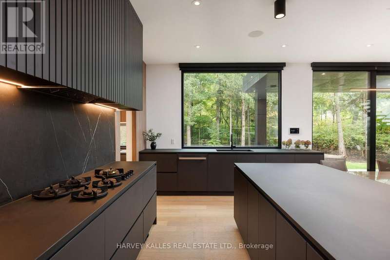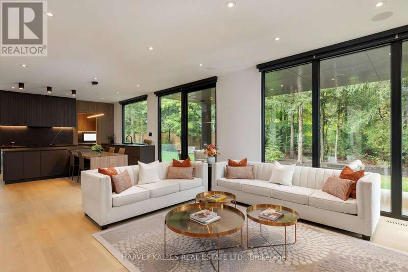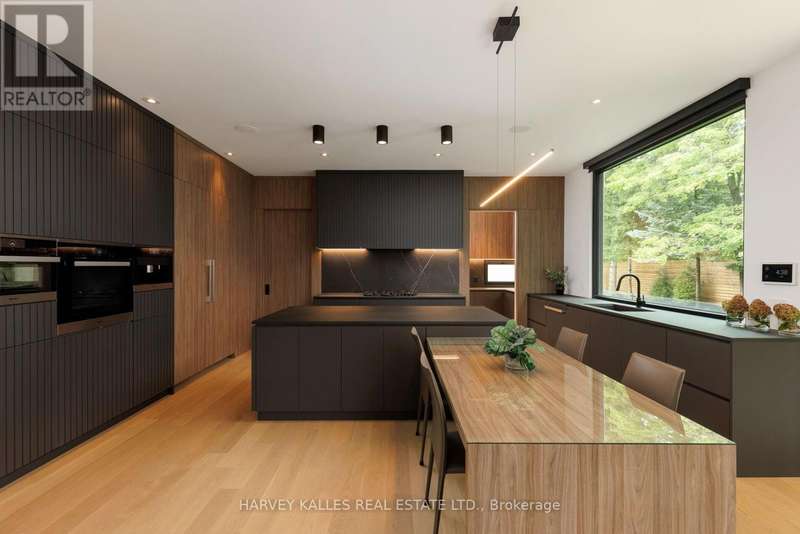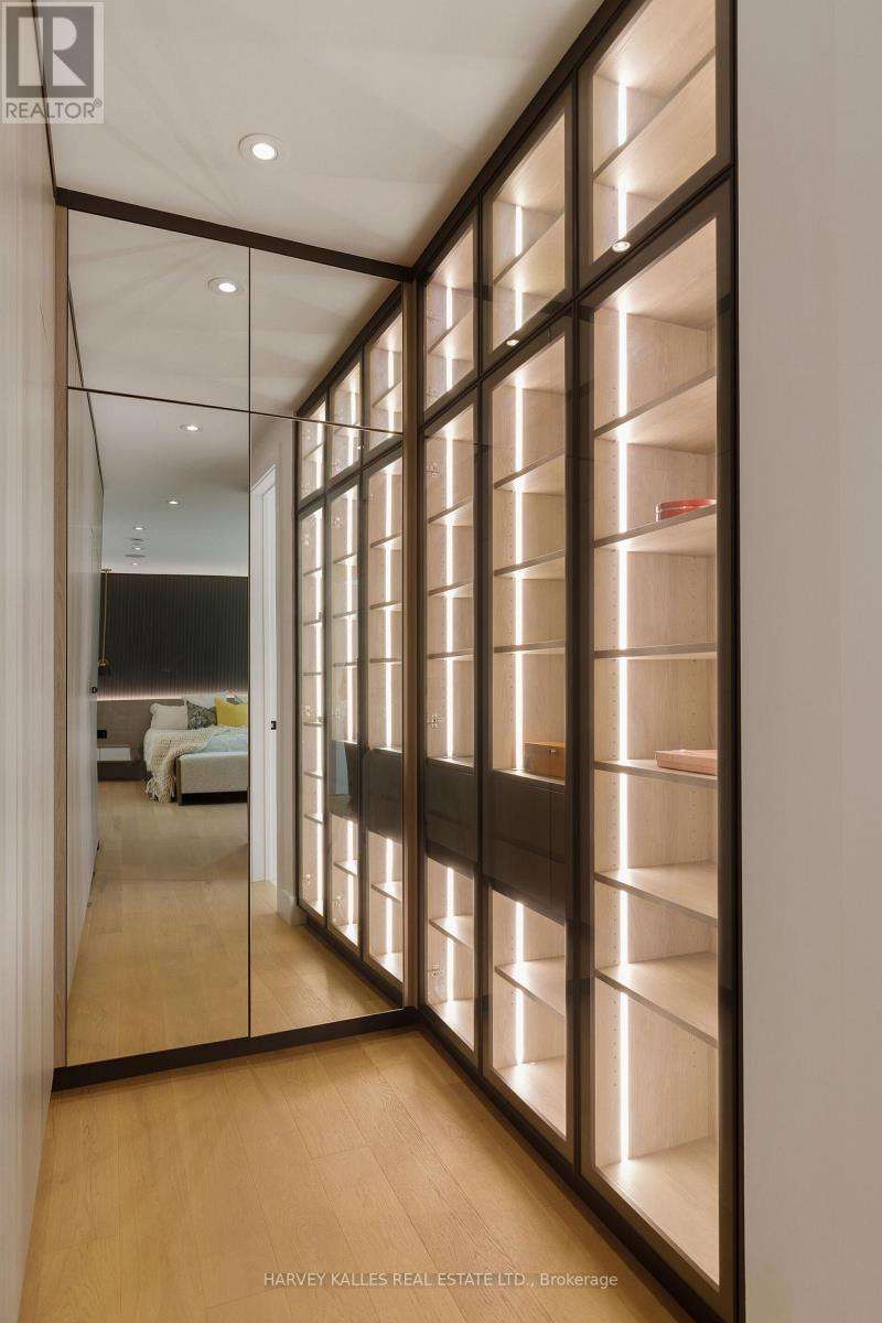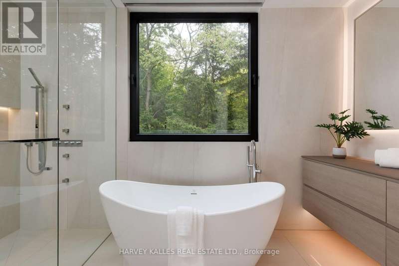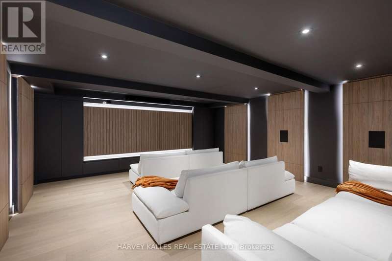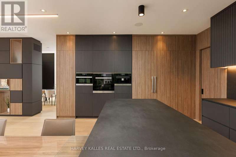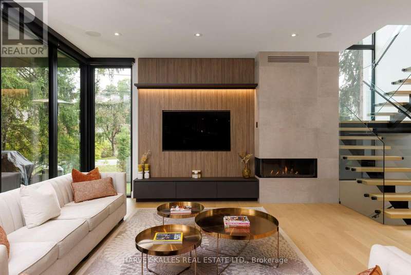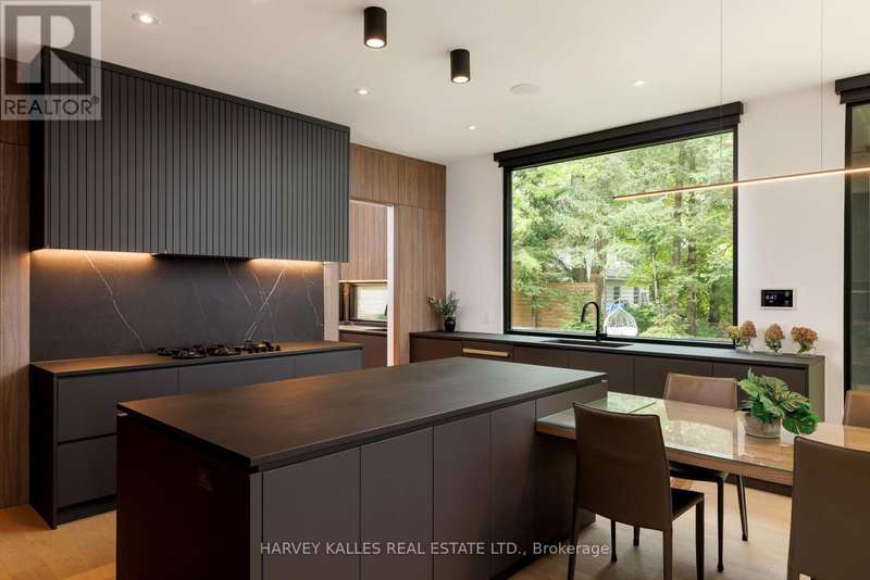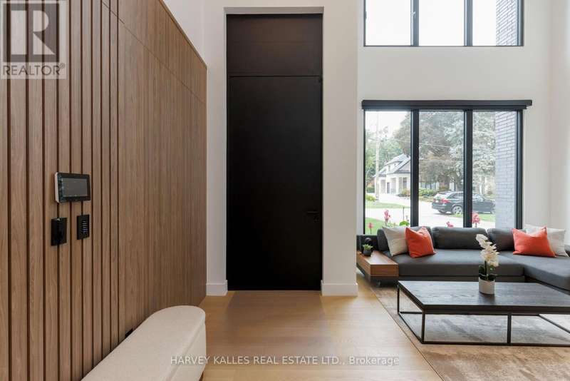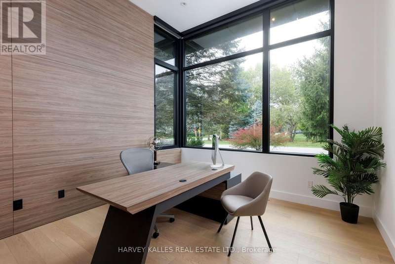 Exceptional custom residence with a masterful fusion of contemporary design with serene zen influences. 6600+ sq. ft. of finished living space, carefully crafted over four years. Dramatic 20-foot foyer with its illuminated glass pivot door, with expansive light-filled spaces highlighted by a floating staircase, architectural feature panel walls, and warm custom millwork. On the main level, a modern family room with a striking two-sided linear fireplace provides both comfort and sophistication, while the bespoke executive office offers custom millwork and gorgeous treetop views. The chefs kitchen is a true showpiece, featuring Miele appliances, a PITT gas counter range, and a separate catering kitchen. A stylish powder room, skylights, heated floors, and refined cabinetry complete the main level.The primary suite is your private retreat with a spa-inspired ensuite, custom walnut and glass walk-in closets, and a cozy lounge complete with 3-sided fireplace ambiance. Additional bedrooms feature en-suite baths and built-in cabinetry, with a flexible fourth bedroom suite that provides versatility. Your laundry room with full custom millwork completes the upper level. The lower level is an entertainment and wellness oasis ... 15-seat soundproof theatre, glass-walled temperature-controlled wine cantina, open-concept gym, and a sleek wet bar create the ultimate space for relaxation and hosting. A nanny or guest suite with a spa-like ensuite and direct walkout to the landscaped grounds ensures comfort and privacy for extended stays. The exterior showcases modern brick and aluminum cladding, beautifully landscaped grounds with irrigation, and sleek architectural lighting. Technology is seamlessly integrated with a Control4 smart home automation system, delivering comfort, convenience, and efficiency at your fingertips.This is more than a home it is a contemporary zen oasis, where design, technology, and tranquility converge to create a sanctuary for modern living. (id:6370)