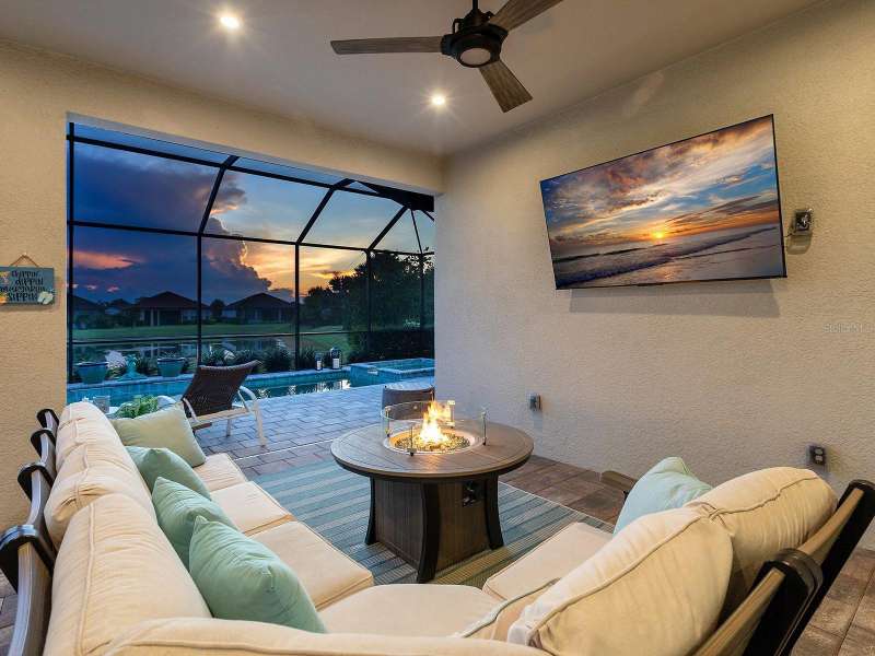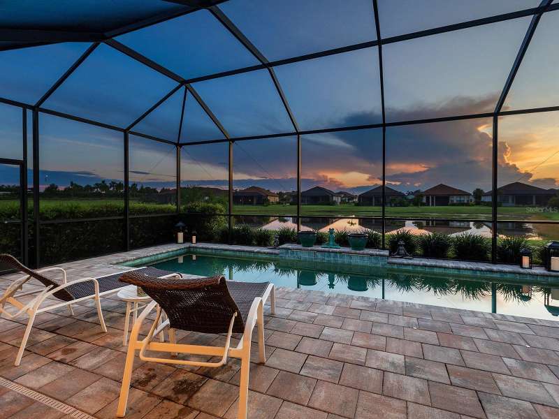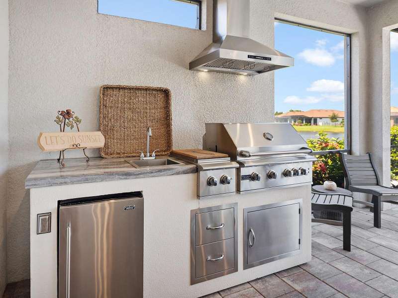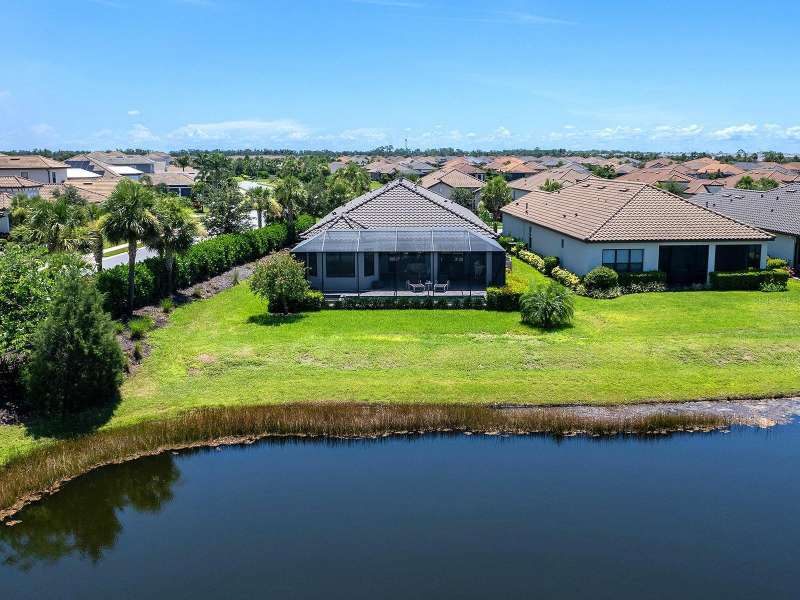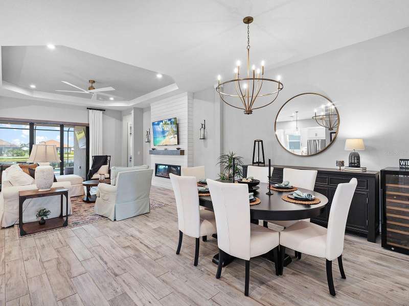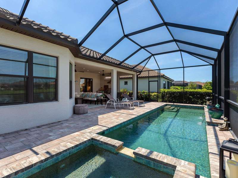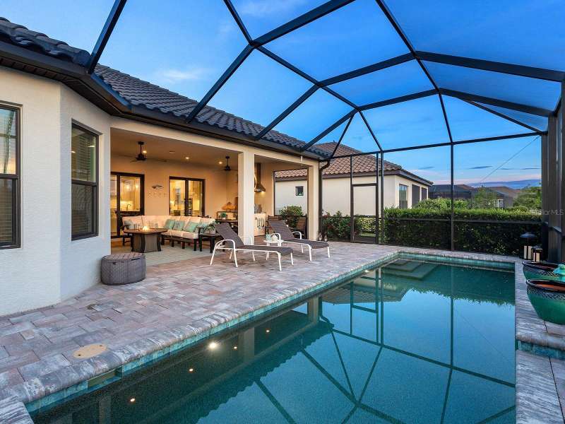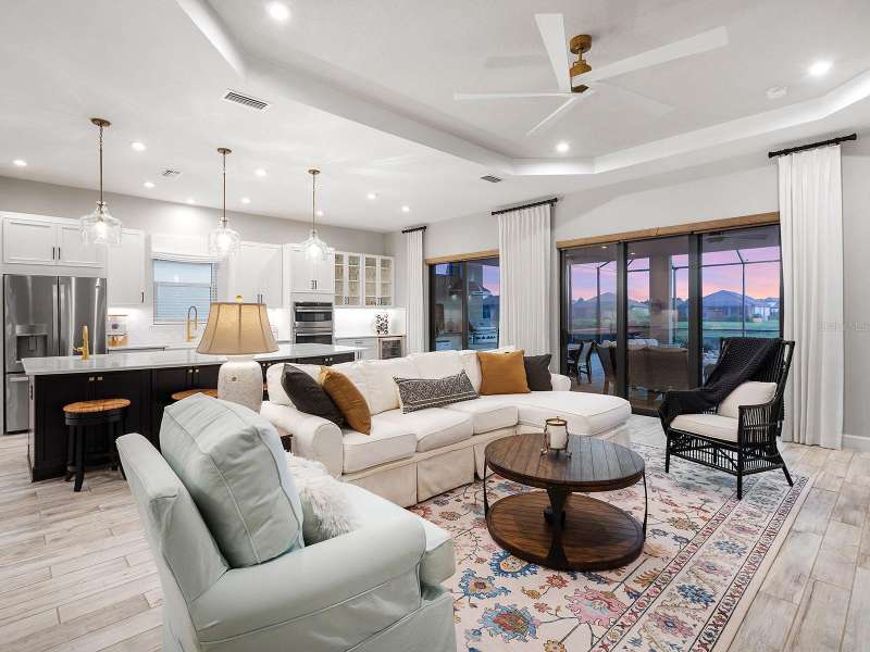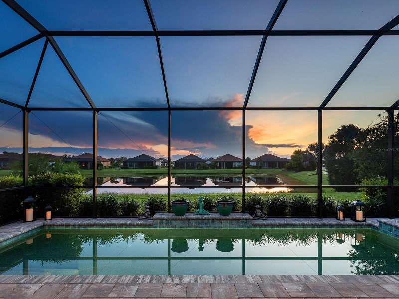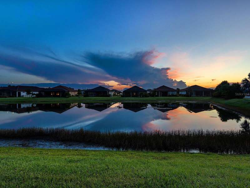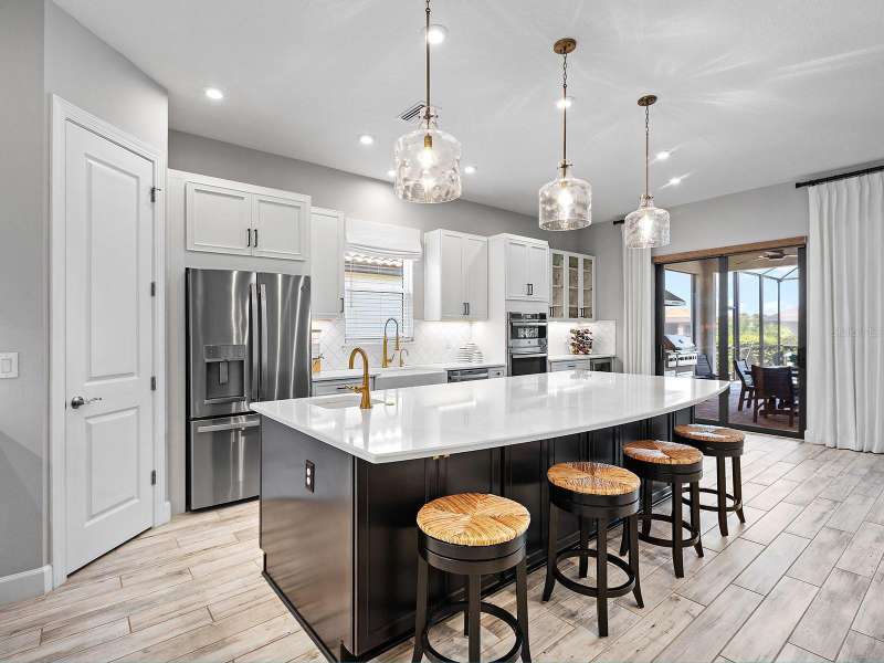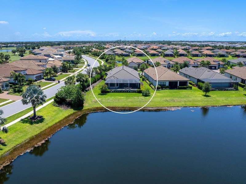 This GOLF DEEDED HOME has a full GOLF MEMBERSHIP INCLUDED! You will love this extended Lazio floor plan with upgraded lakeside living in amenity-rich Esplanade at Azario in Lakewood Ranch. With a spacious corner lot, extremely private landscaping, a desirable western exposure with picturesque sunsets over the lake every evening, and resort-style amenities at your fingertips, you will never want to leave this beautiful home. Recently constructed in 2022, this Taylor Morrison home offers exceptional upgrades beyond the builder basics in an extended floor plan with 2,375 SF of living space in an open and modern floor plan, and is also outfitted with impact windows and doors throughout. The interior boasts a modern and comforting ambiance with wood-look porcelain tile plank flooring, cool and inviting color palette, designer light fixtures, and wood and metal embellishments. The central entertaining area has a flexible great room and dining room space, ideal for family gatherings, entertaining, and daily living. The great room includes a custom shiplap feature wall, wood mantle, electric fireplace, contemporary ceiling fan, and impact sliding doors to the lanai. Chef’s will delight in the executive kitchen equipped with two-tone cabinetry with modern pulls, Quartz counters, farmhouse sink and prep sink both with brushed gold faucets, tile backsplash, walk-in pantry, and high-end stainless steel appliance suite. The kitchen space also features a custom-built wine bar with display cabinets and wine refrigerator. There is also enough space to add a bistro or café table with lake view for more dining and entertaining options. Additional impact sliders lead out to the paver lanai where a spacious covered entertaining space offers room for relaxing and dining next to the outdoor kitchen with stainless steel grill, separate burner, and bar fridge. The lap-style saltwater pool and spa has a waterfall feature and is gas heated so it can be enjoyed year-round. The immaculate details and comforting spaces continue into the primary suite with a feature wall of white shiplap and warm wood, geometric tray ceiling, and seating area overlooking the lake. The en-suite bathroom includes marble-look tile, a jetted soaking tub, walk-in shower with multiple shower heads and bench, dual sinks on a long vanity, and walk-in closet. Guests will enjoy two spacious guest bedrooms, one of which has an en-suite bathroom. Complementing the other fine features, you’ll find a private study with double pocketing doors, functional laundry room, and 2-car garage. Located just a 5-minute walk from the second amenity center, you are steps away from a lakeside resort-style pool, dog park, clubhouse, and community garden. The main amenities campus is just over 1 mile away featuring the main clubhouse, 18-hole golf course, restaurants, resort-style pool with Bahama Bar, tennis and pickleball courts, aqua driving range, golf pro shop, wellness center with spa service, robust calendar of social events and more. Lakewood Ranch is the top multi-generational community in the country for seven years in a row with plentiful shopping, dining, A-rated schools, parks, and nearby beaches