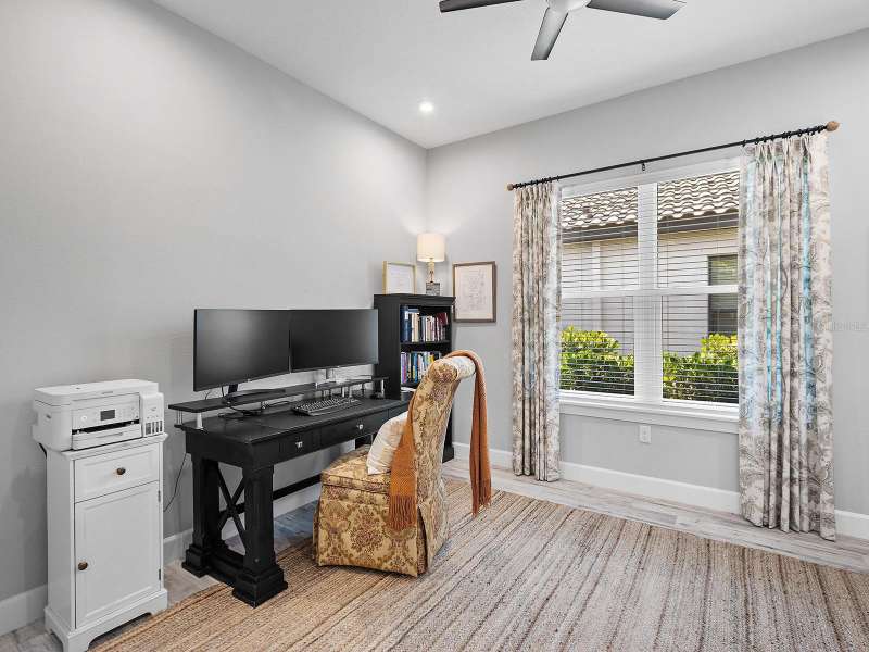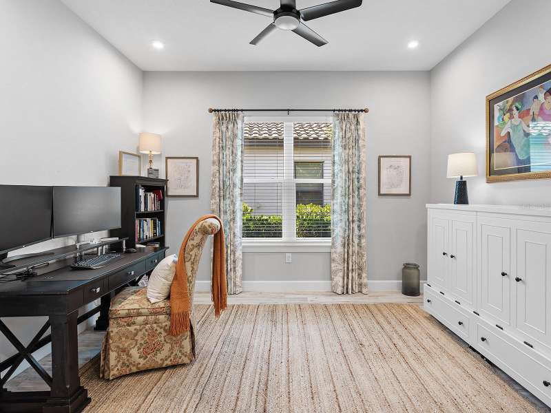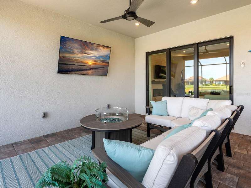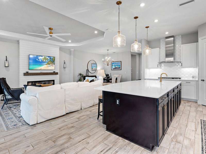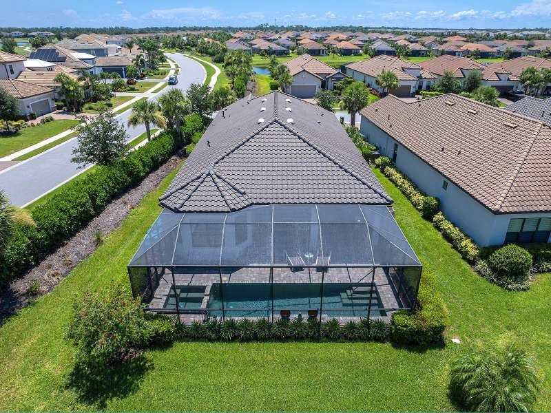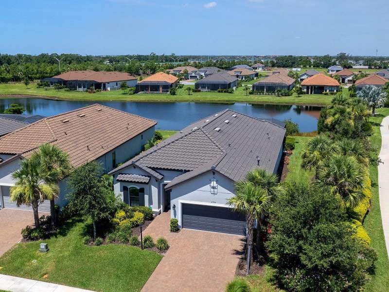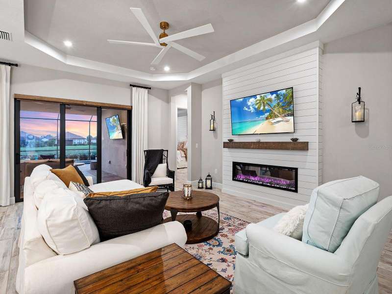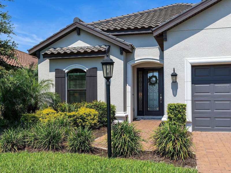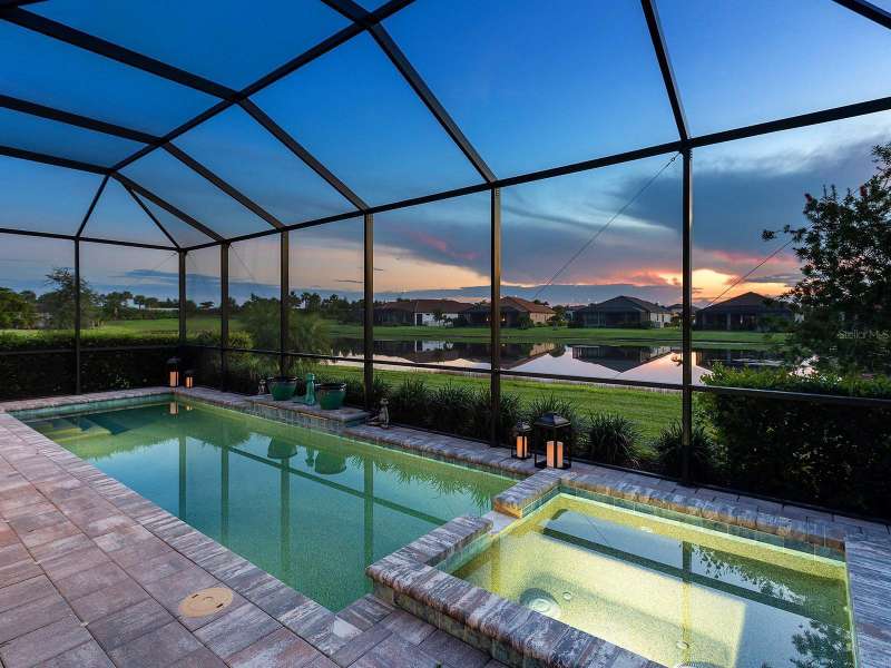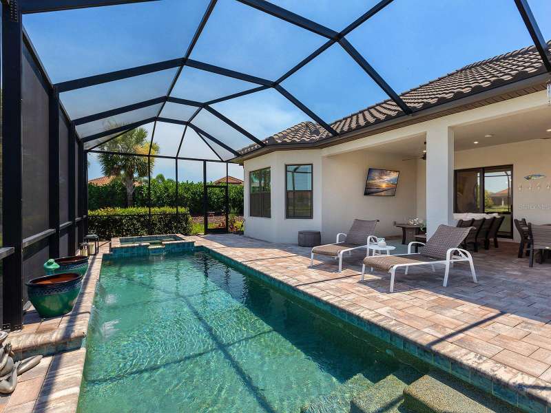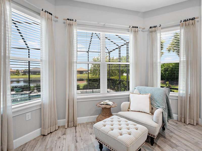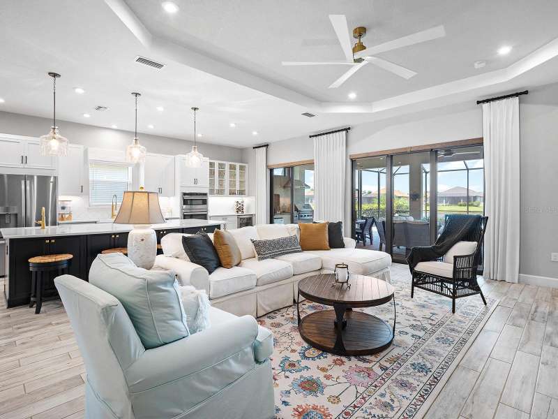 This GOLF DEEDED HOME has a full GOLF MEMBERSHIP INCLUDED! You will love this extended Lazio floor plan with upgraded lakeside living in amenity-rich Esplanade at Azario in Lakewood Ranch. With a spacious corner lot, extremely private landscaping, a desirable western exposure with picturesque sunsets over the lake every evening, and resort-style amenities at your fingertips, you will never want to leave this beautiful home. Recently constructed in 2022, this Taylor Morrison home offers exceptional upgrades beyond the builder basics in an extended floor plan with 2,375 SF of living space in an open and modern floor plan, and is also outfitted with impact windows and doors throughout. The interior boasts a modern and comforting ambiance with wood-look porcelain tile plank flooring, cool and inviting color palette, designer light fixtures, and wood and metal embellishments. The central entertaining area has a flexible great room and dining room space, ideal for family gatherings, entertaining, and daily living. The great room includes a custom shiplap feature wall, wood mantle, electric fireplace, contemporary ceiling fan, and impact sliding doors to the lanai. Chef’s will delight in the executive kitchen equipped with two-tone cabinetry with modern pulls, Quartz counters, farmhouse sink and prep sink both with brushed gold faucets, tile backsplash, walk-in pantry, and high-end stainless steel appliance suite. The kitchen space also features a custom-built wine bar with display cabinets and wine refrigerator. There is also enough space to add a bistro or café table with lake view for more dining and entertaining options. Additional impact sliders lead out to the paver lanai where a spacious covered entertaining space offers room for relaxing and dining next to the outdoor kitchen with stainless steel grill, separate burner, and bar fridge. The lap-style saltwater pool and spa has a waterfall feature and is gas heated so it can be enjoyed year-round. The immaculate details and comforting spaces continue into the primary suite with a feature wall of white shiplap and warm wood, geometric tray ceiling, and seating area overlooking the lake. The en-suite bathroom includes marble-look tile, a jetted soaking tub, walk-in shower with multiple shower heads and bench, dual sinks on a long vanity, and walk-in closet. Guests will enjoy two spacious guest bedrooms, one of which has an en-suite bathroom. Complementing the other fine features, you’ll find a private study with double pocketing doors, functional laundry room, and 2-car garage. Located just a 5-minute walk from the second amenity center, you are steps away from a lakeside resort-style pool, dog park, clubhouse, and community garden. The main amenities campus is just over 1 mile away featuring the main clubhouse, 18-hole golf course, restaurants, resort-style pool with Bahama Bar, tennis and pickleball courts, aqua driving range, golf pro shop, wellness center with spa service, robust calendar of social events and more. Lakewood Ranch is the top multi-generational community in the country for seven years in a row with plentiful shopping, dining, A-rated schools, parks, and nearby beaches