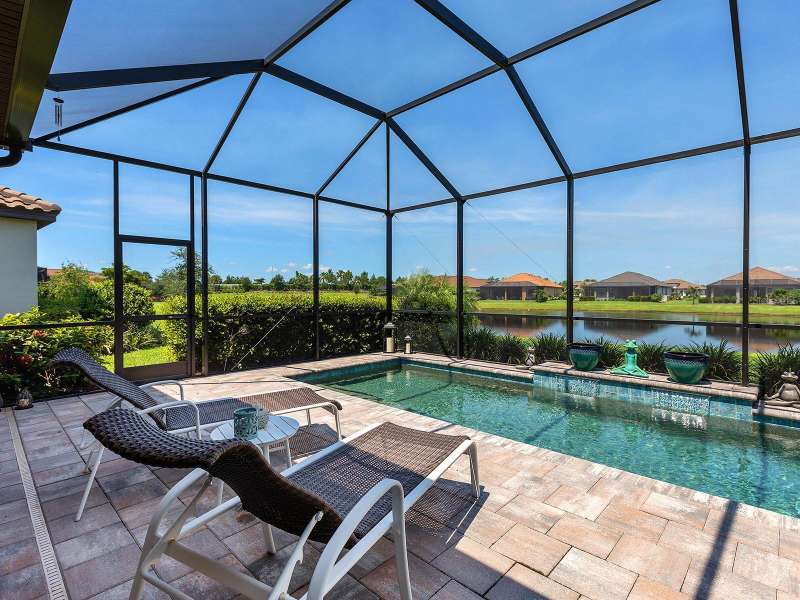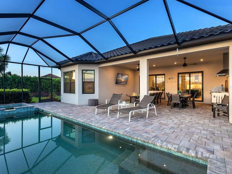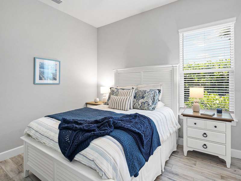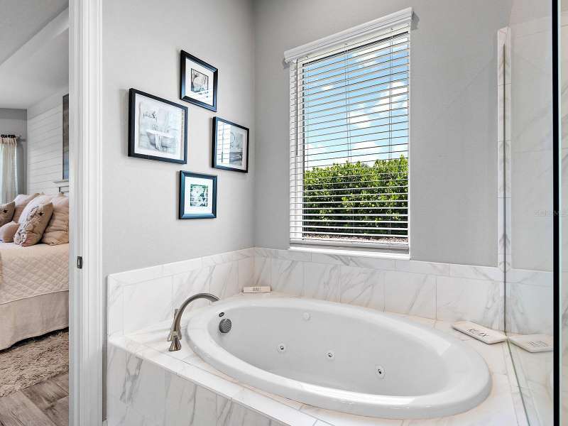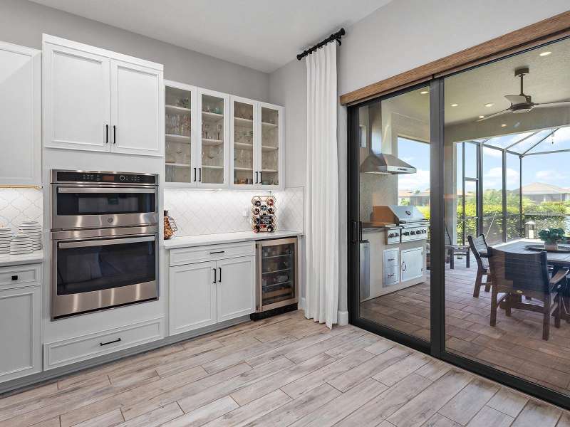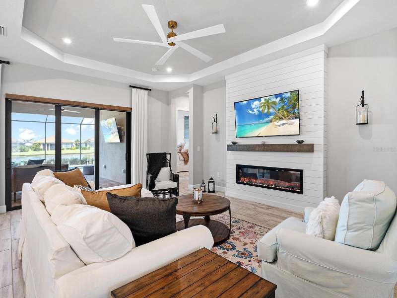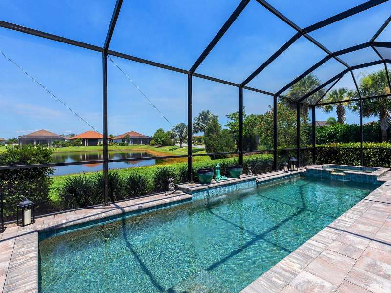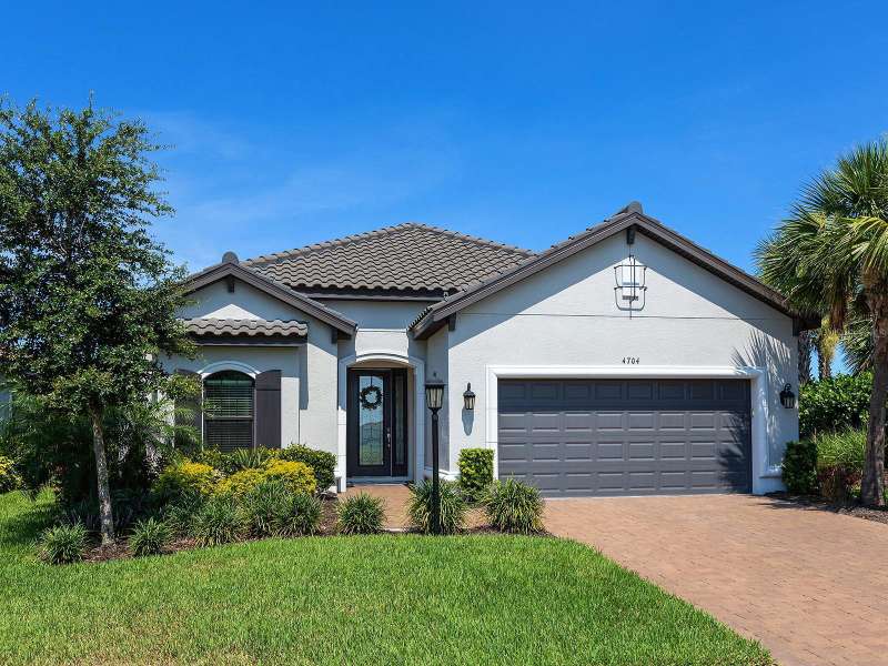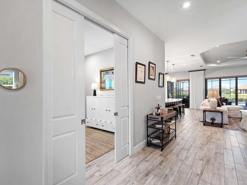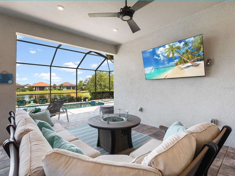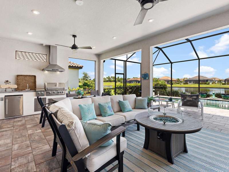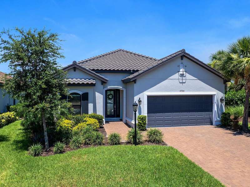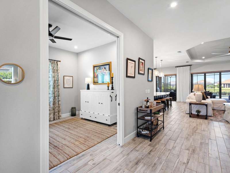 This GOLF DEEDED HOME has a full GOLF MEMBERSHIP INCLUDED! You will love this extended Lazio floor plan with upgraded lakeside living in amenity-rich Esplanade at Azario in Lakewood Ranch. With a spacious corner lot, extremely private landscaping, a desirable western exposure with picturesque sunsets over the lake every evening, and resort-style amenities at your fingertips, you will never want to leave this beautiful home. Recently constructed in 2022, this Taylor Morrison home offers exceptional upgrades beyond the builder basics in an extended floor plan with 2,375 SF of living space in an open and modern floor plan, and is also outfitted with impact windows and doors throughout. The interior boasts a modern and comforting ambiance with wood-look porcelain tile plank flooring, cool and inviting color palette, designer light fixtures, and wood and metal embellishments. The central entertaining area has a flexible great room and dining room space, ideal for family gatherings, entertaining, and daily living. The great room includes a custom shiplap feature wall, wood mantle, electric fireplace, contemporary ceiling fan, and impact sliding doors to the lanai. Chef’s will delight in the executive kitchen equipped with two-tone cabinetry with modern pulls, Quartz counters, farmhouse sink and prep sink both with brushed gold faucets, tile backsplash, walk-in pantry, and high-end stainless steel appliance suite. The kitchen space also features a custom-built wine bar with display cabinets and wine refrigerator. There is also enough space to add a bistro or café table with lake view for more dining and entertaining options. Additional impact sliders lead out to the paver lanai where a spacious covered entertaining space offers room for relaxing and dining next to the outdoor kitchen with stainless steel grill, separate burner, and bar fridge. The lap-style saltwater pool and spa has a waterfall feature and is gas heated so it can be enjoyed year-round. The immaculate details and comforting spaces continue into the primary suite with a feature wall of white shiplap and warm wood, geometric tray ceiling, and seating area overlooking the lake. The en-suite bathroom includes marble-look tile, a jetted soaking tub, walk-in shower with multiple shower heads and bench, dual sinks on a long vanity, and walk-in closet. Guests will enjoy two spacious guest bedrooms, one of which has an en-suite bathroom. Complementing the other fine features, you’ll find a private study with double pocketing doors, functional laundry room, and 2-car garage. Located just a 5-minute walk from the second amenity center, you are steps away from a lakeside resort-style pool, dog park, clubhouse, and community garden. The main amenities campus is just over 1 mile away featuring the main clubhouse, 18-hole golf course, restaurants, resort-style pool with Bahama Bar, tennis and pickleball courts, aqua driving range, golf pro shop, wellness center with spa service, robust calendar of social events and more. Lakewood Ranch is the top multi-generational community in the country for seven years in a row with plentiful shopping, dining, A-rated schools, parks, and nearby beaches