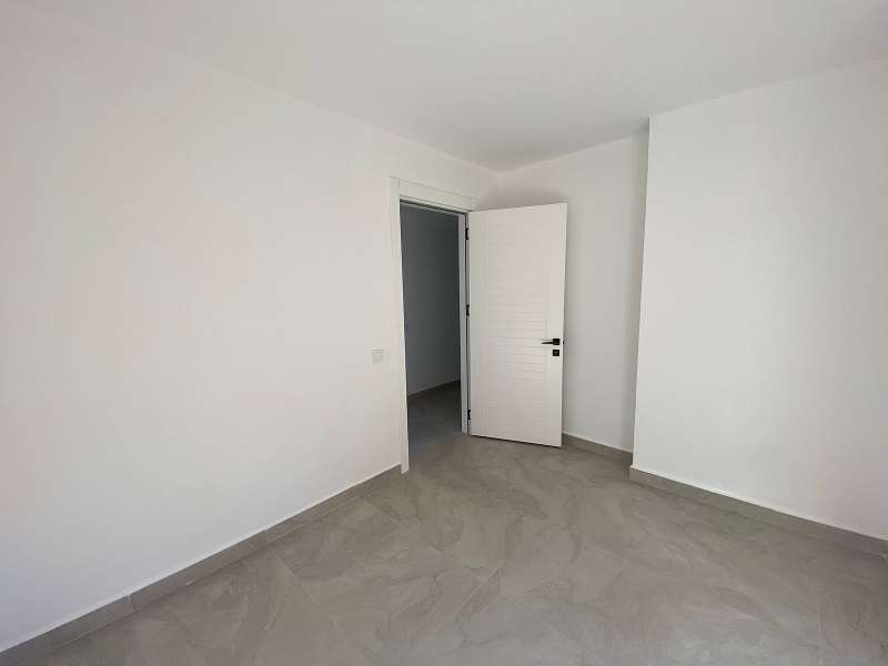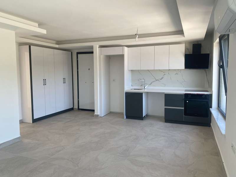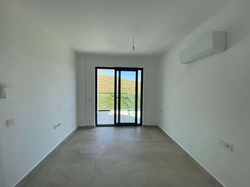 The apartment for sale in Bodrum Turkey consists of a living room, open-plan kitchen, two bedrooms, a balcony, and a terrace.
