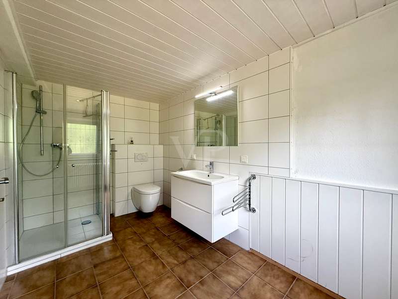 This charming home with flair is located right on the edge of a nature reserve. If you are looking for absolute peace and quiet and prefer the view of the surrounding greenery to urban living, you will be delighted with this home. You enter your new home on the upper floor via a large entrance hall, from here you enter the open-plan living and dining area with fireplace, which adds to the special ambience of this room. You can enjoy the sublime view of the treetops and the surrounding nature reserve. An approx. 22 m² renovated balcony invites you to relax and barbecue. The kitchen is separate and has built-in cupboards, a fridge and a dishwasher. An opening to the living room is possible. The private area has two bedrooms and a large daylight bathroom. A guest WC is available in the entrance area. The first floor houses two further, comfortably furnished bedrooms and a modernized shower room. A spacious, covered natural stone terrace in Mediterranean style is pleasant on warm summer days. A small garden area allows for the installation of children's attractions. A garage is part of the offer. We look forward to hearing from you.