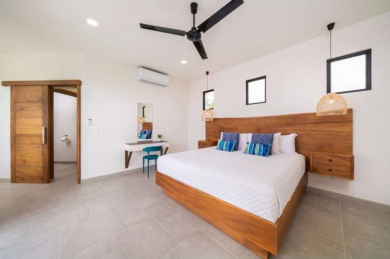 Step inside to an elegant open-concept layout with a gourmet chef's kitchen, custom teak cabinetry, stainless steel appliances, and porcelain tile floors. Each of the six spacious bedrooms features a full ensuite bathroom, ensuring privacy and comfort for guests or family. The home's tropical contemporary design blends natural materials with modern finishes to create a warm, bright, and inviting space.