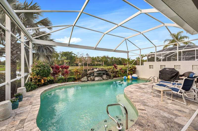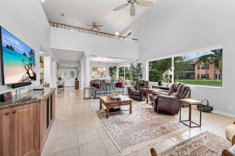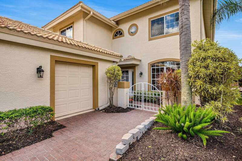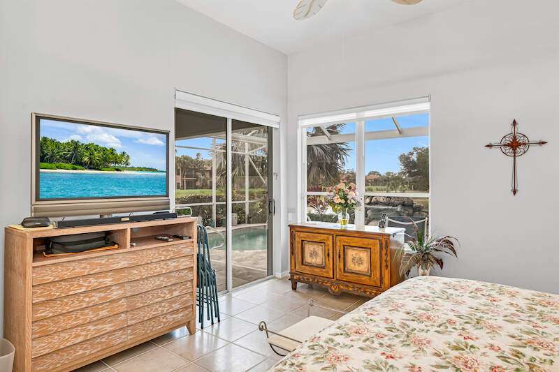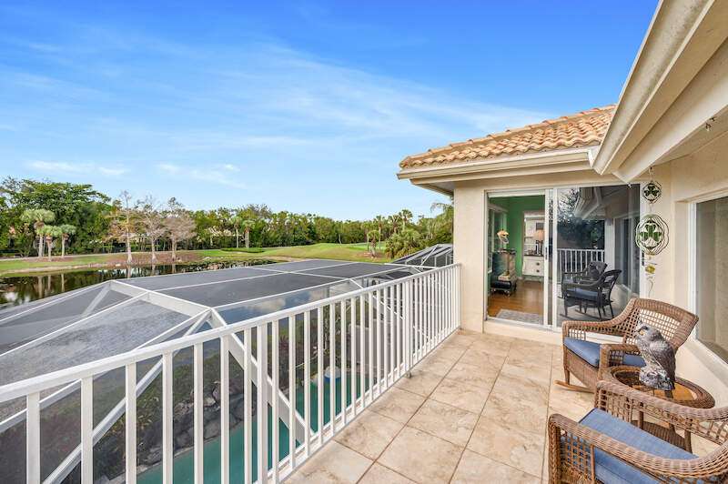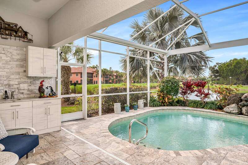 Truly unique and rarely available "Aberdeen" with an additional bonus room ensuite! This is the largest version of this in demand floor plan in The Strand. Impressive, spacious detached villa home boasting a newer roof (2019), power storm protection on the lanai, dedicated golf cart garage bay, and spectacular Western water and golf course views. The property features four true bedrooms, with one being a grand bonus room ensuite. There is also a den with built in shelving, and a large loft space. This home is one of very few in the community with its own private elevator!! There's also a glamorous tiled open terrace area off of the second-floor bonus room overlooking the pool and view. You'll quickly fall for this stately property with no home immediately to the left. It is the first home on Persimmon Way, and boasts large windows on the Southern side of the home, allowing the home to be beautiful and bright throughout the day. The rear sliders pocket into the living room wall for a feeling that the living space extends seamlessly outdoors during our beautiful winters. The entire pool area/outdoor space has been extensively updated. The pool decking and pool coping match nicely. The outdoor cabinetry has been updated to create a fresh and bright look. Enjoy an active country club lifestyle, complete with 3 beautifully maintained 9-hole golf courses, tennis, pickleball, all new fitness center, and an impressive pool with lap lanes, newer bocce courts, as well as a recently added croquet center and Island Bar for residents to enjoy. The clubhouse next door to the Jr. Olympic pool houses two upscale restaurants: one upstairs, and the downstairs Tavern 59 restaurant opens into botanical garden/outdoor wedding venue location. The Strand is a golf cart friendly community, and has recently added more dedicated golf cart parking spaces near to the 4 new brand new pickleball courts. Many shopping and dining conveniences are within close proximity, and most importantly, the sugar sand beaches of the Gulf are a straight shot westbound down Immokalee Rd.
