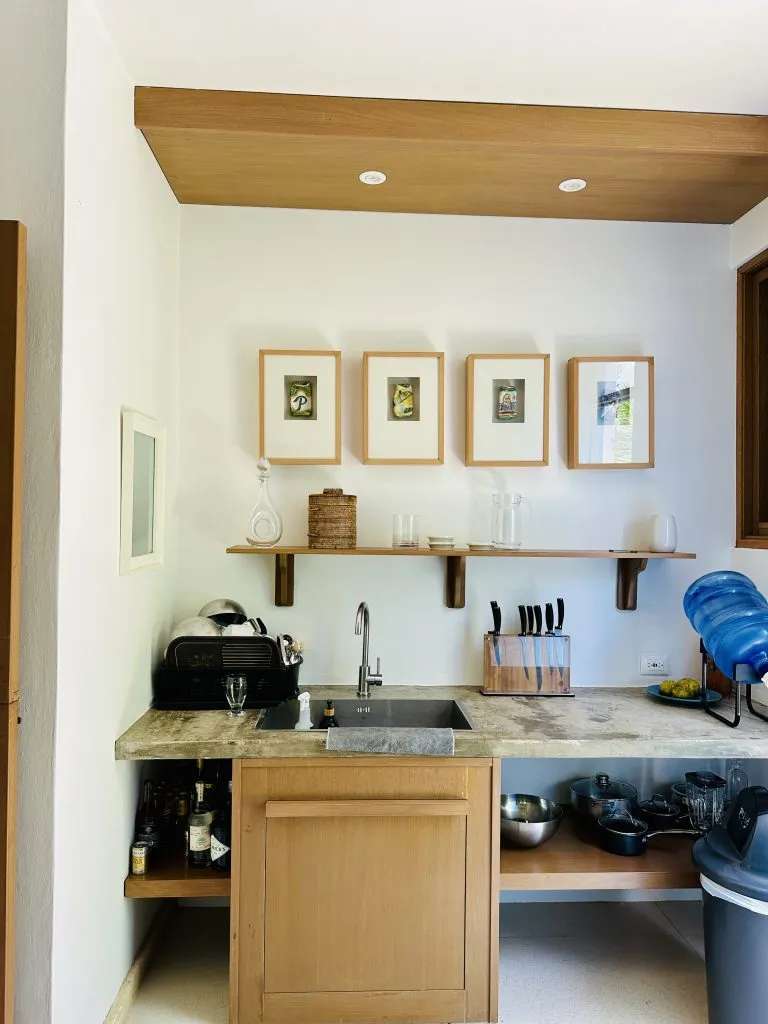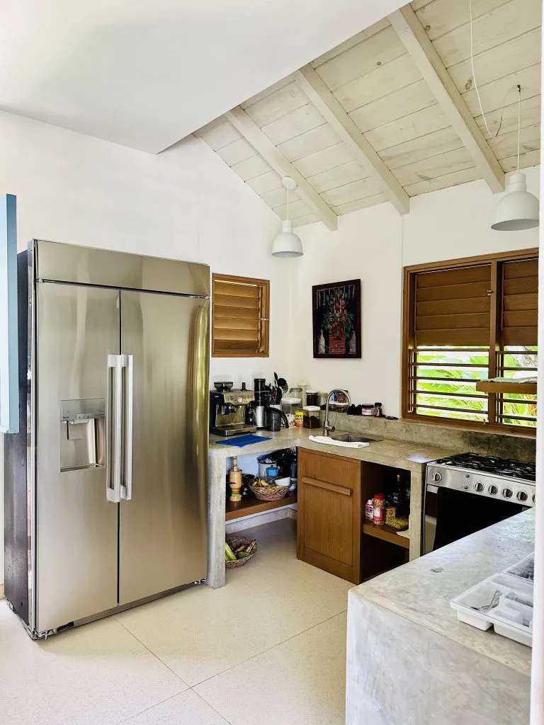 A modern practical kitchen features exquisite appliances. The living room has high ceilings and comfortable seating areas and is connected with the dining area and opens onto a large terrace overlooking the pool & the ocean.