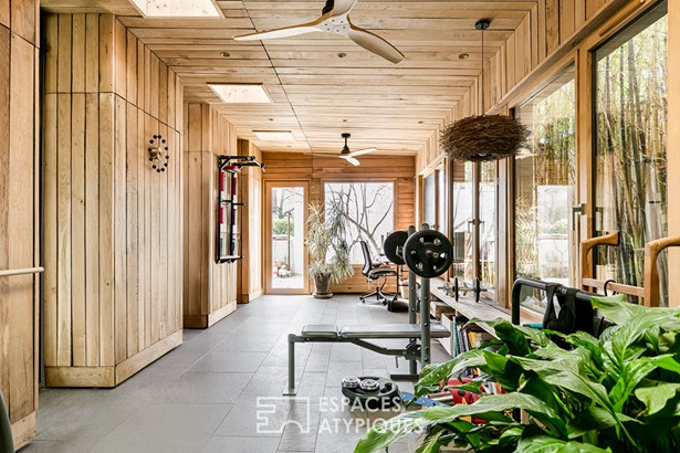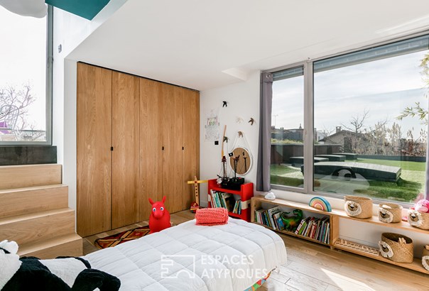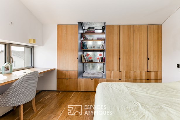 A laundry area and a separate toilet complete this level. The floors are dedicated to rest. On the first floor, a second bathroom with toilet separates two bright bedrooms. One of them offers access to a terrace and its vegetable garden. The second and last floor serves the fourth bedroom overlooking the garden. All the bedrooms; as well as the living room, are equipped with custom-made fitted cupboards. The outdoor space has been entirely landscaped and designed to offer an island of freshness. Its terrace, in the center of the garden, is a true haven of peace. Insulation by the roof and walls (wood fiber, larch) Fans / air conditioning on the top floor Wood stove Parking within the plot In the immediate vicinity of transport, schools and shops