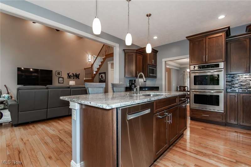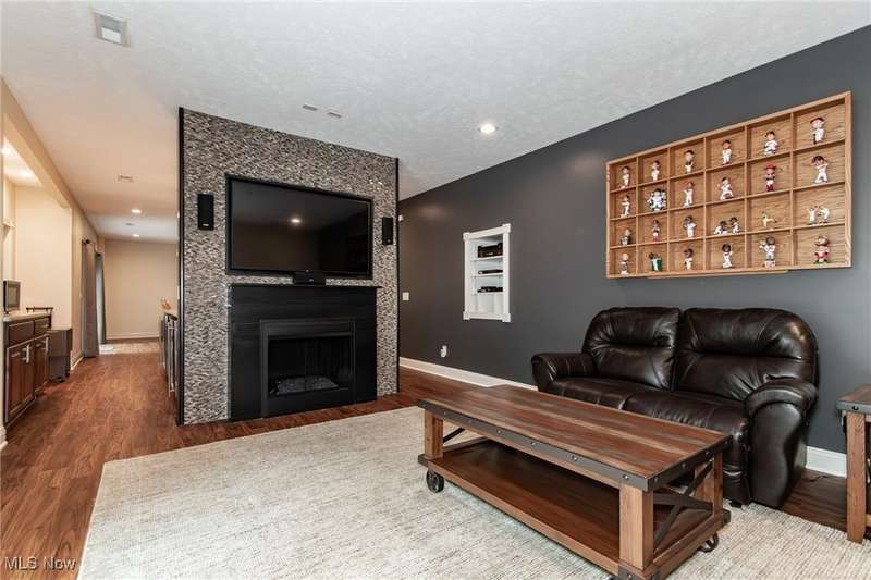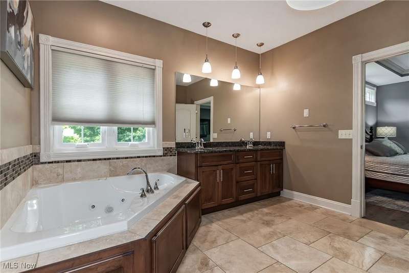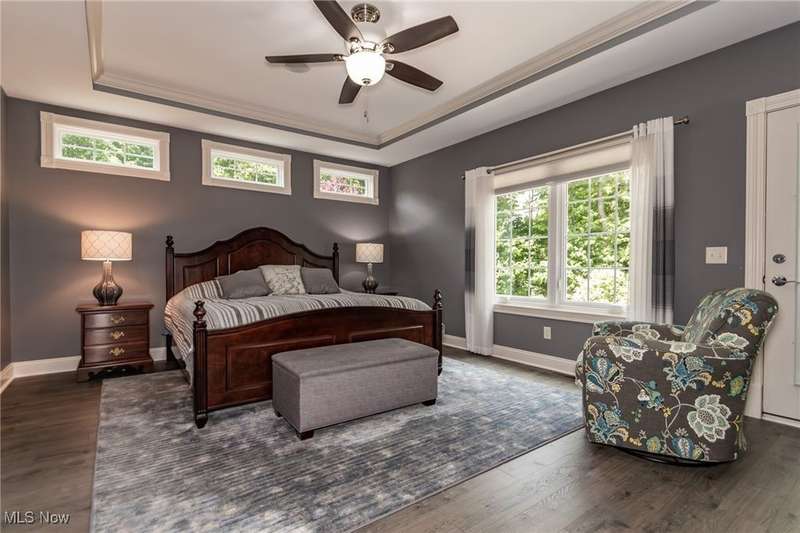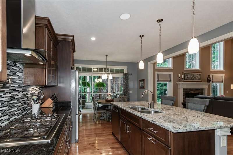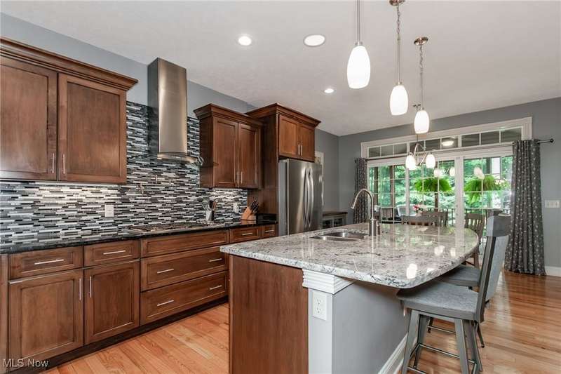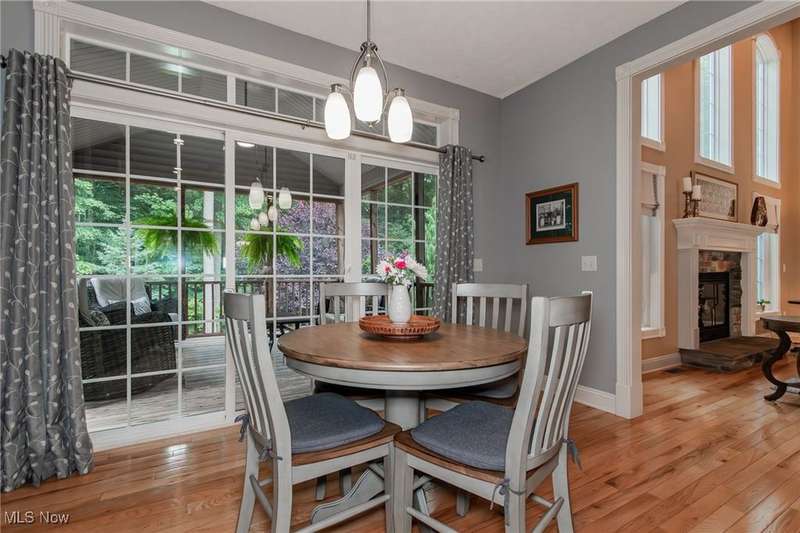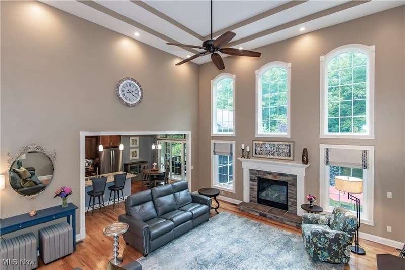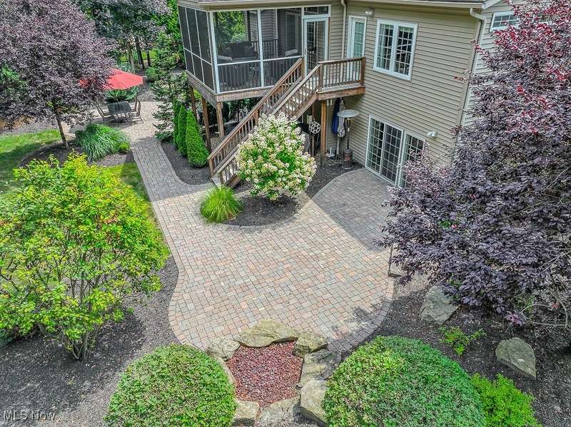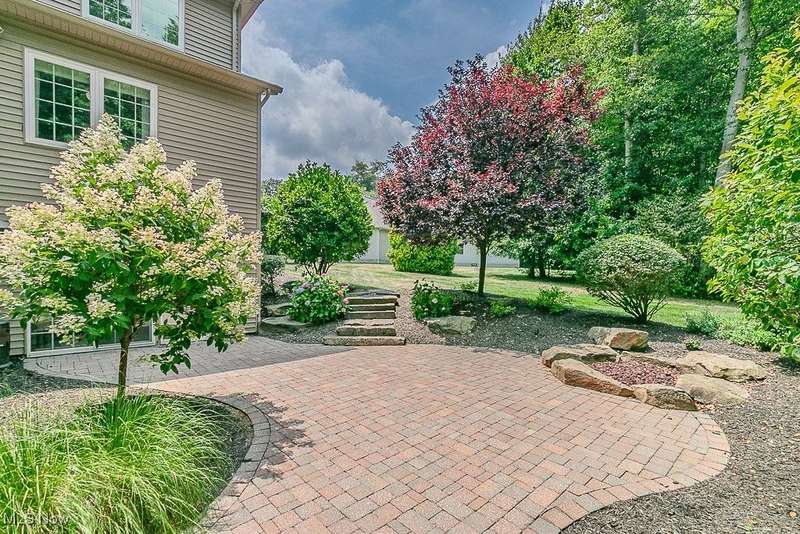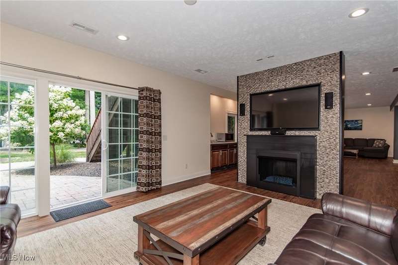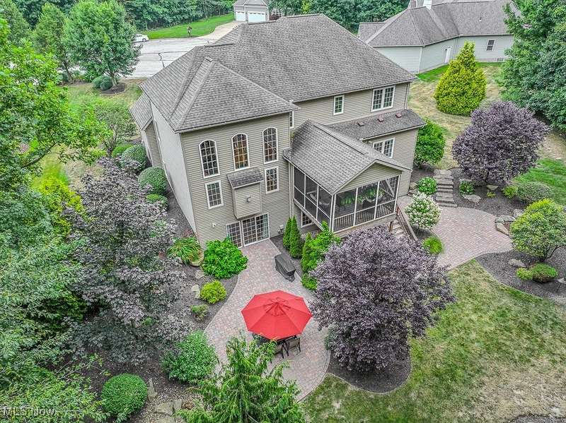Gorgeous contemporary home with 1st floor primary bedroom and 1st floor den nestled on a beautiful one acre culdesac private lot. 4871 sqft of living space with open floor plan and soaring ceilings will entice you to call this your dream home! The first floor is impressive with a 2 story great room with fireplace, chef's kitchen with granite counters, large island/breakfast bar, walk-in pantry, double ovens, and spacious eat-in area that leads to the screened-in porch. The primary bedroom has private entrance to the porch and is stunning with high ceilings, luxurious bath with custom tiled shower, soaking tub and custom walk-in closet with extra vanity area. The formal dining room, den, half bath, and laundry complete the first floor. The second level comes complete with 4 spacious bedrooms each connected to full baths. You'll love entertaining in the walk-out lower level with spacious family room with fireplace, media space, wet bar with 2 beverage coolers, full bath, 2nd den or possible 6th bedroom, and large storage area with walk-up to the 3 car garage. 2 sets of sliders lead to 2 patio areas, gas plumbed fire pit and a peaceful water fountain all surrounded by private tree buffer for privacy. The whole house sound system is included and enhances the entertaining experience! You won't be disappointed to see this incredible home!