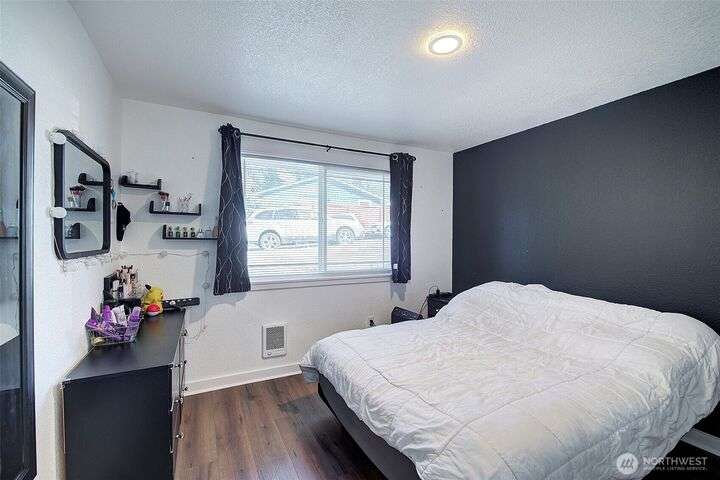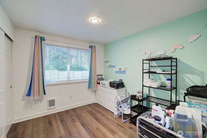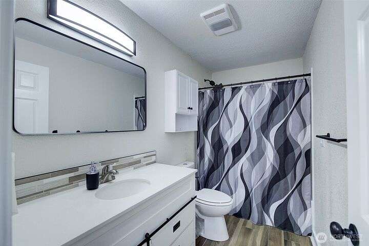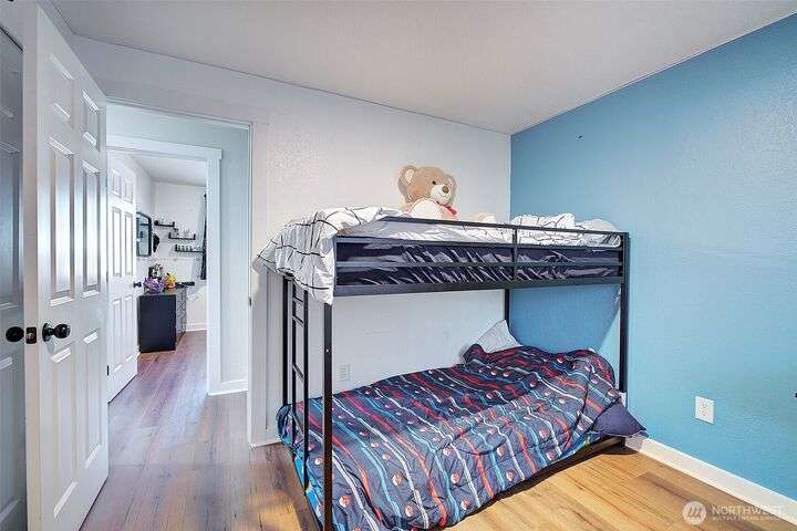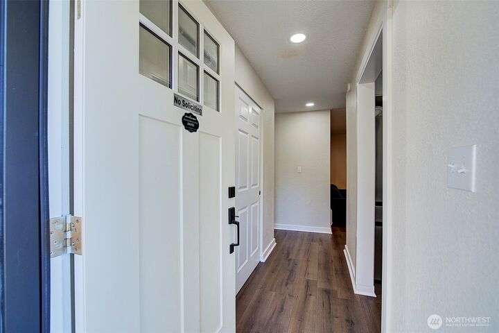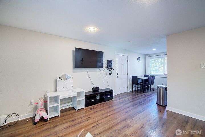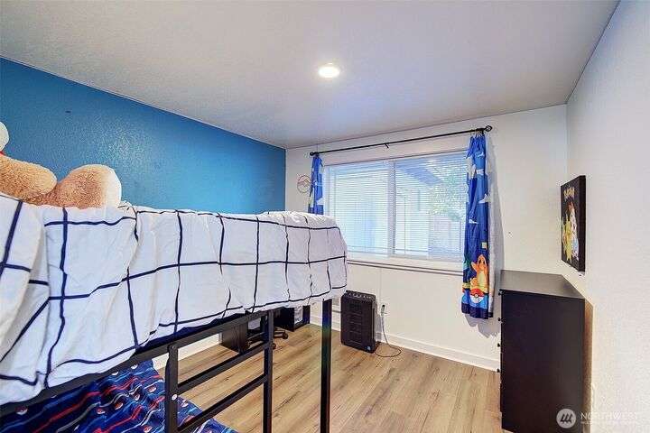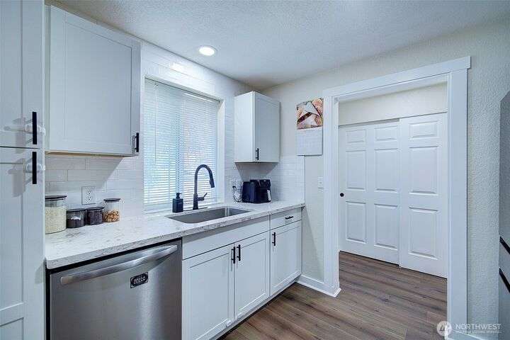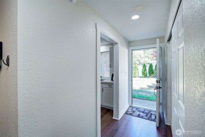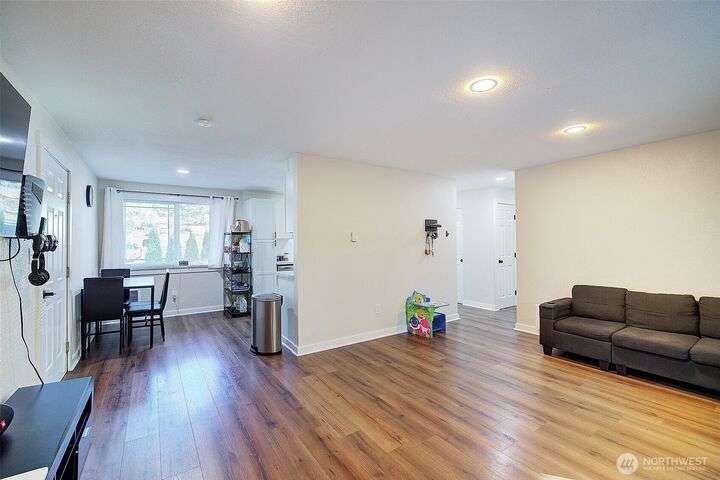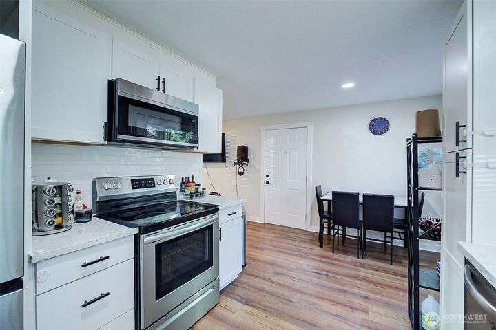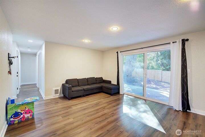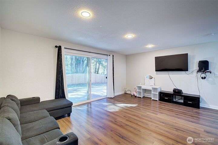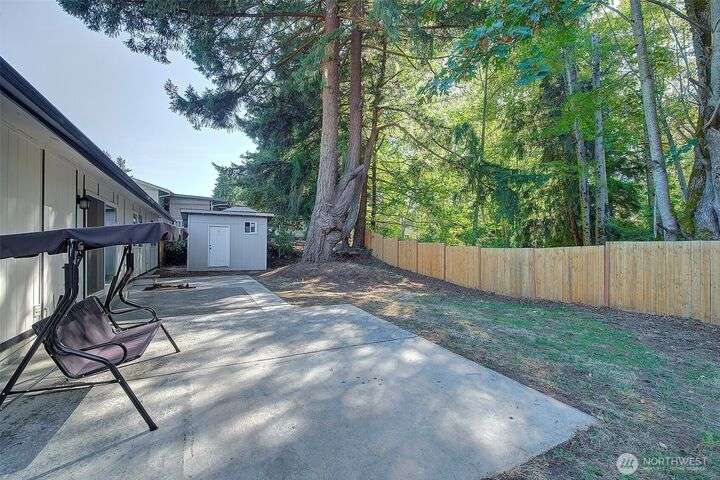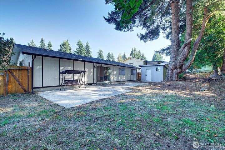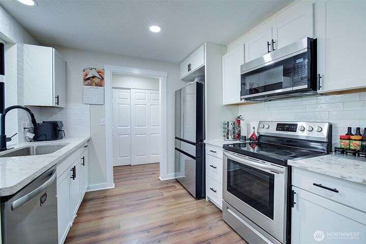 Nestled on a serene greenbelt lot just blocks form Bradley Lake Park. This stunning 2023 remodel blends style and convenience. The kitchen shines with Shaker cabinets, quartz counters, tile back splash and stainless appliances. Enjoy 3 spacious bedrooms with ample storage, plus a beautifully updated bathroom. Every detail has been refreshed- roof gutters, windows flooring,mil work fencing, landscaping and more. Finished garage offers room for hobbies or toys .. Ideally located minutes to freeways, schools,dining., Wild Wood Park and Pierce College. Come make this house your home!