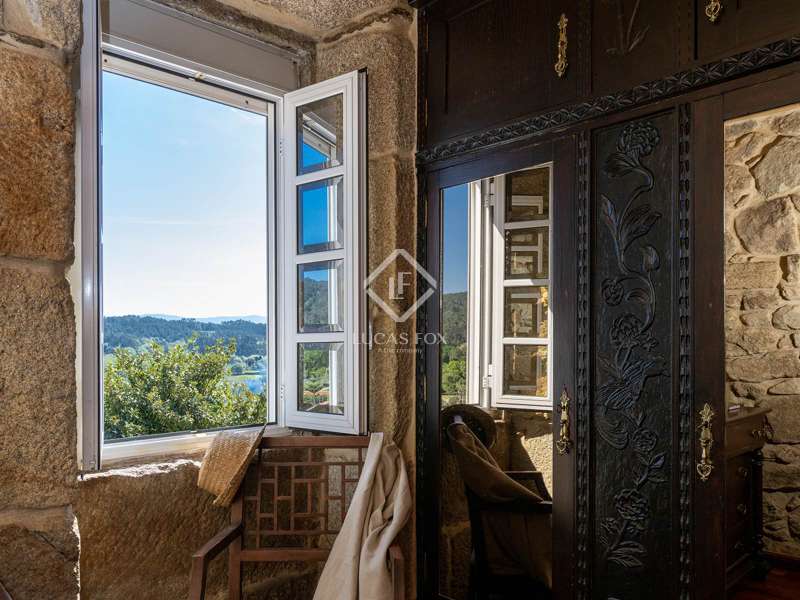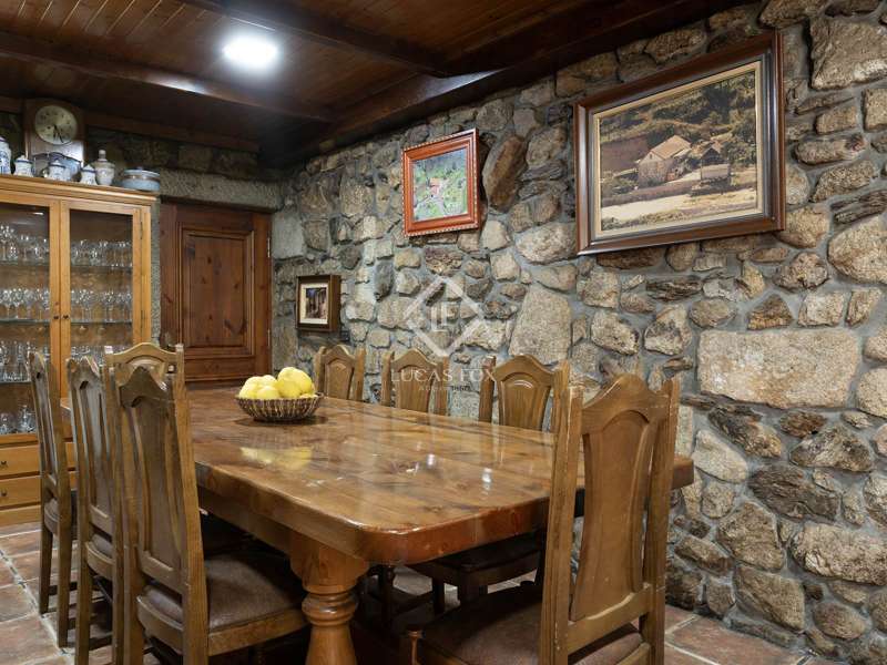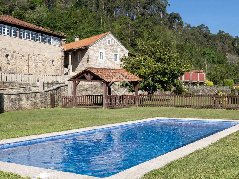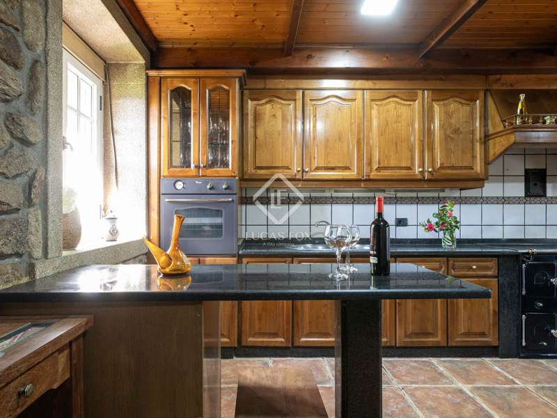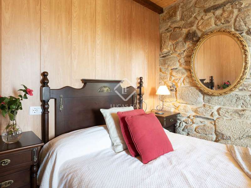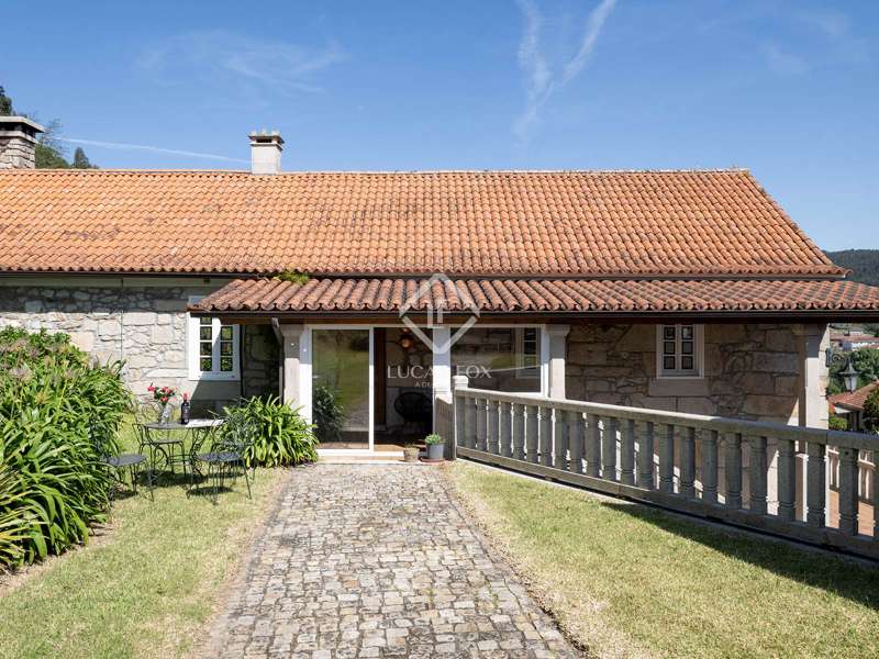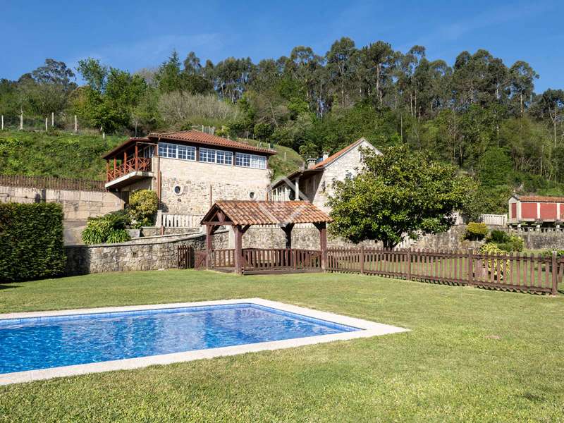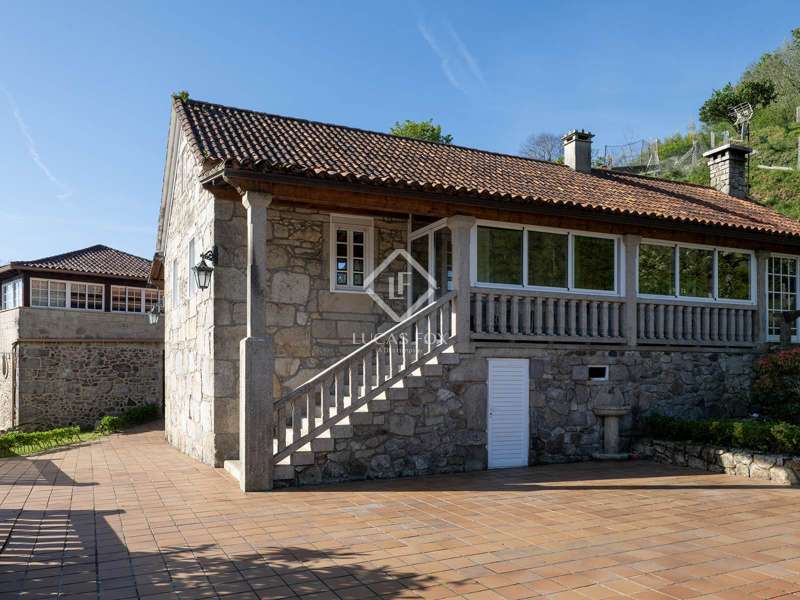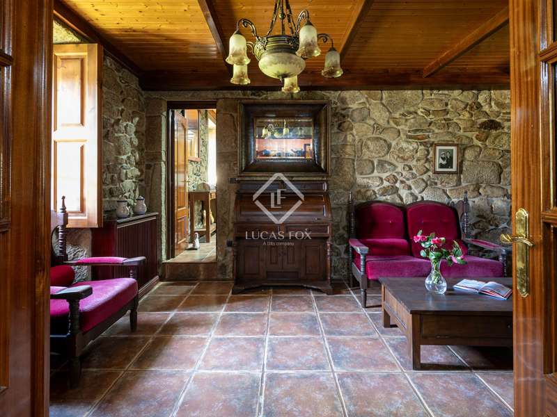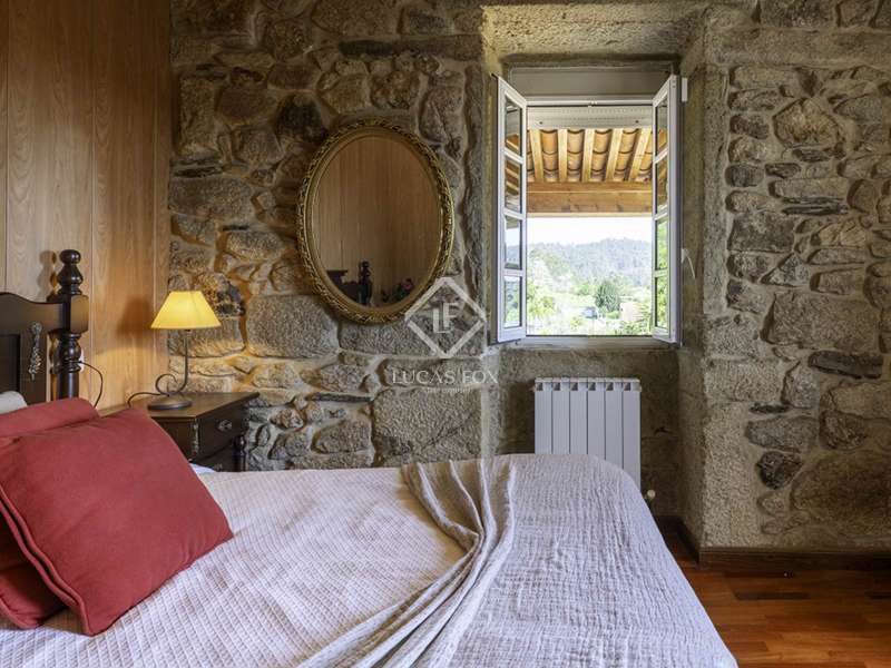 Lucas Fox offers for sale a magnificent Galician rustic style property consisting of a three-bedroom dwelling and a guest house, both built with thick stone walls with a total surface area of 400 m². The plot of land measures just over one hectare and offers beautiful views over the rural landscapes of Barrantes, in Tomiño-Pontevedra. The property is very easily accessed from the road and has ample parking space for several vehicles. The main building is a typical modern rustic construction, with a long corridor connecting the day area to the left and the bedrooms to the right. As soon as we enter the house, we find an open-plan kitchen with a dining area. On the other side of the corridor is a spacious living room, which in turn leads to three bedrooms. The rooms are ample and have windows with fabulous views of the rolling hills of Barrantes. The day area is connected to a large gallery which is full of light and looking towards the rear of the property. The property has a comfortable guest house built on two levels. The ground floor has a cosy bedroom and bathroom with beautiful stone walls. The upper level has large windows all around the perimeter, which makes it the perfect viewpoint for a privileged scenery. The plot is very large and mostly flat, although there are elevated areas where the owners' goats graze. In a large, terraced section there is a swimming pool which enjoys almost 360º views of the surrounding countryside. This property is unique and would be ideal for a couple with children looking for a peaceful life close to nature. Do not hesitate to contact us for more information.