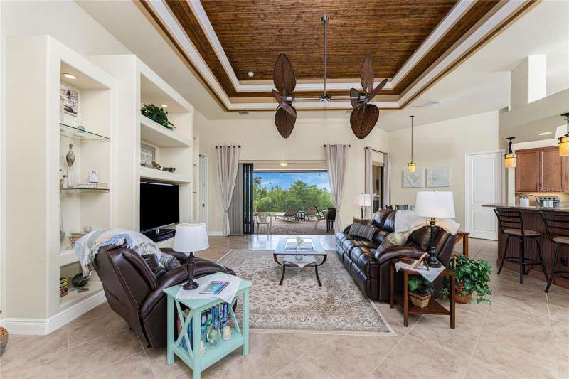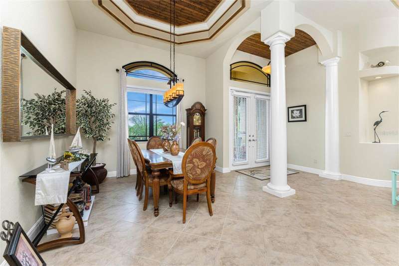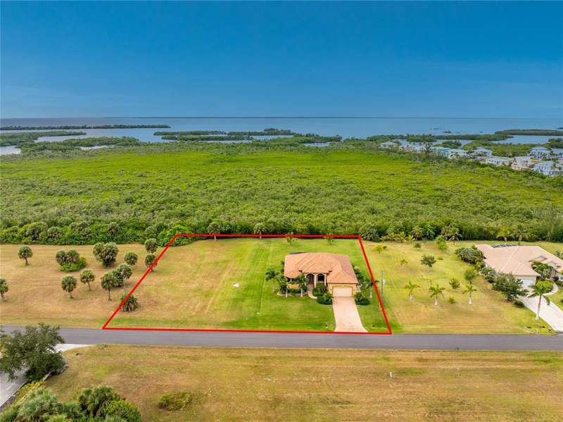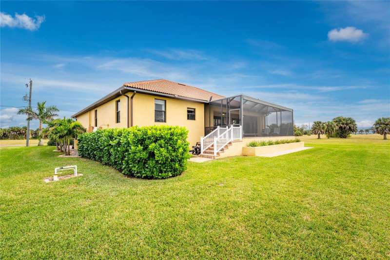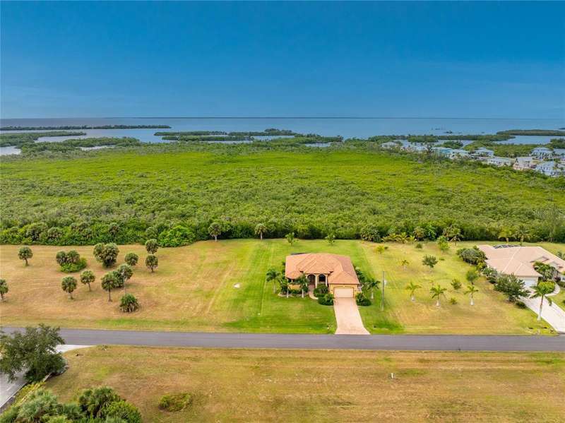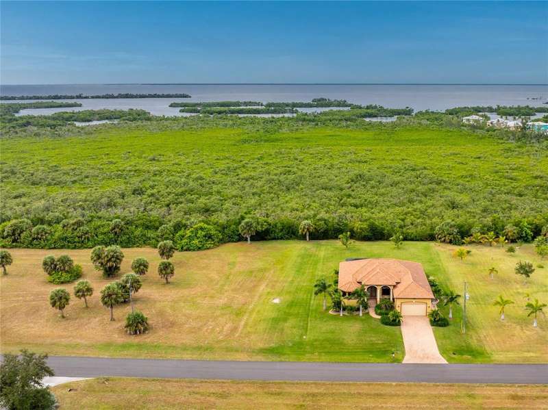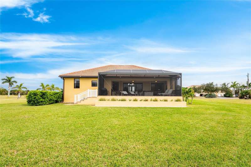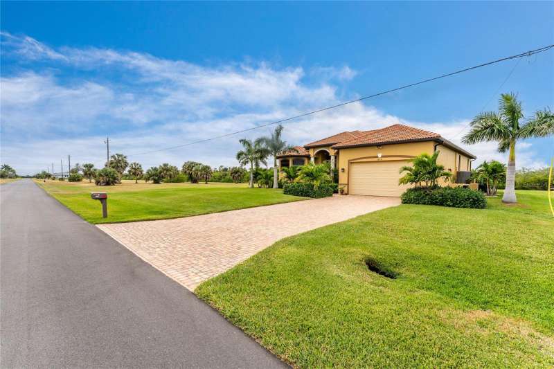 Welcome to this exceptional custom residence, where craftsmanship, architectural elegance, and refined design converge to create a timeless appeal. Perfectly situated on nearly an acre of manicured grounds, this home offers the ideal combination of privacy, sophistication, and comfort. Classic curb appeal and lush landscaping set the tone. Through etched glass French doors topped with a transom window, you enter a grand foyer of architectural beauty. Decorative columns frame the open Great Room—a breathtaking space for both entertaining and relaxed living. The Great Room features 14’–16’ custom double tray wainscot ceilings with crown molding, Fanimation ceiling fan, and 8’ triple sliding glass doors that fill the space with natural light and open to the lanai. The private, park-like setting beyond offers lush landscaping and mature palms, creating a tranquil backdrop. Throughout the home, 8’ doors and detailed trim add to the quality finishes. The gourmet kitchen is a chef’s delight—beautiful and functional with granite countertops, tumbled stone backsplash, and 42” wood cabinetry providing abundant storage. The GAS STOVE and GE fingerprint-resistant stainless-steel appliances make cooking a pleasure. A spacious breakfast bar with pendant lighting invites casual dining, while the full-wall 11’ x 7’ pantry adds both charm and organization. The adjacent dining area, bathed in natural light, is perfect for everyday meals or formal occasions. The Primary Suite offers a serene retreat with a custom wainscot ceiling, crown molding, chair rail, and dual walk-in closets. The spa-inspired ensuite bath features dual sinks, a built-in dressing table, soaking tub framed by three arched windows, and a step-in shower with bamboo-etched glass and a built-in seat. The guest wing includes two spacious bedrooms with 10’ ceilings and 8’ doors, plus a beautifully appointed bath with granite vanity, linen closet, and a large walk-in shower. Outdoor living is accentuated, offering an expansive covered lanai and paver deck, fine mesh solar screen cage with a picture window screen that really lets you take in the manicured backyard. Ceiling fans and drop-down sunshades make this the perfect spot for morning coffee and evening relaxation. The backyard includes a built-in planter and a paver walkway. Additional features include hurricane impact windows and doors, a deep garage with 13’ high ceiling and 9’ high door and epoxy floor, 2020 5-ton variable-speed A/C, and an irrigation well servicing both lots. From the meticulous craftsmanship to the thoughtful layout, this home perfectly embodies excellence—offering a luxurious yet livable Florida lifestyle. Burnt Store Lakes residents enjoy public water/sewer, a community park with covered picnic areas, playground, and restrooms, plus a kayak ramp accessing Charlotte Harbor and its incredible wildlife—manatees, porpoises, sea turtles, and abundant game fish. Adjacent Burnt Store Marina offers a full-service deep-water marina, restaurants open to the public, golf, and optional dockage. Just a short drive to Downtown Punta Gorda or Cape Coral, this location provides the best of Southwest Florida living. Experience the perfect blend of luxury, comfort, and natural beauty—this is Florida living at its finest.