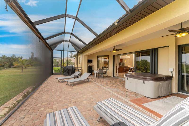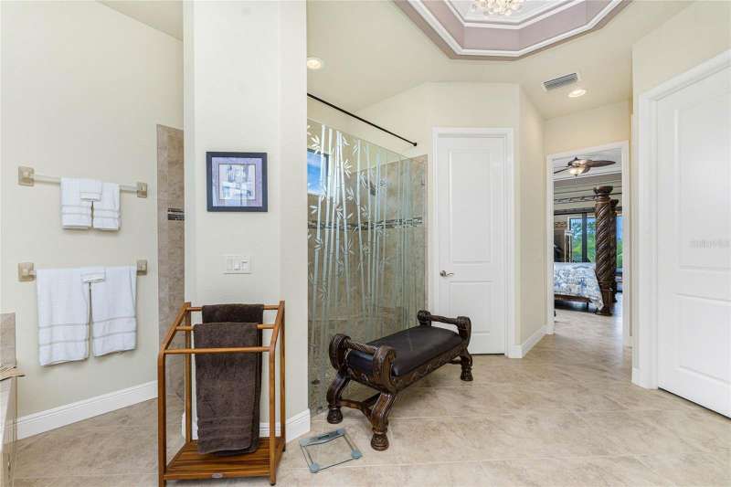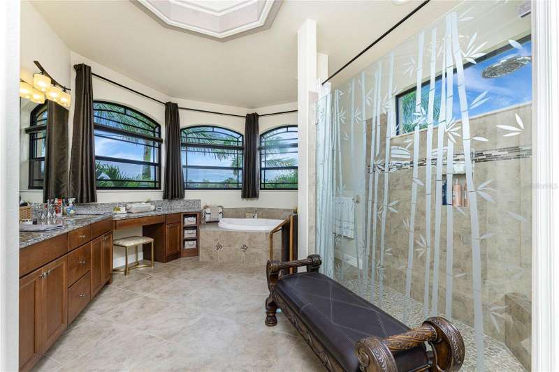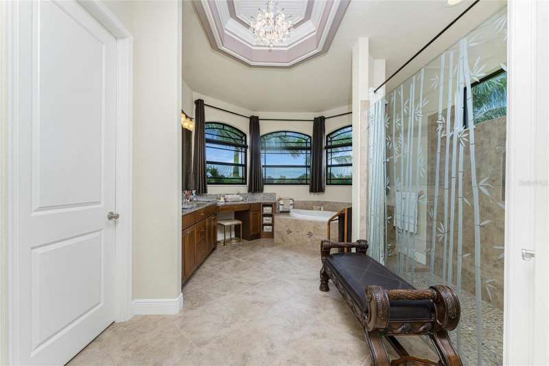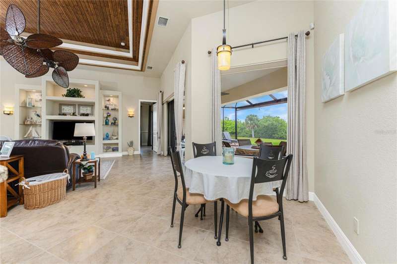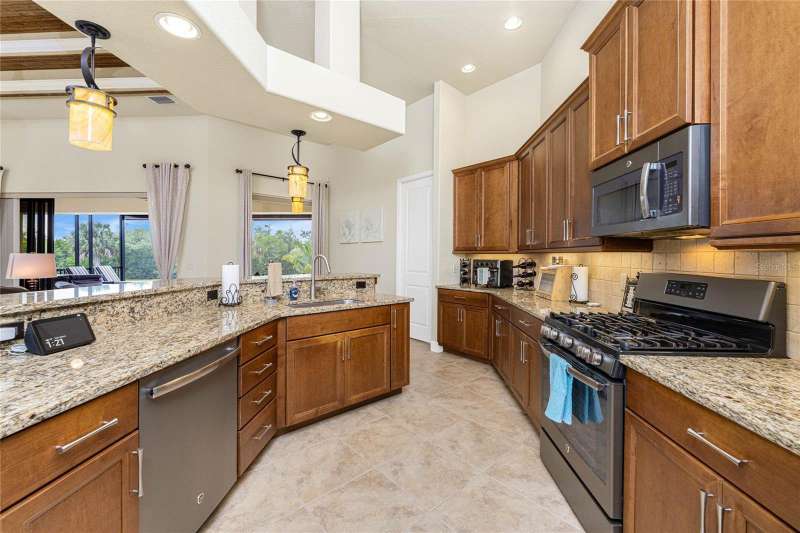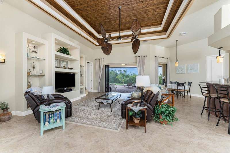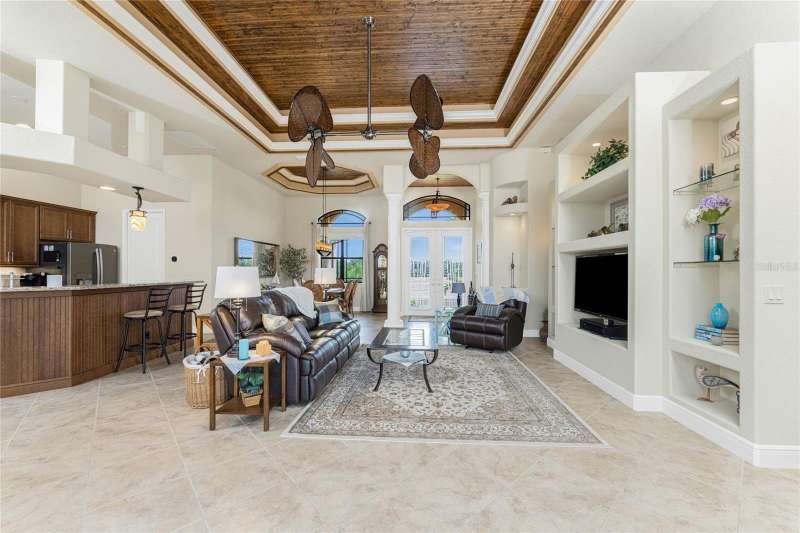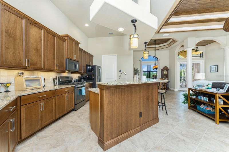 Welcome to this exceptional custom residence, where craftsmanship, architectural elegance, and refined design converge to create a timeless appeal. Perfectly situated on nearly an acre of manicured grounds, this home offers the ideal combination of privacy, sophistication, and comfort. Classic curb appeal and lush landscaping set the tone. Through etched glass French doors topped with a transom window, you enter a grand foyer of architectural beauty. Decorative columns frame the open Great Room—a breathtaking space for both entertaining and relaxed living. The Great Room features 14’–16’ custom double tray wainscot ceilings with crown molding, Fanimation ceiling fan, and 8’ triple sliding glass doors that fill the space with natural light and open to the lanai. The private, park-like setting beyond offers lush landscaping and mature palms, creating a tranquil backdrop. Throughout the home, 8’ doors and detailed trim add to the quality finishes. The gourmet kitchen is a chef’s delight—beautiful and functional with granite countertops, tumbled stone backsplash, and 42” wood cabinetry providing abundant storage. The GAS STOVE and GE fingerprint-resistant stainless-steel appliances make cooking a pleasure. A spacious breakfast bar with pendant lighting invites casual dining, while the full-wall 11’ x 7’ pantry adds both charm and organization. The adjacent dining area, bathed in natural light, is perfect for everyday meals or formal occasions. The Primary Suite offers a serene retreat with a custom wainscot ceiling, crown molding, chair rail, and dual walk-in closets. The spa-inspired ensuite bath features dual sinks, a built-in dressing table, soaking tub framed by three arched windows, and a step-in shower with bamboo-etched glass and a built-in seat. The guest wing includes two spacious bedrooms with 10’ ceilings and 8’ doors, plus a beautifully appointed bath with granite vanity, linen closet, and a large walk-in shower. Outdoor living is accentuated, offering an expansive covered lanai and paver deck, fine mesh solar screen cage with a picture window screen that really lets you take in the manicured backyard. Ceiling fans and drop-down sunshades make this the perfect spot for morning coffee and evening relaxation. The backyard includes a built-in planter and a paver walkway. Additional features include hurricane impact windows and doors, a deep garage with 13’ high ceiling and 9’ high door and epoxy floor, 2020 5-ton variable-speed A/C, and an irrigation well servicing both lots. From the meticulous craftsmanship to the thoughtful layout, this home perfectly embodies excellence—offering a luxurious yet livable Florida lifestyle. Burnt Store Lakes residents enjoy public water/sewer, a community park with covered picnic areas, playground, and restrooms, plus a kayak ramp accessing Charlotte Harbor and its incredible wildlife—manatees, porpoises, sea turtles, and abundant game fish. Adjacent Burnt Store Marina offers a full-service deep-water marina, restaurants open to the public, golf, and optional dockage. Just a short drive to Downtown Punta Gorda or Cape Coral, this location provides the best of Southwest Florida living. Experience the perfect blend of luxury, comfort, and natural beauty—this is Florida living at its finest.