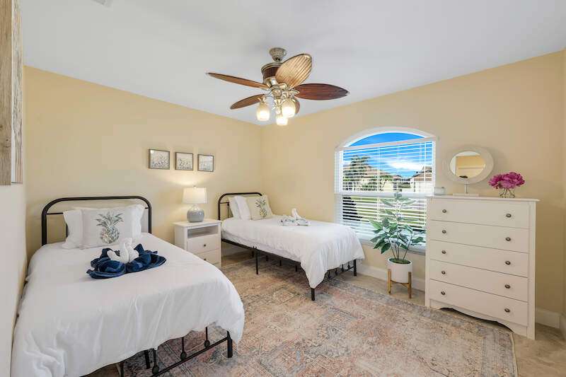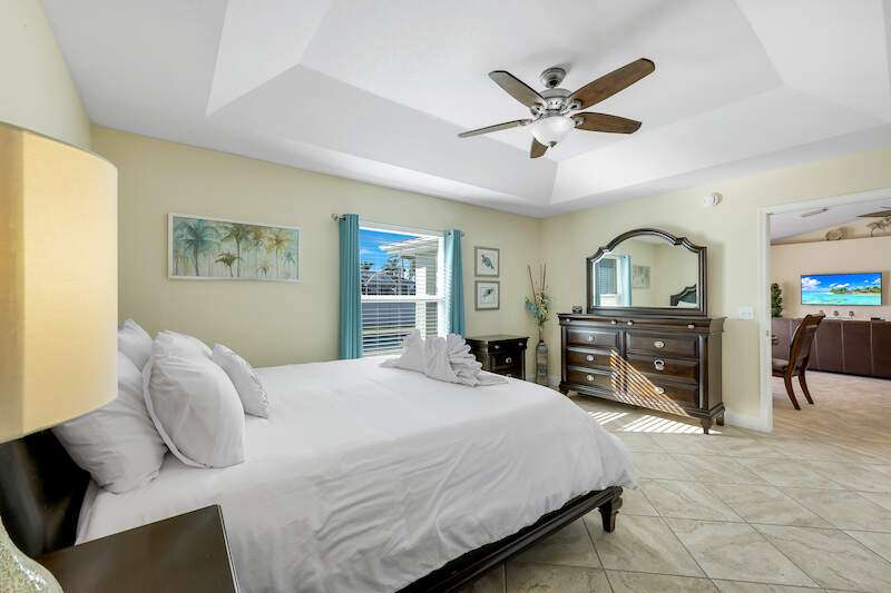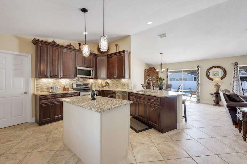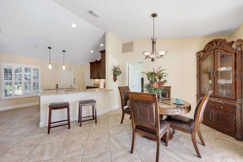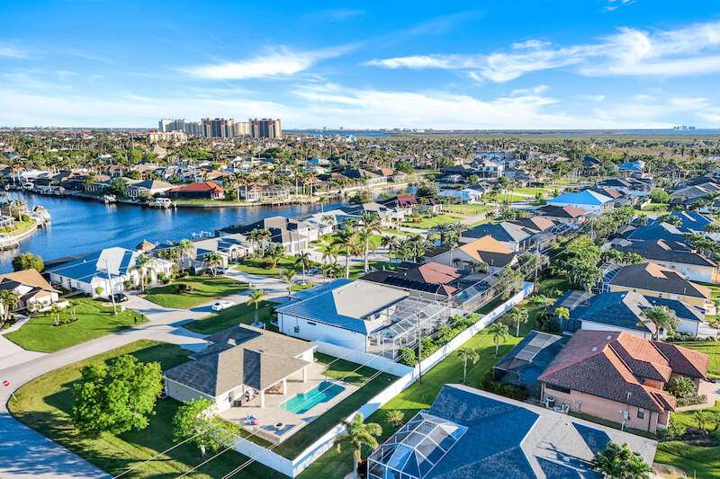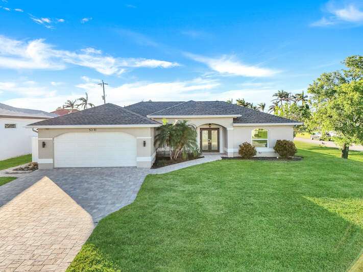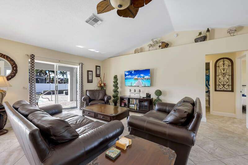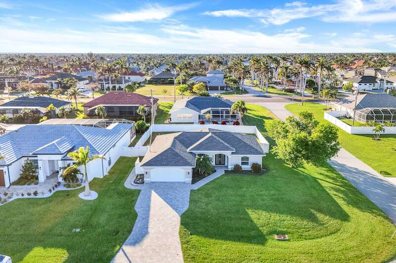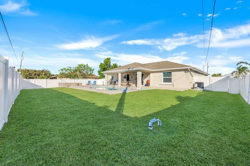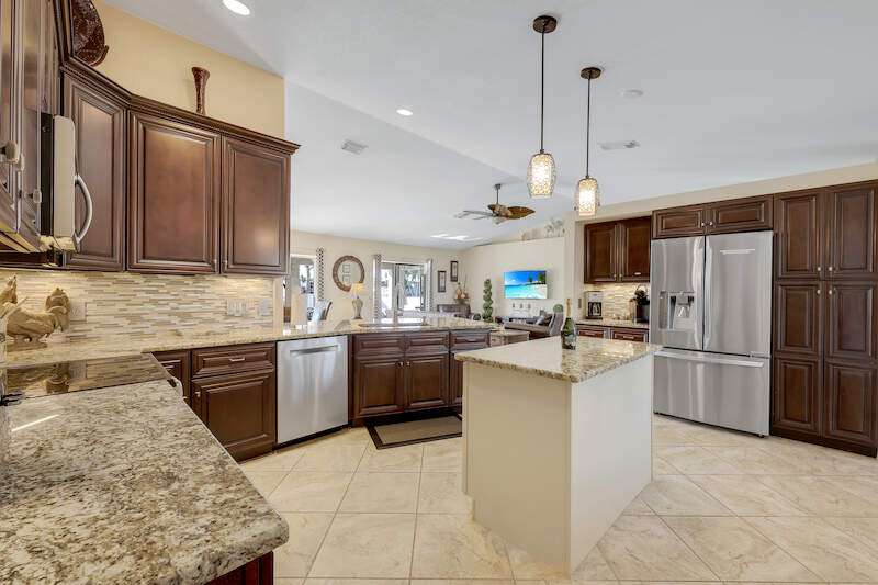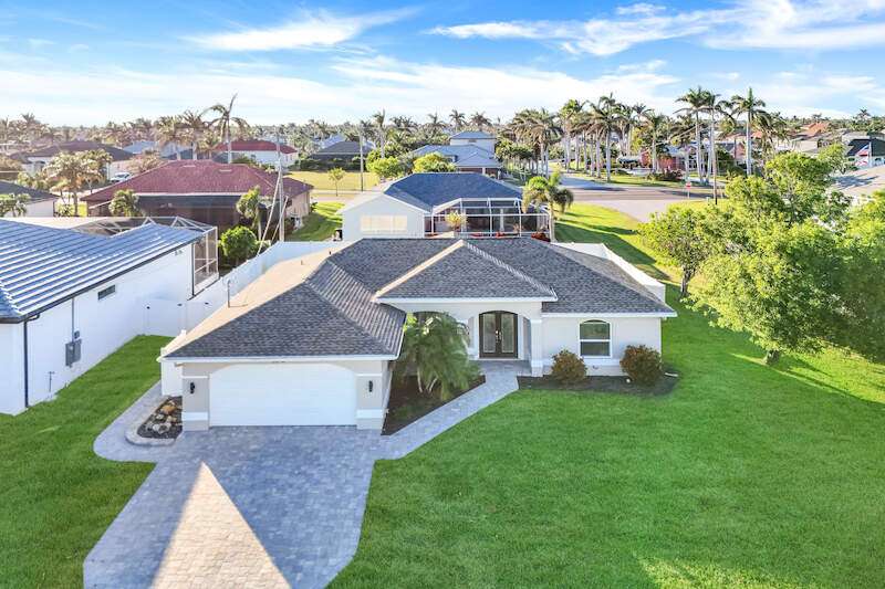 Beautifully Updated Pool Home Near Cape Harbour - Sold Turnkey! Experience the perfect blend of comfort and style in this beautifully updated pool home. Nestled on an oversized, fenced corner lot with sought-after western exposure, this property offers breathtaking sunsets to enjoy from your private backyard oasis. Relax by the heated saltwater pool, gather around the built-in firepit with custom seating, or entertain effortlessly in this serene outdoor setting. This home is currently a successful vacation rental, with flexible options to assume or cancel existing leases. Inside, you're greeted by soaring vaulted ceilings and a spacious, open floor plan. The kitchen is a chef's dream, featuring custom wood cabinetry, stainless steel appliances, granite countertops, under-cabinet lighting, a breakfast bar, and an island. The adjoining dining area and living room seamlessly extend to the pool area through pocket sliding glass doors, making indoor-outdoor living a breeze. The primary bedroom is a peaceful retreat, split from the two guest bedrooms for added privacy. It boasts a tray ceiling, a large walk-in closet, and an updated en-suite bath with dual sinks and a custom-tiled shower. The guest bedrooms share an equally stylish bathroom, complete with a vessel sink and a tiled tub/shower combination. Beautiful tile floors laid on the diagonal flow throughout the home, adding to its elegance. Located across from million-dollar gulf-access homes, this neighborhood offers an unbeatable lifestyle. Minutes to Cape Harbour's restaurants, shops, and marina, or a short drive to nearby shopping, banking, and healthcare. This property offers additional features, including no water intrusion, a transferable flood insurance policy, and IMPACT WINDOWS for peace of mind. Recent updates include a new roof and exterior paint in 2022, as well as a paver driveway and pool deck. Whether you're seeking a primary residence, a vacation retreat, or a short-term rental investment, this home checks all the boxes. Schedule your private showing today and make this gem your own!