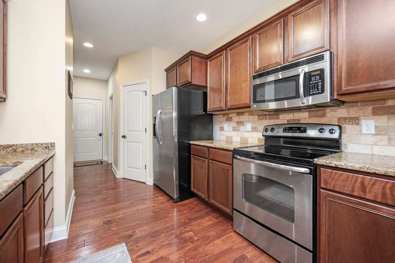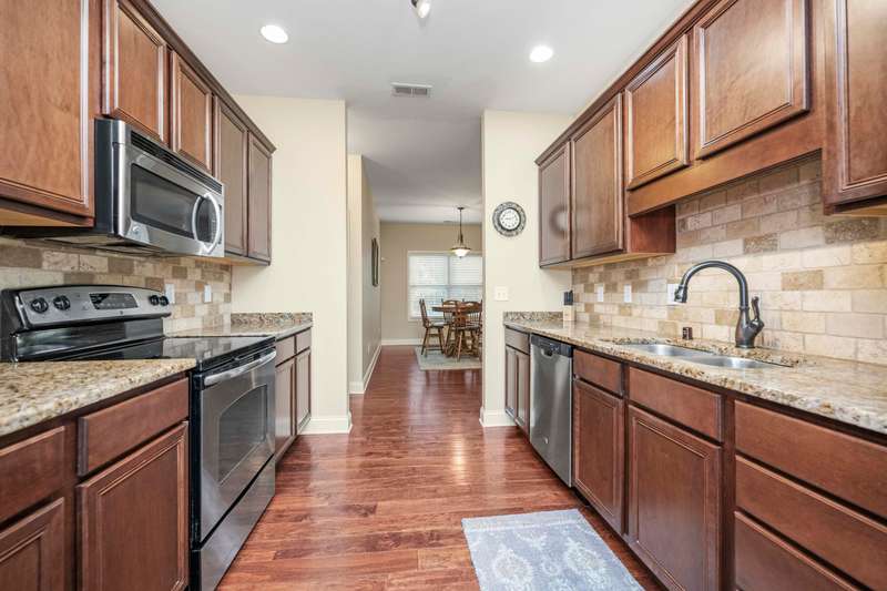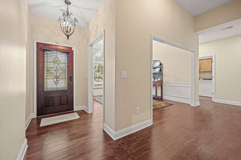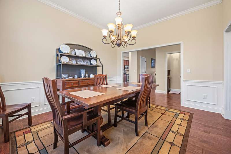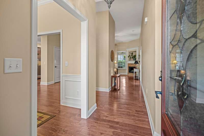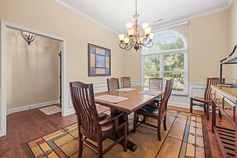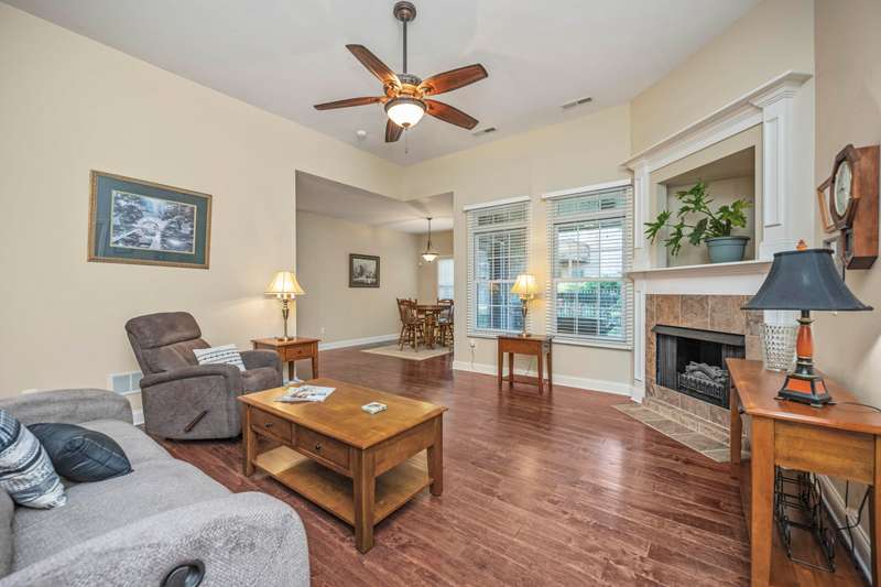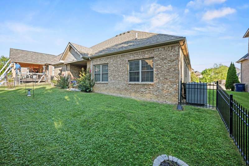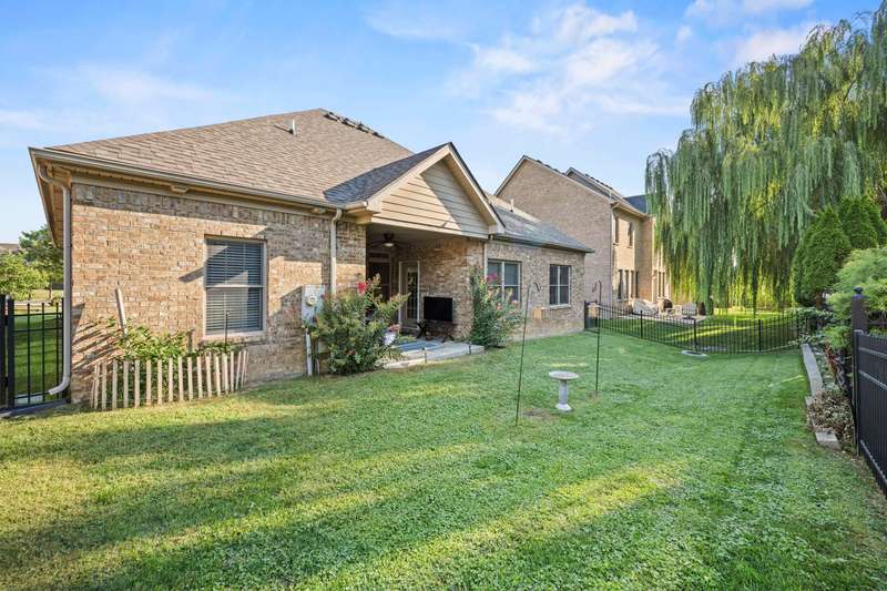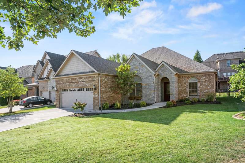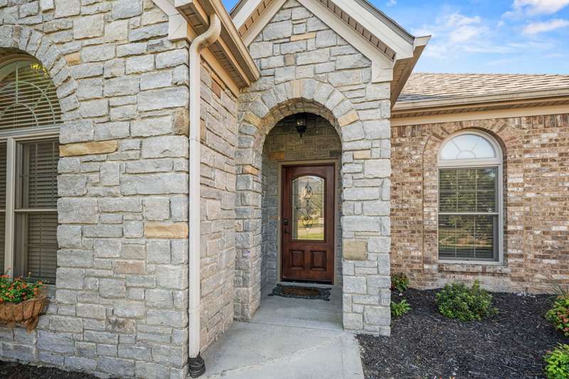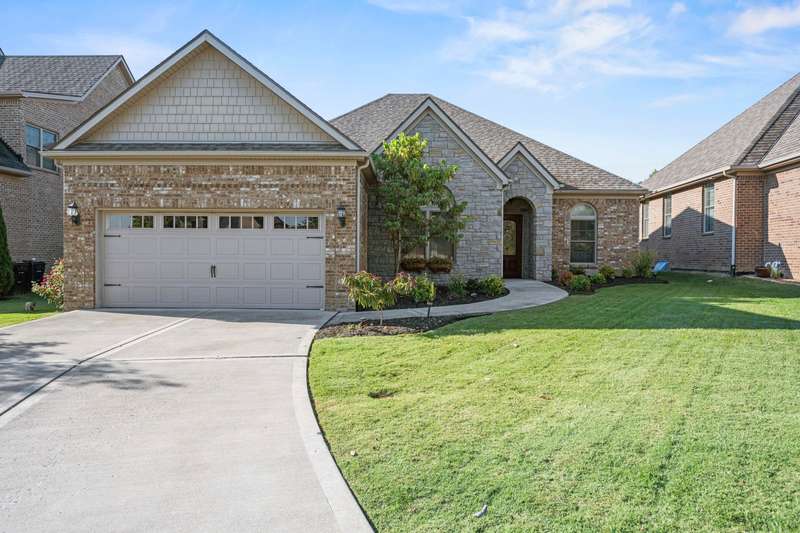 Welcome to this stunning brick and stone ranch in the desirable Tuscany neighborhood. An inviting wooden entry door and covered front porch opens to a beautifully designed home featuring three bedrooms and two-and-a-half bathrooms. The split-bedroom layout showcases a spacious formal dining room, a cozy family room with an electric fireplace and an open dining area leading into the kitchen. The kitchen features a travertine backsplash, granite countertops, stainless steel appliances, a sizable pantry and a convenient utility room with wall cabinets. The generously sized primary suite with a coffered ceiling offers an ensuite bathroom complete with a tiled shower, jacuzzi-style tub, linen closet and a walk-in closet with custom built-in cabinetry and shelving . Two additional bedrooms are connected by a Jack-and-Jill bathroom with its own linen closet, perfect for family or guests. Enjoy the outdoors from the covered patio, while the irrigation system keeps the lawn and landscape lush. A two-car garage completes the package, offering comfort, convenience and the ease of one-level living.