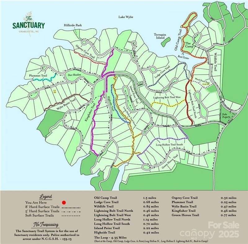 A fantastic private wooded lot on 8.30 acres in the amenity-rich Sanctuary with seasonal views . This exclusive community on Lake Wylie offers 7 miles of shoreline, 20 miles of trails, a 17-acre waterfront amenity area with three swimming pools, seven tennis courts, a fitness center, a boating center with kayaks and canoes, full-time activities staff, amphitheater, picnic tables, fire pit area, and boat slip rentals. The Sanctuary is a quiet, exclusive retreat located within minutes of I-485, uptown Charlotte, The Airport, Top Golf, the White Water Center, and Steele Creek shopping.