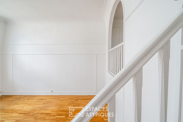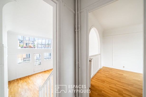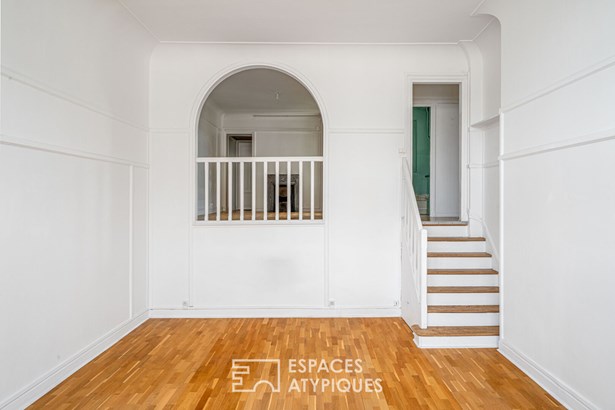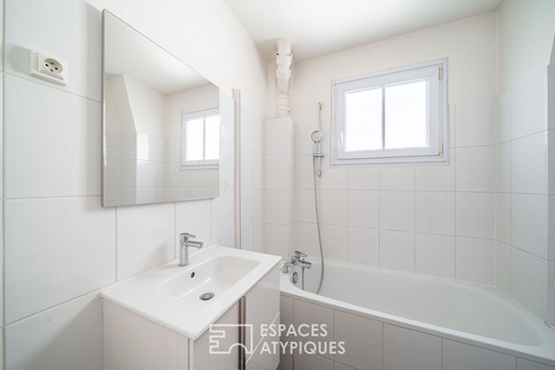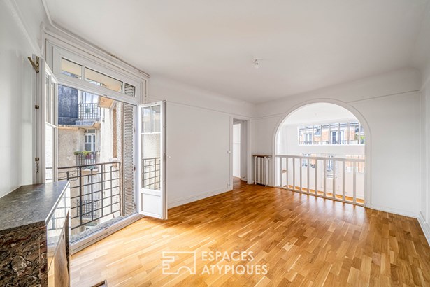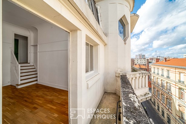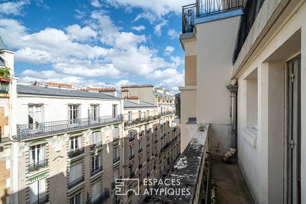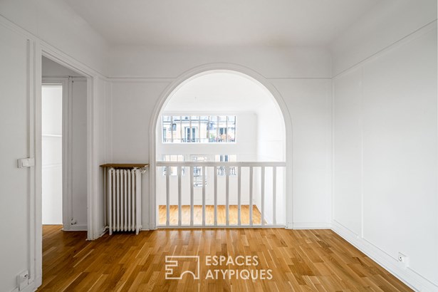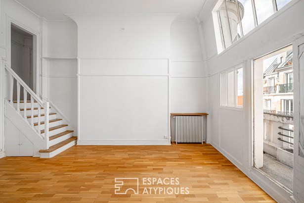 An entrance leads to a separate kitchen, which needs to be fitted out, facing a living room with clean lines, illuminated by a glass roof that provides access to the balcony.