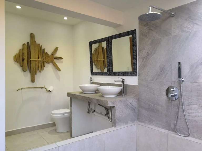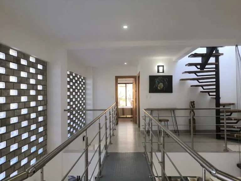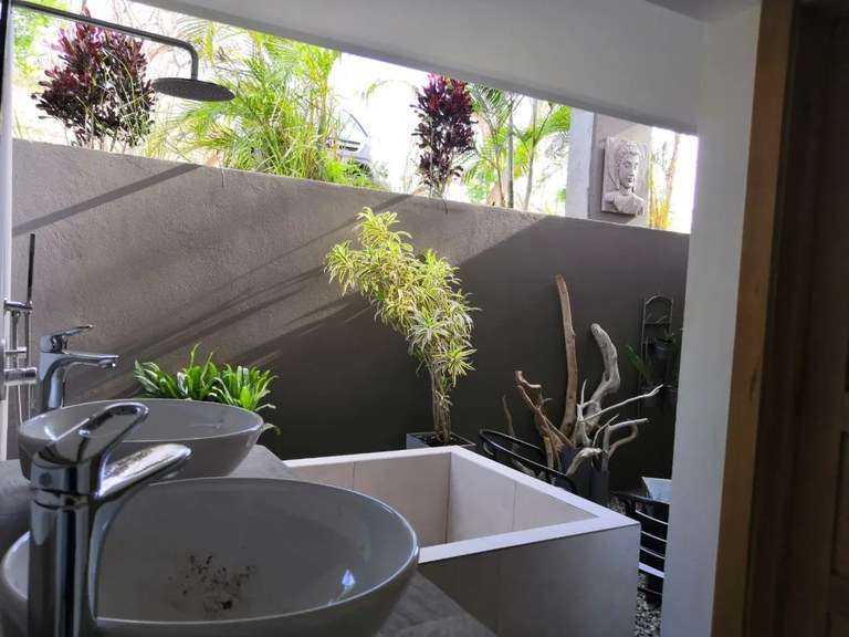 The villa is designed by a distinguished French architect and thoughtfully decorated with elegance and style. The main ground floor features a spacious kitchen, living room, pool table, and one bedroom, offering a comfortable and welcoming environment. The lower floor, accessible by stairs, houses a cozy bedroom with a queen bed and an outdoor bathroom with a bathtub. The second floor includes two bedrooms, each with its own outdoor bathroom, and provides access to the impressive rooftop terrace. Additionally, there is potential to expand by enclosing the rooftop to add an extra room.