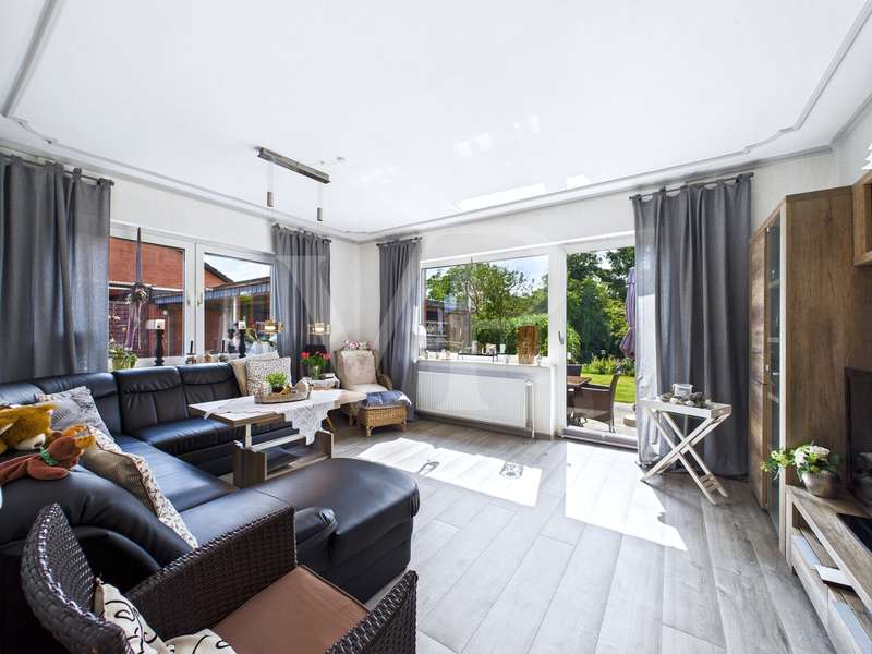 Welcome to your new home in Moormerland/Warsingsfehn - a lovingly maintained detached house that was built in 1978 using solid construction methods and has been continuously modernized and maintained ever since. With around 120 square meters of living space and a generous plot of around 909 square meters, it offers the perfect setting for families, couples or anyone who wants to enjoy life with space and space. As soon as you enter the inviting hallway, you can feel the harmonious character of the house. To the left is the bright kitchen, completely renovated in 2021, in which modern equipment and friendly colors create an atmosphere in which cooking is a pleasure again. The window, which was renewed in 2020, lets in plenty of natural light, which makes the room shine. Right next to it is the first, spacious living room - a place for sociable evenings, quiet reading or relaxed conversations with friends. Also on the first floor is a modern guest WC and the stylish bathroom, which was extensively modernized in 2019/2020 and now boasts contemporary fittings and a feel-good character. A bedroom on this level allows for comfortable, ground-floor living - ideal for any living situation. From the hallway, the path continues into a versatile room that was converted from a garage into a living space in 2015. Whether as a home office, hobby room or guest room - there are no limits to your imagination here. Behind it is another light-flooded living room with direct access to the well-kept, raised garden. The adjoining terrace offers space for sociable barbecues and relaxing hours outdoors - and also opens up the possibility of creating a conservatory if required. A staircase leads to the upper floor, where two further spacious bedrooms await you. Particularly interesting: one room, which is currently used as an office, was originally designed as a bathroom and can easily be converted back into an additional bathroom. A practical storage room here also ensures order and storage space. The house is in very good technical and visual condition: the main roof was renewed and insulated in 2008, the flat roof was modernized in 2019 and the heating boiler was replaced in 2023. The garden has been lovingly landscaped, and thanks to a carport with two parking spaces and three additional outdoor parking spaces, there is also plenty of room for your vehicles. Here, a well-kept, ready-to-occupy living ambience is combined with the tranquillity of a mature neighborhood and the proximity to shopping facilities, schools and leisure activities. A home that not only offers living space, but also quality of life - and is waiting to be filled with your personal stories.
