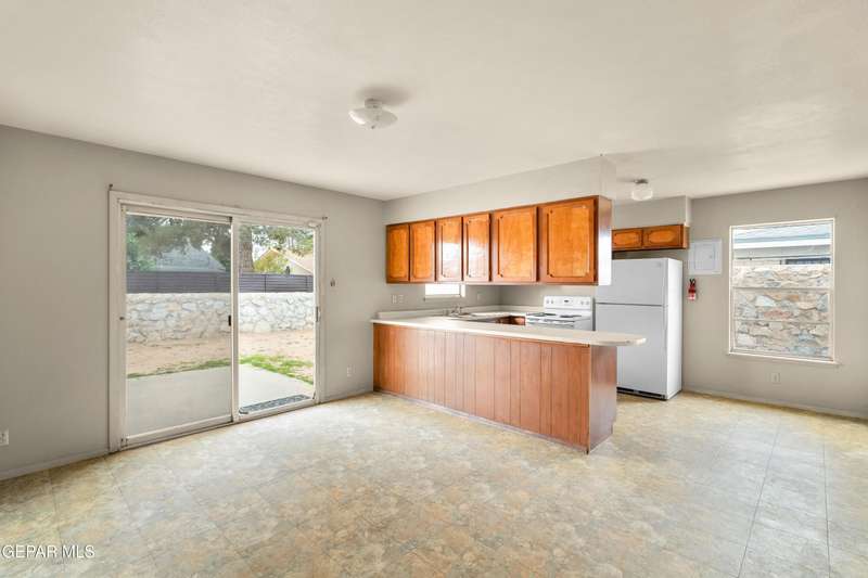 This well-maintained, single-owner brick home offers classic durability and low-maintenance appeal from the moment you arrive. A mature pine tree anchors the front yard, while the covered front porch provides a welcoming spot for seating or a future porch swing. Inside, the floor plan is straightforward and adaptable, offering an easy canvas for future updates. The living area centers around a charming chimney feature, and with no carpet throughout, the home is simple to care for and even easier to refresh. Sliding doors lead to a privately fenced backyard with a solid rear wall, creating a clean, defined outdoor space. Whether you envision a garden, patio, or play area, the yard is ready for your ideas. With Eastwood Park just steps away, outdoor recreation and green space are close at hand. Well-kept, practical, and full of potential, this home delivers everyday comfort with room to make it your own.