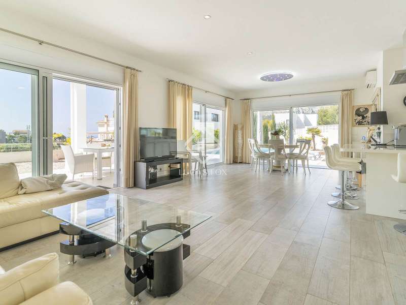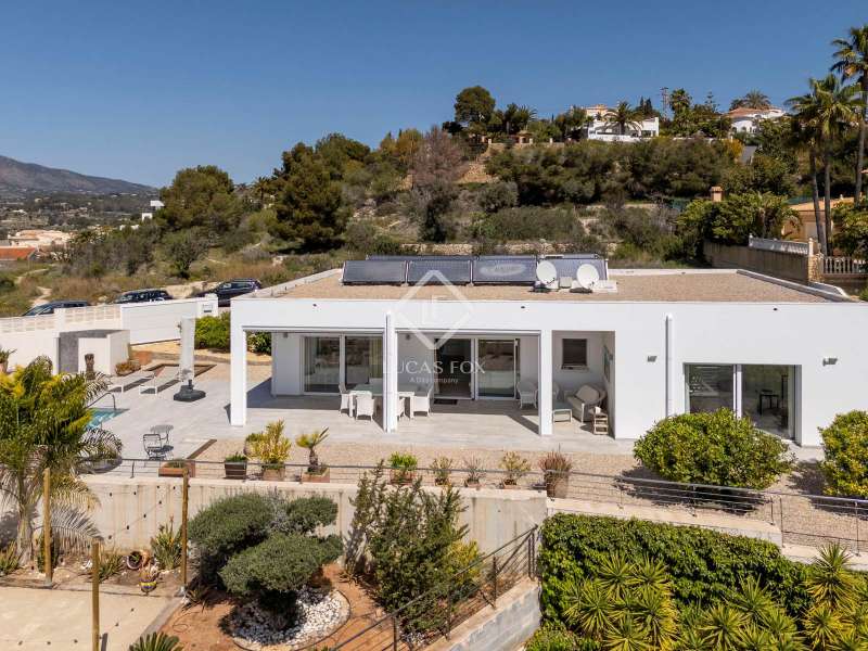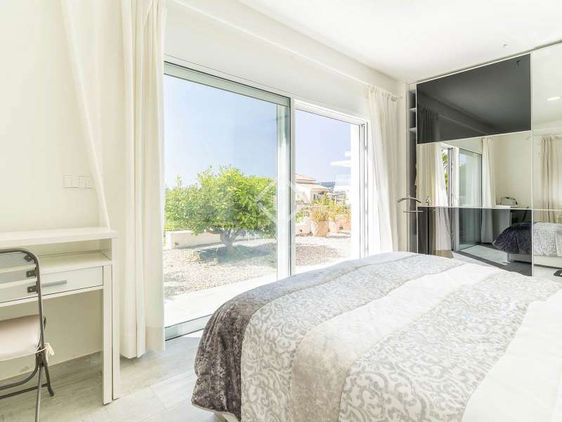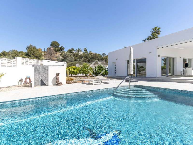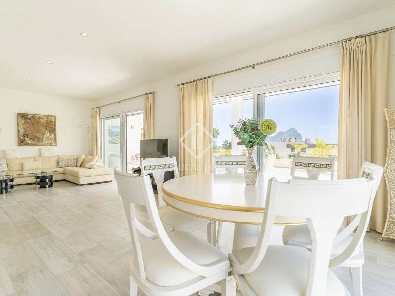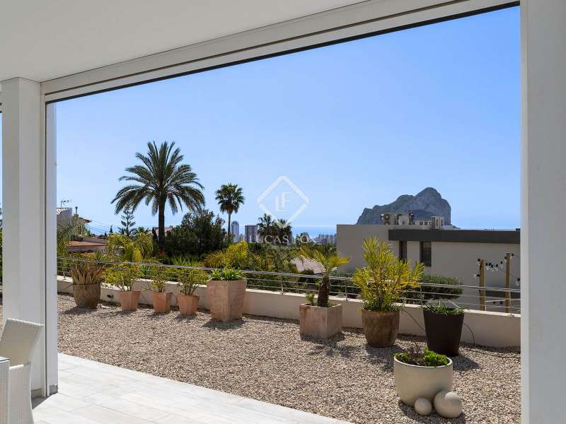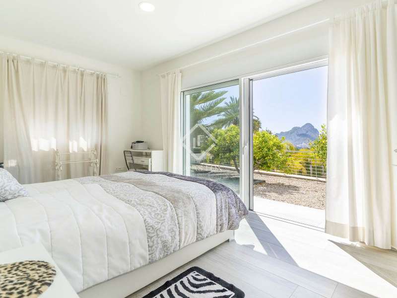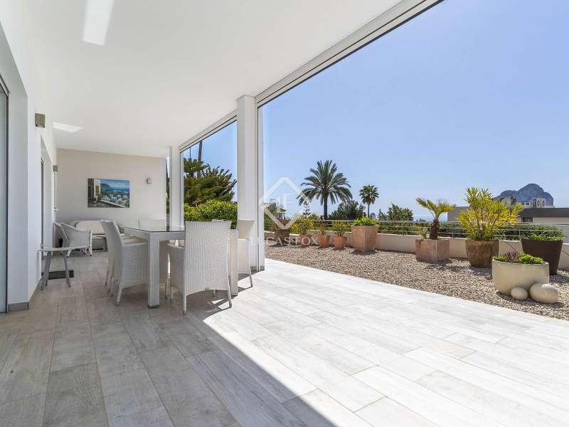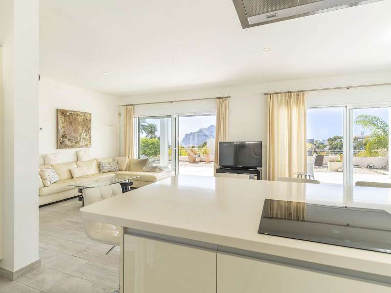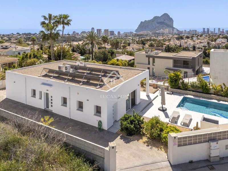 This modern villa, built with high-quality materials in 2016, is designed on a single floor with no steps, combining elegance and functionality in a welcoming environment. Upon entering, a bright lobby leads to the spacious and sunny living and dining room room, equipped with sliding glass doors that access onto the exterior terrace. This relaxation area features automatic fabric blinds that provide shade in the warmer months, making this space an ideal place to enjoy the outdoors in total comfort. The open-concept kitchen is fully equipped with high-end Balay appliances . A discreetly attached pantry offers storage space and a utility room housing the washer and dryer. The bedroom area is carefully laid out to ensure privacy and comfort. The property features three bedrooms, including the main bedroom, which offers stunning views of the sea and the iconic Peñón de Ifach, an en suite bathroom , abundant natural light , and a relaxing atmosphere. The other two double bedrooms are spacious and bright and share an elegant full bathroom , ideal for family or guests. All bedrooms feature built-in wardrobes, electric shutters , and individual air conditioning with split systems, providing personalized comfort year-round. The underfloor heating system throughout the house ensures a comfortable temperature even in winter, and the hot/cold air conditioning allows you to adapt to any season. Exterior, the villa features a 4.5x10m heated pool , surrounded by a low-maintenance garden with an automatic irrigation system, trees, and plants that add freshness and color. It also features an exterior shower and a large parking area with capacity for at least four vehicles. As an added bonus, it includes a 60 m² basement, accessible from the exterior, perfect as a storage room, wine cellar or leisure area as needed. Furthermore, this property has an A energy certificate, which guarantees a highly efficient property with low energy consumption, greater thermal comfort, and a more sustainable long-term investment.