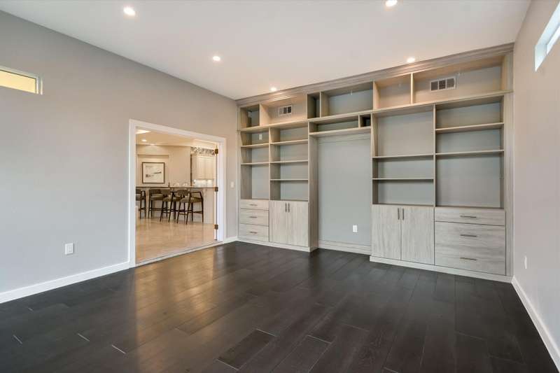 The interior offers plenty of space to start the party, with two large, window-lined living areas overlooking the terrace, pool and lush valley below; a double-sided fireplace warms both rooms. Guests can stop for a drink at the convenient step-in bar on their way outside. The large skylit kitchen is outfitted with Viking appliances and plenty of storage. Adjacent to the kitchen, a large hobby or playroom provides additional space for life's messier pursuits and can be shut off for privacy. The main floor also includes a formal dining room and an office/bedroom with a closet and full bath.