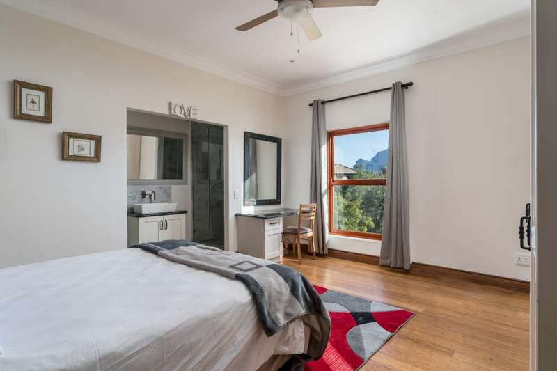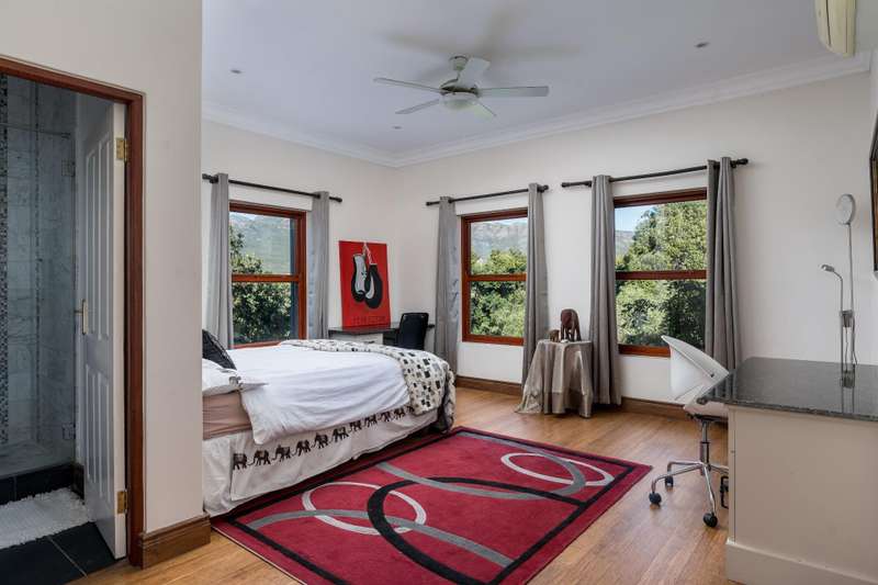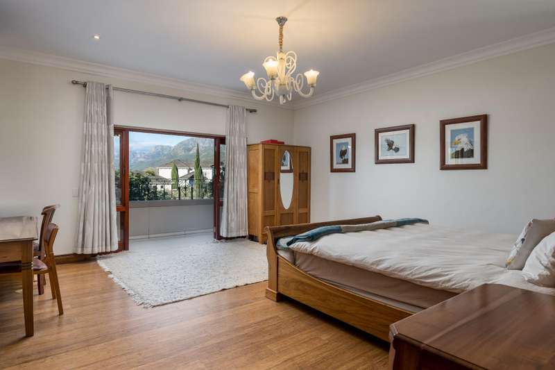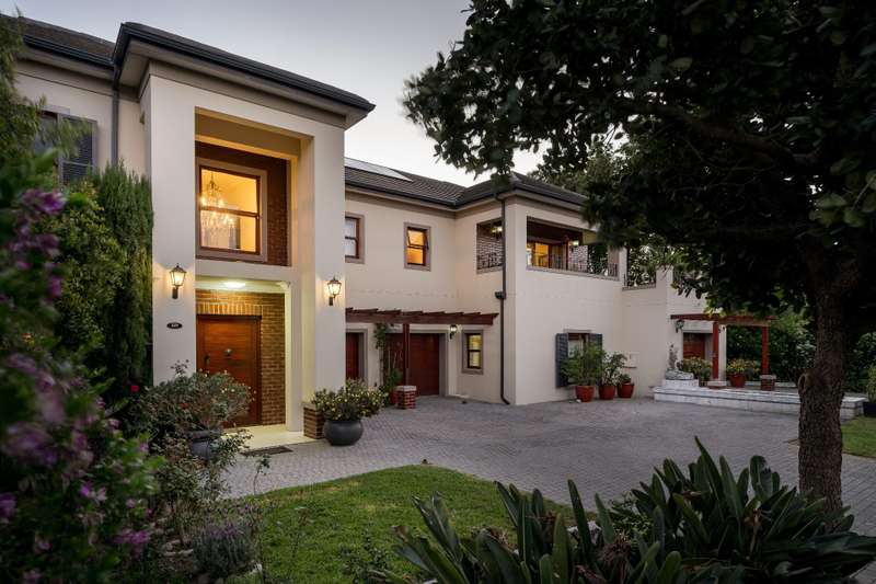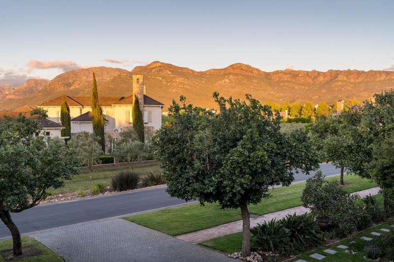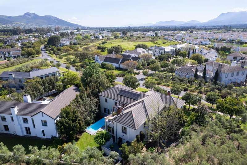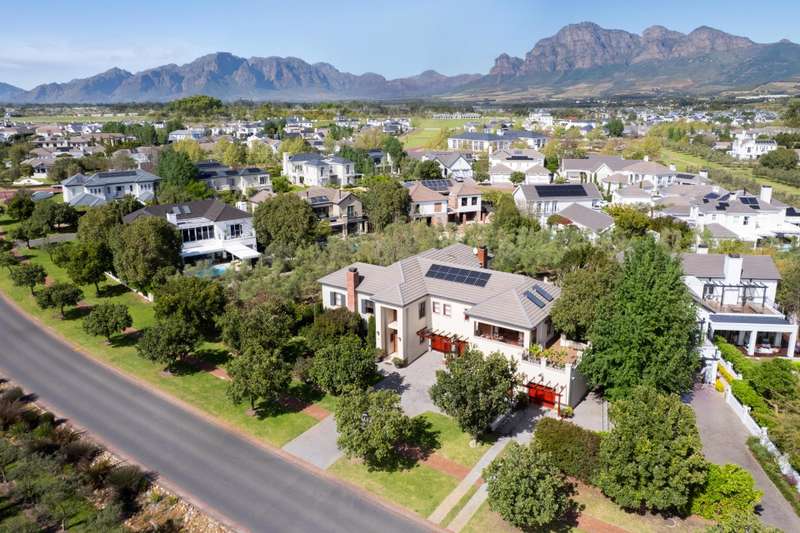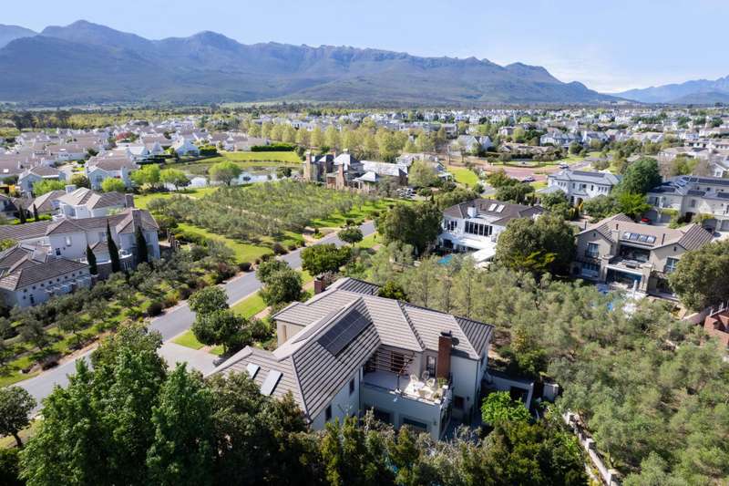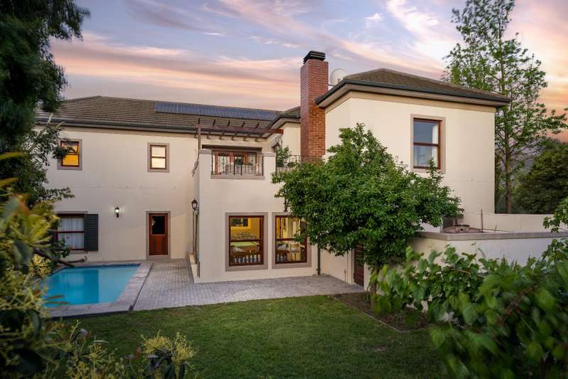 Exclusive Dual Mandate This beautifully private double story family home is set among manicured grounds within the most established part of Val de Vie Estate. This well-designed home offers 4 spacious en-suite bedrooms, as well as a flatlet with its own private lounge, kitchen, entrance and parking. The main home has 2 separate lounge areas, great for year round entertainment. An open elegant floorplan boasts high ceilings and large windows allowing natural light to enter the home. The main living area with fireplace runs parallel to the dining and kitchen area sweeping onto a spacious undercover patio which leads to a lush garden and swimming pool. The upstairs houses 4 en-suite bedrooms with numerous balconies offering lovely mountain views as well as a spacious landing that can be used as an office area or pajama lounge. The house offers 3 garages with the option of converting one of the garages into a second flatlet bedroom. Notable extras include custom made Italian wood doors and window frames, a back up power system, and open greenbelt on 2 sides of the property.