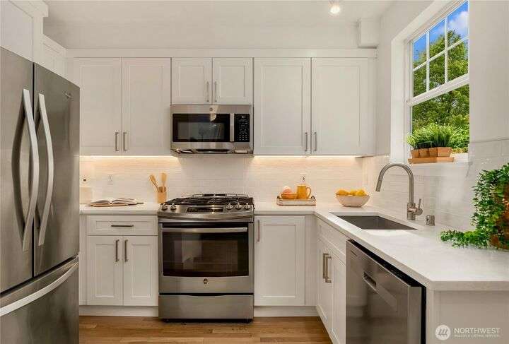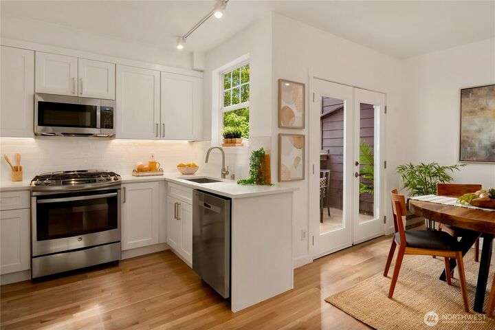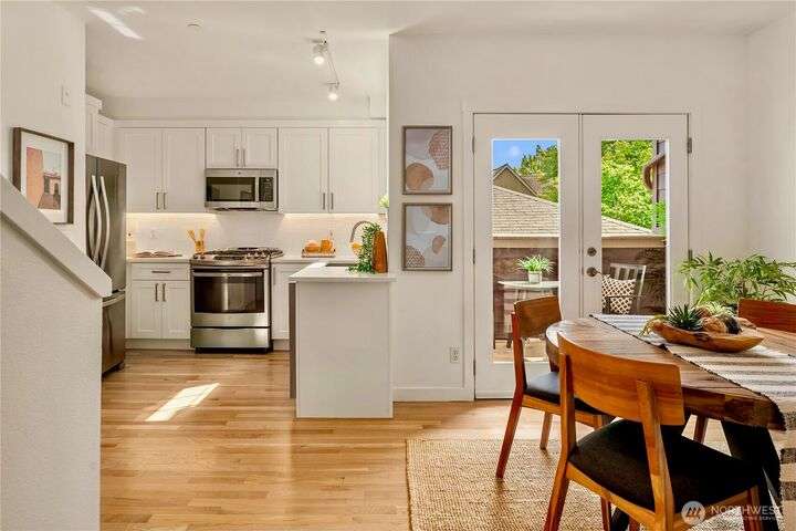 New price! Beautifully updated townhome in the heart of West Seattle, with a brand-new kitchen complete with sleek quartz countertops, stylish under-cabinet lighting, and modern finishes perfect for everyday living and entertaining. Enjoy the warmth of refinished hardwood floors and plush new carpeting throughout, complemented by fresh interior paint that gives the entire space a bright, contemporary feel. Cozy gas fireplace, private deck in the living room and primary bedroom, gated entry, convenient garage parking and additional storage. Easy access to both Junctions with excellent transit options nearby - commuting is a breeze while still enjoying the charm of the of the wonderful Seaview neighborhood. Don't miss this move-in-ready gem!