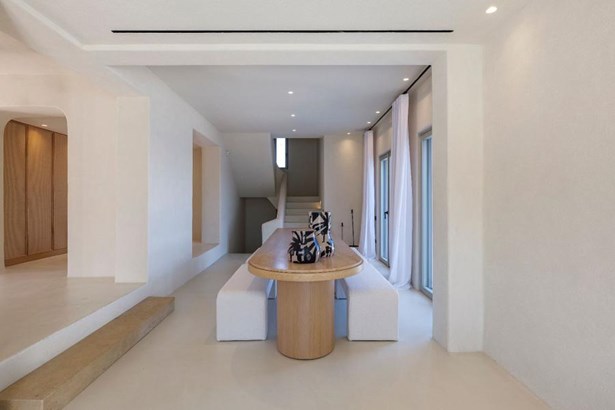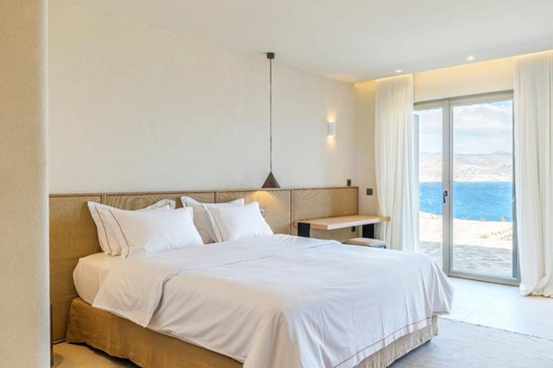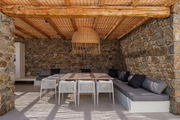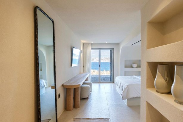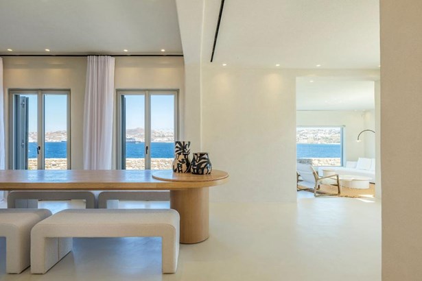 Step outside onto the sprawling private terrace, where a 100-square-meter infinity pool beckons for moments of refreshing serenity. Immerse yourself in the breathtaking vistas of the Myconian sea and Mykonos Town, while basking in the tranquility of your surroundings.