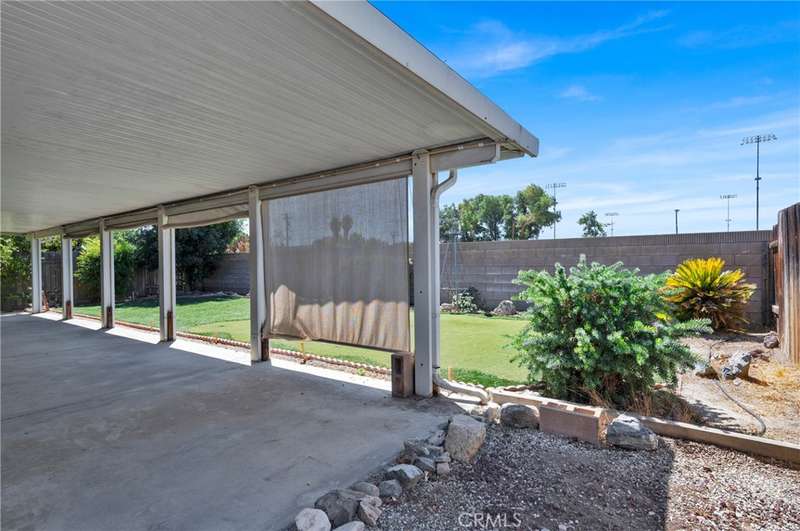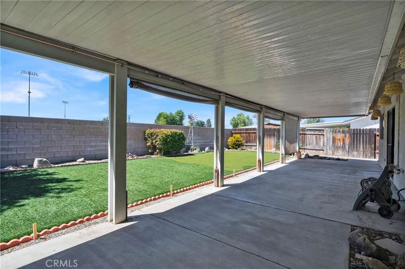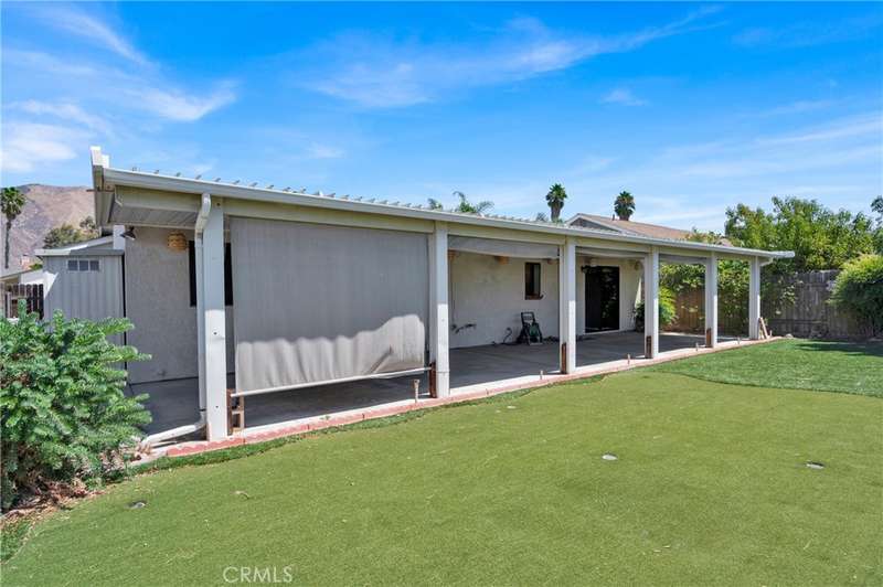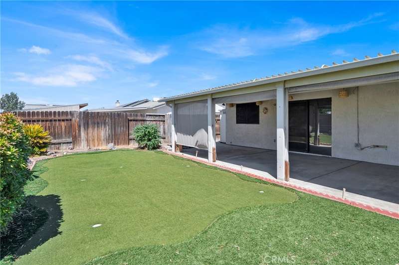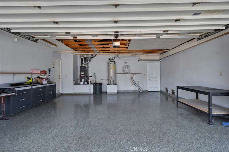 The backyard is designed for easy maintenance with artificial turf and a covered patio--ideal for relaxing or entertaining. The garage is a standout with built-in cabinets, a workbench, and attractive epoxy speckle flooring, offering both functionality and style.