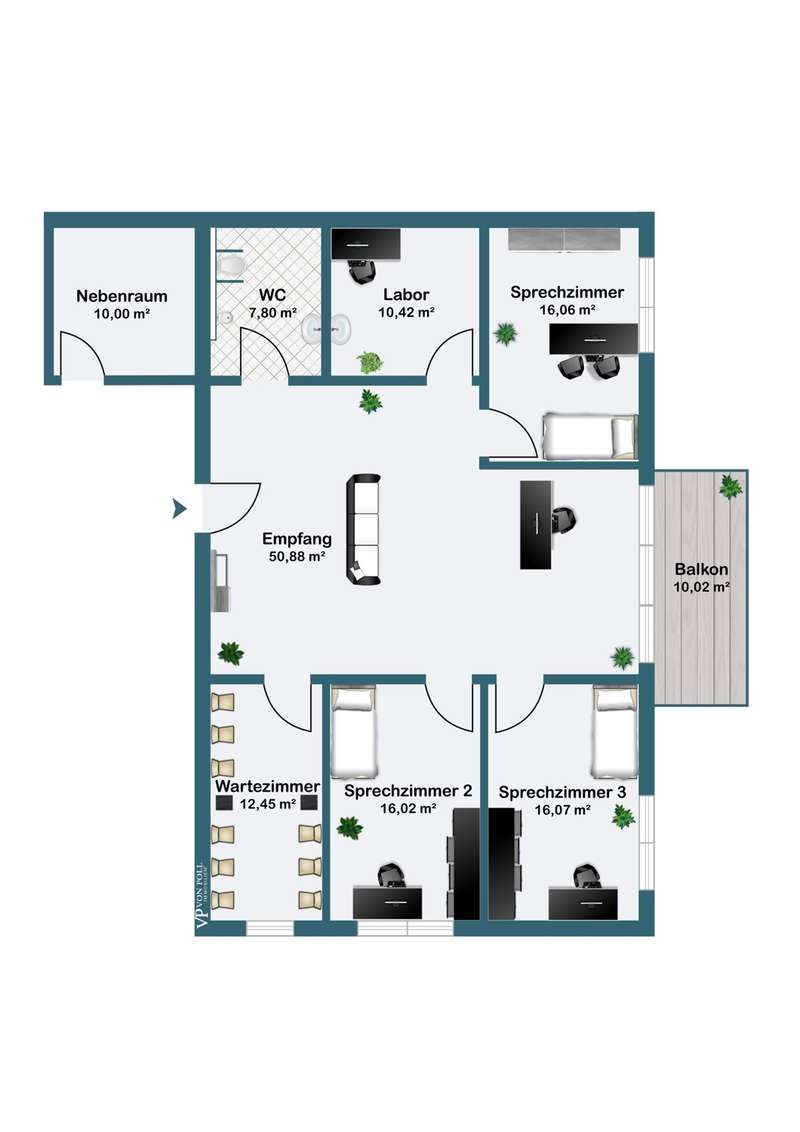 Here you have the unique opportunity to rent commercial space / practice in the newly built KfW 40 medical center. The building is scheduled for completion in 2026. The individual design of the property offers you a lot of freedom. Thanks to the very well thought-out room layout, the unit is suitable for both commercial premises and a practice. This new KfW 40 building includes 8 residential units and 4 commercial units. Almost anything is possible here: you could even rent an additional apartment and expand your commercial unit. Your new commercial unit of almost 140 m² welcomes you and your customers/patients in a modern, sustainable and energy-saving design. The approximately 51 m² reception area creates a friendly atmosphere. Here you have the opportunity to take a pleasant break on the adjoining balcony or simply enjoy the fresh air. From the reception area, you have direct access to 6 of the 7 rooms. The first room, measuring around 12.5 m², is ideal as a waiting room or individual office. The other room with approx. 16 m² can be used as a consultation room for your patients or as an office for your employees. Two additional rooms of a similar size can also be used as offices or consulting rooms. All 4 office or consultation rooms have natural light sources and fresh air supply through triple-glazed plastic windows with optimum thermal insulation. The unit also offers two further rooms that are ideal for use as laboratories or archives. Both rooms have an area of approx. 10 m² each. There is also a WC of around 8 m² in the commercial unit. Your new commercial unit is also characterized by modern vinyl parquet flooring and an attractive appearance. A ventilation system ensures a perfect feel-good atmosphere - for you, your employees and your customers. The practice is easily accessible via an elevator. The commercial unit is located on the top floor of the building. To reduce operating costs, the building is equipped with a modern photovoltaic system, which helps to reduce energy costs. A rough estimate of the ancillary costs is around € 300 per month. There are 5 parking spaces available for your customers.