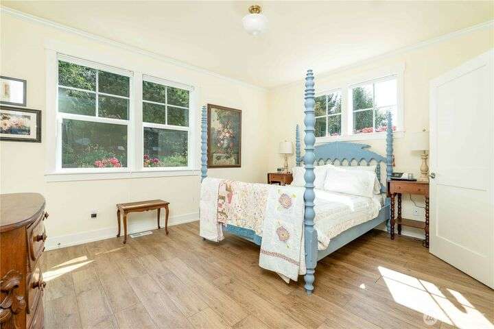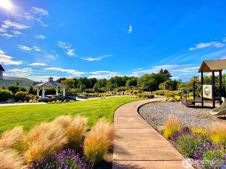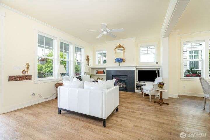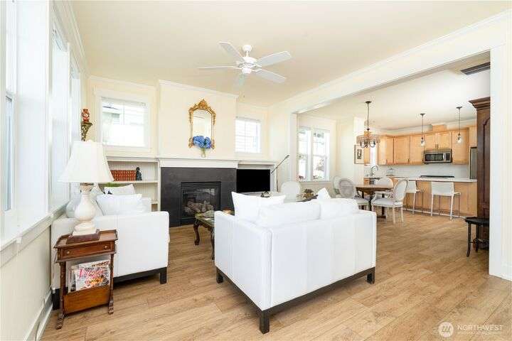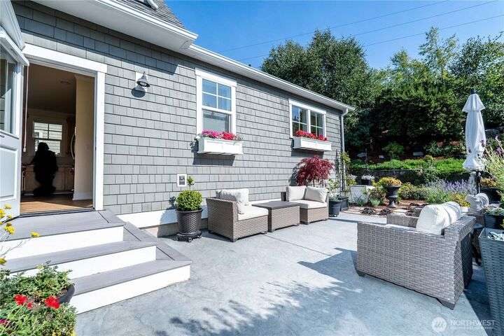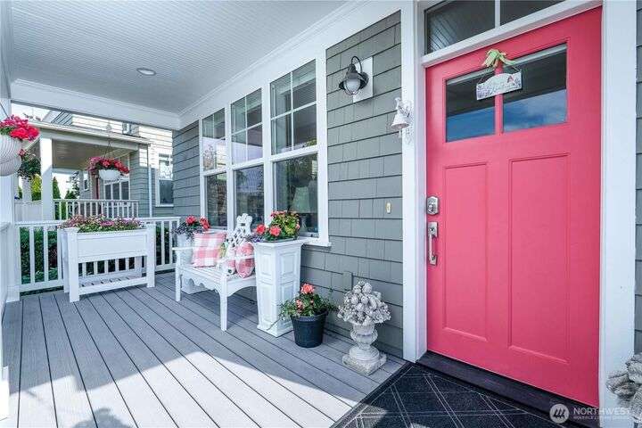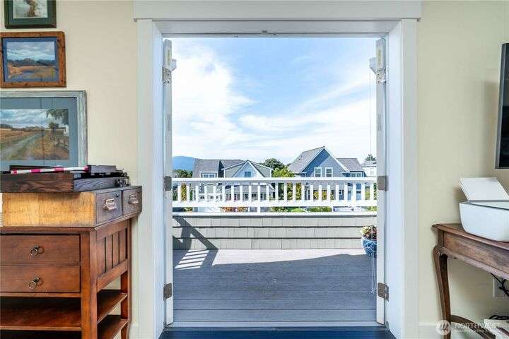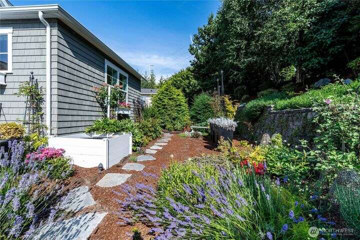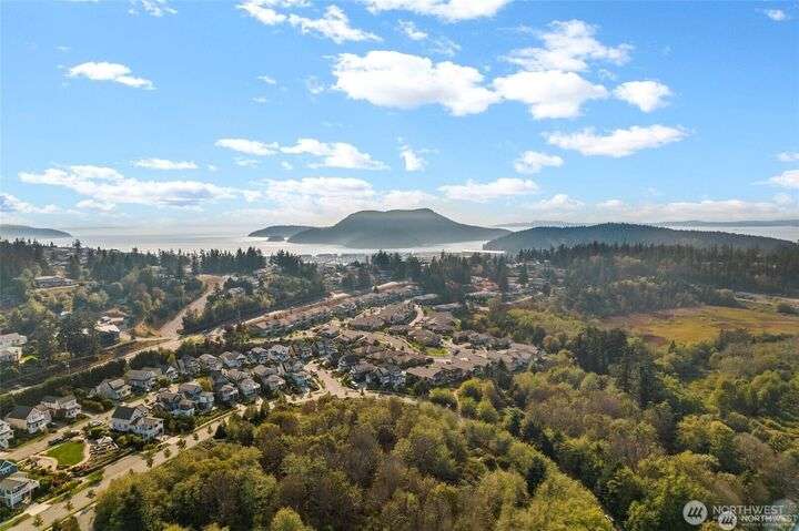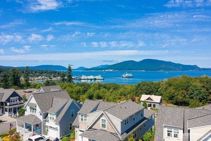 Cape Cod charmer in sought-after San Juan Passage neighborhood with 5 community parks, pickle ball court & firepit and with direct access to Guemes Channel Trail. This home boasts timeless street appeal, front porch, upper deck (with views!!) and a meticulous French inspired back garden and patio. Main floor has open plan, wood floors, slab stone counters in kitchen, dining room, gas fireplace with built-in shelving in living room. Main also has primary bed & bath and powder room. Additional 2 bedrooms and full bath on 2nd floor. Attached one car garage. Enjoy this close knit community and even walk to the San Juan Ferry!