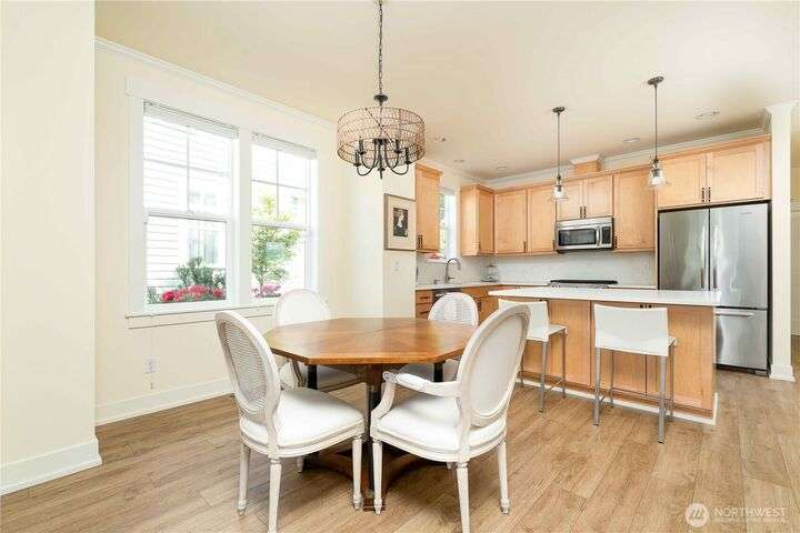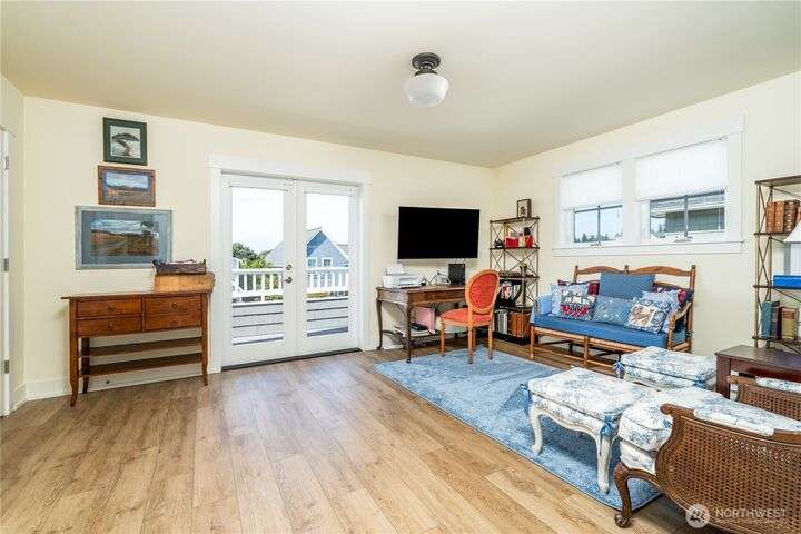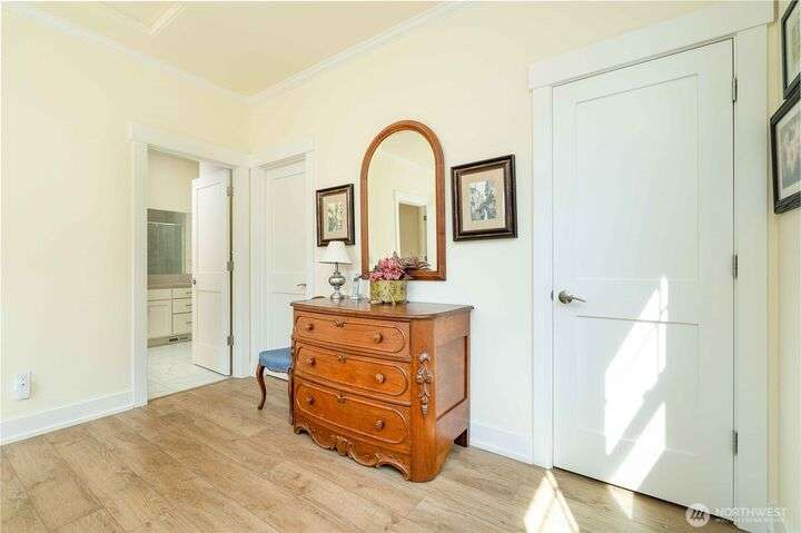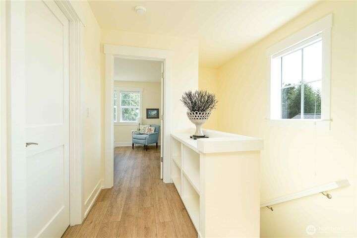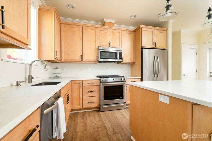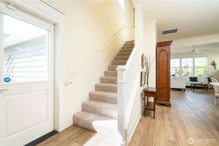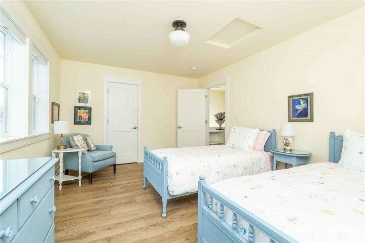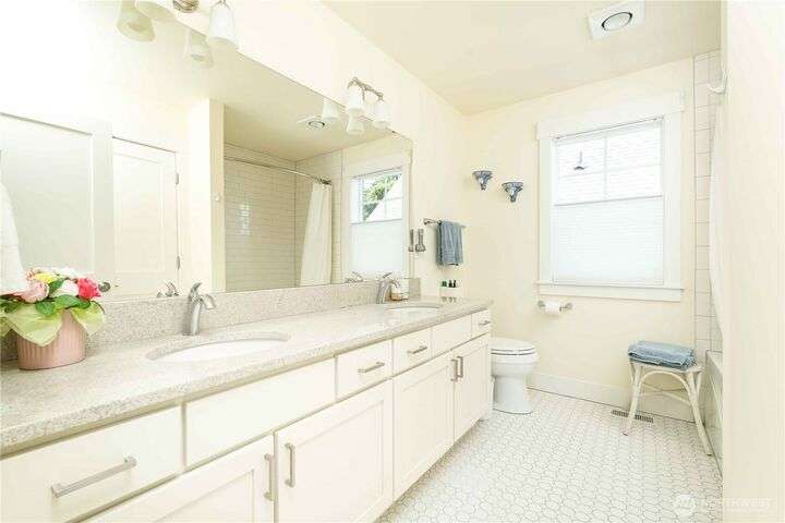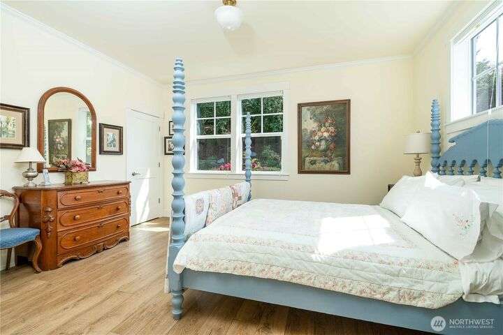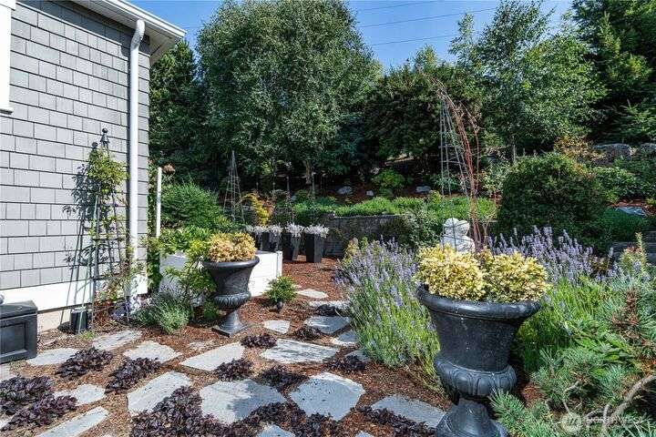 Cape Cod charmer in sought-after San Juan Passage neighborhood with 5 community parks, pickle ball court & firepit and with direct access to Guemes Channel Trail. This home boasts timeless street appeal, front porch, upper deck (with views!!) and a meticulous French inspired back garden and patio. Main floor has open plan, wood floors, slab stone counters in kitchen, dining room, gas fireplace with built-in shelving in living room. Main also has primary bed & bath and powder room. Additional 2 bedrooms and full bath on 2nd floor. Attached one car garage. Enjoy this close knit community and even walk to the San Juan Ferry!