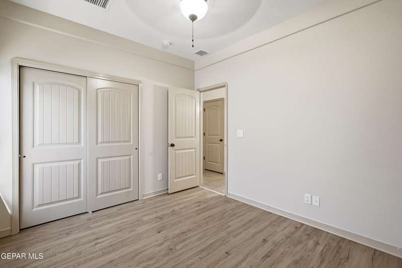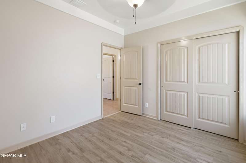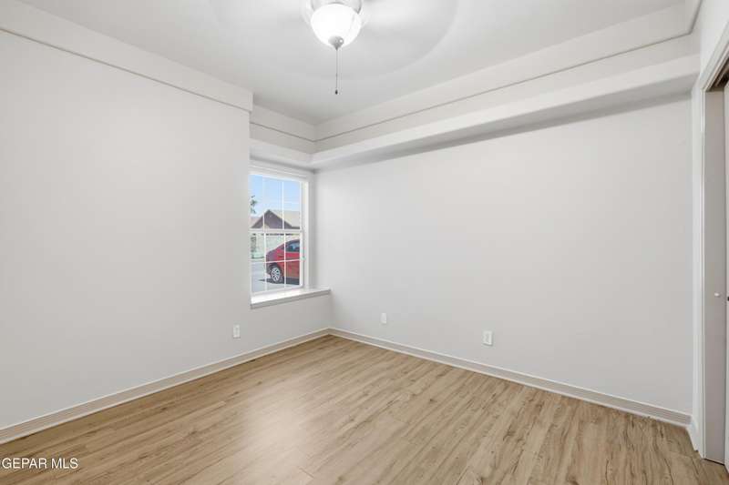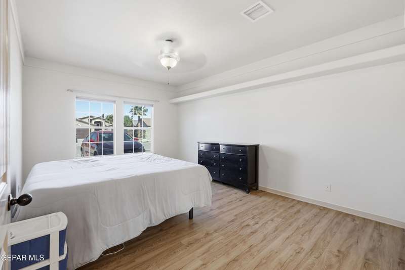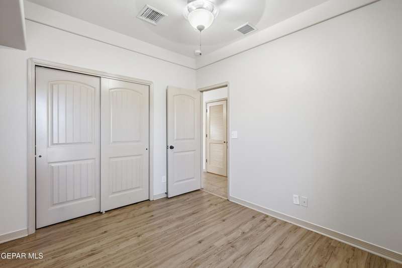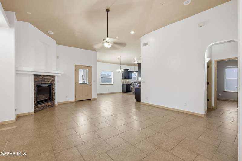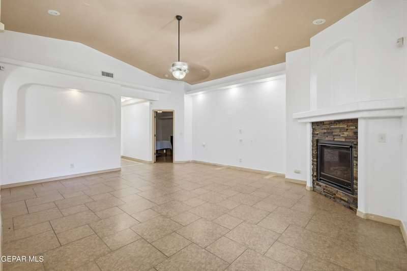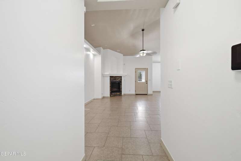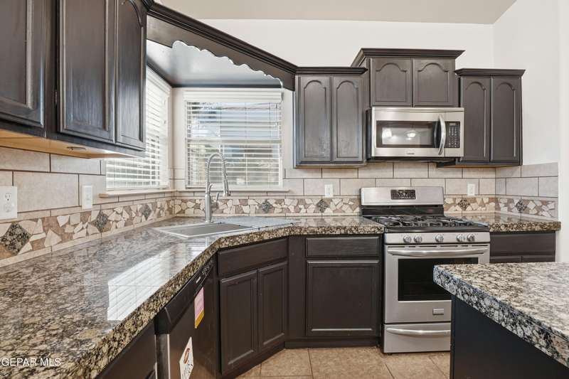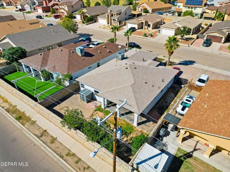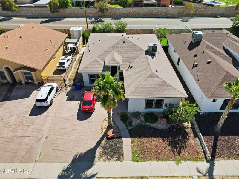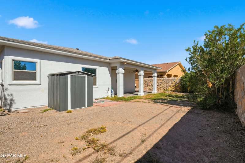 This beautifully renovated 4-bed, 2-bath home blends modern comfort with subtle Spanish-inspired design elements. Freshly painted interiors and an open layout welcome you into a bright living space featuring a tall stone accented kitchen island, rich dark cabinetry, and a cozy breakfast area. The spacious primary suite is thoughtfully separated from the other bedrooms for added privacy. Recent upgraded refrigerated air HVAC unit system for efficient cooling. Outside, a curved driveway leads to the side-entry garage, complemented by low-maintenance desert landscaping and palm trees for that warm El Paso touch. A backyard shed adds extra convenience, and you'll love being less than 5 minutes from schools, shopping, and restaurants with easy access to Rich Beem Blvd to skip the traffic. Move-in ready and full of character!