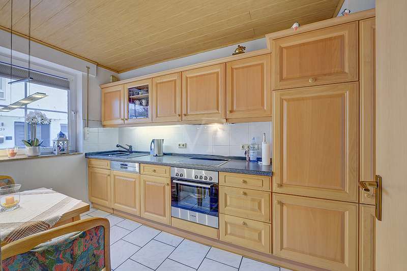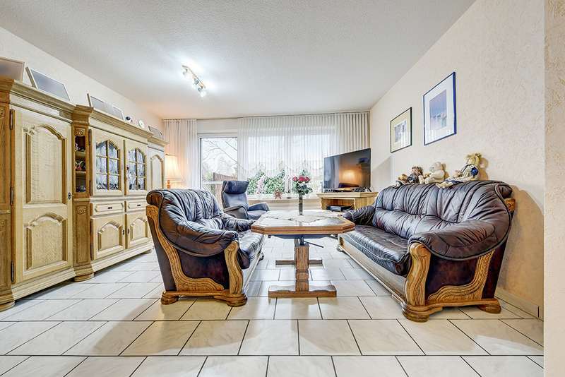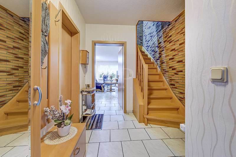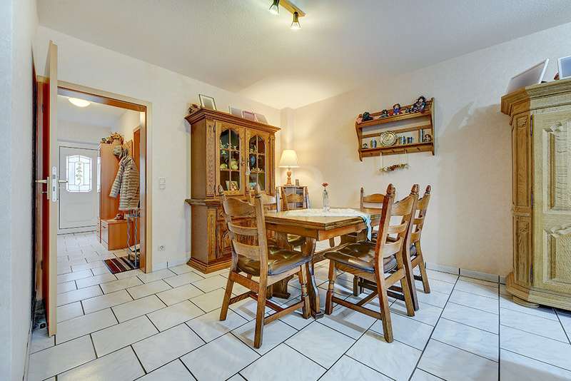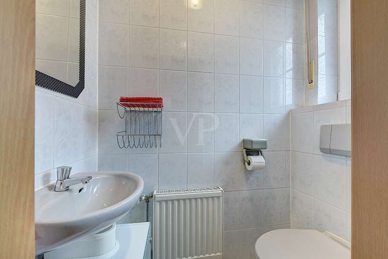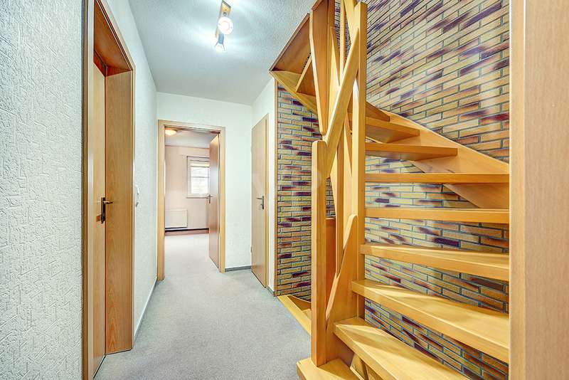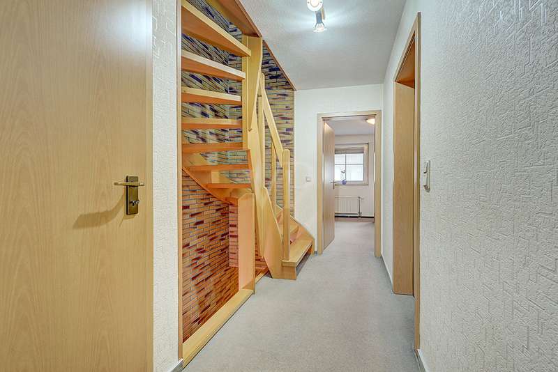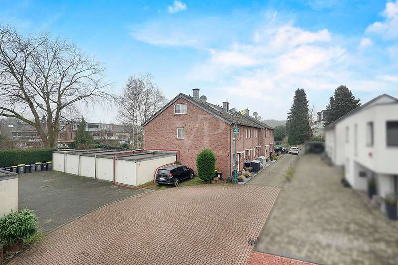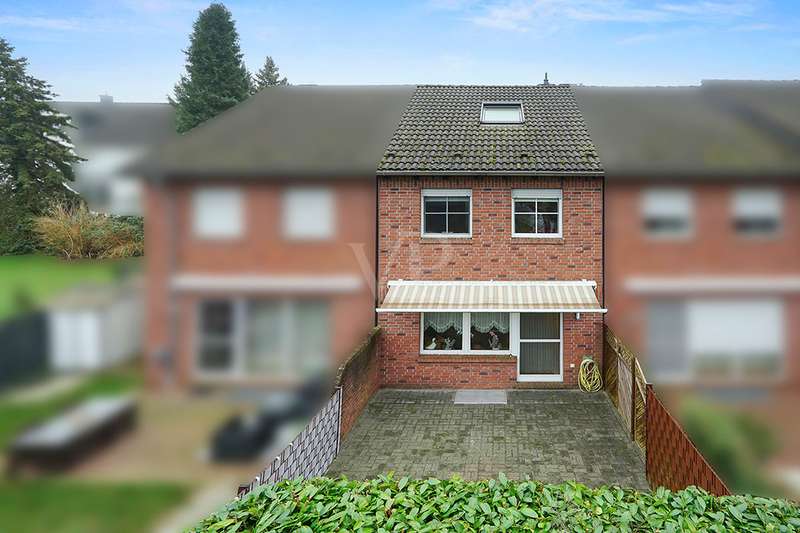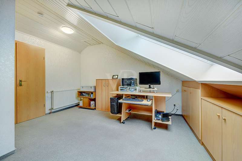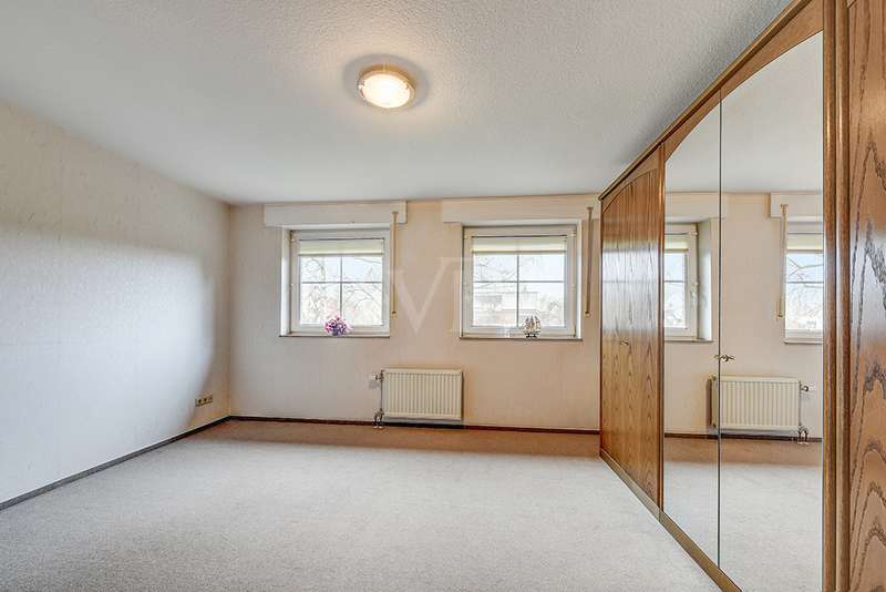 This terraced house with a full basement forms a residential complex with other houses in part ownership in a private street and is the ideal home for young families, couples, patchwork families or those seeking peace and quiet. The convenient residential location certainly offers good rental opportunities, making this property ideal for investors who might want to secure this pretty house for the future! In a quiet, traffic-calmed play street just a hand's throw away from the elementary school and not far from the kindergarten. A small paved front garden welcomes you and lets you enter the friendly and bright house. A kitchen to the left and a modern guest WC to the right. The well-designed living room offers ideal space for a dining and living area and through the large window front you can enjoy the view of the large south-facing terrace and the low-maintenance garden. An electric awning protects you from the sun during the day. From the living room, you can access the basement, which contains a laundry room, a boiler room and a huge hobby cellar. The solid and beautifully curved wooden staircase that leads to the upper floor and the various brickwork on the walls give the house a special charm. As there are no sloping ceilings on the first floor, you can look forward to two spacious and bright bedrooms and a large interior family bathroom with washbasin, WC and bidet, as well as a shower cubicle and bathtub. A highlight is the converted attic studio with shower room, which can be used as a home office, guest room or bedroom. Modern skylights with blackout blinds provide another beautifully bright room. The adjoining shower room is also equipped with skylights. Older children and young adults in particular will enjoy having their "own little kingdom". A few houses away is the garage courtyard, where the garage is located. All in all, a house that you can move into very quickly and feel at home in. 3 wonderfully large and light-flooded bedrooms that do not feel cramped. The current master bedroom could also be converted into two children's rooms if more space is required.