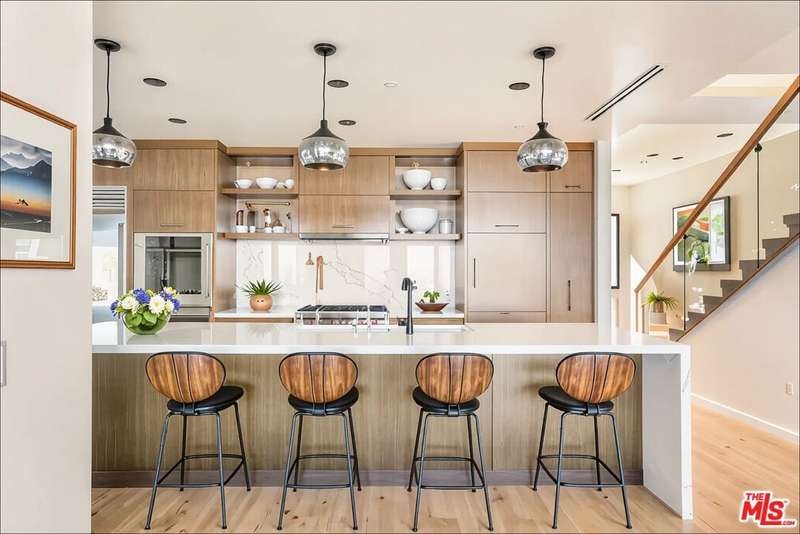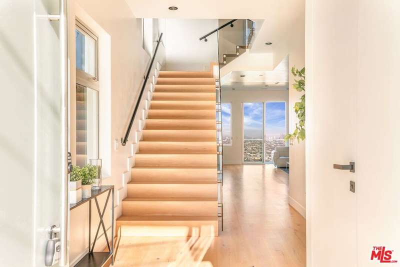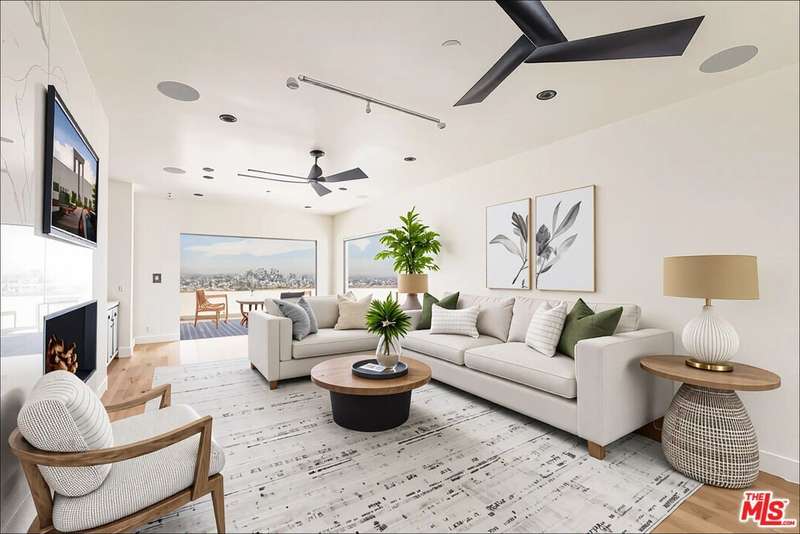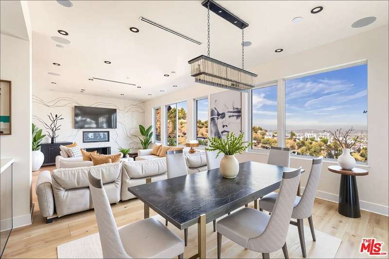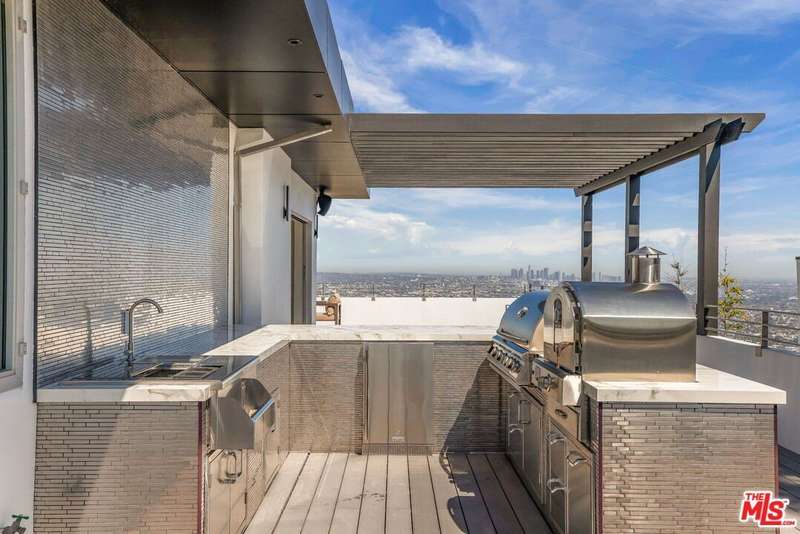 Set above the city in the Hollywood Hills, 1610 Viewmont has been completely transformed by the Belwood development team into a refined modern estate defined by clean lines, expansive volumes, and walls of glass. Spanning three levels, the home embraces its panoramic setting with unobstructed views from nearly every room and seamless indoor-outdoor transitions. A dramatic double-height entry leads into an open-concept main level where natural light floods the living spaces. The living room, anchored by a sleek fireplace, opens to generous view terraces, while the adjacent kitchen impresses with a marble island, custom cabinetry, and top-tier appliances. Five bedrooms are positioned throughout, including a main-level guest suite, upstairs bedrooms, and a private rooftop-level suite. The primary is a true retreat with fireplace, spa-like bath, and fully outfitted walk-in closet. Above it all, a full-scale rooftop deck with stainless steel outdoor kitchen captures sweeping skyline views, ideal for entertaining or quiet evenings. Just minutes from the Sunset Strip yet entirely private, 1610 Viewmont delivers elevated hillside living at its finest.