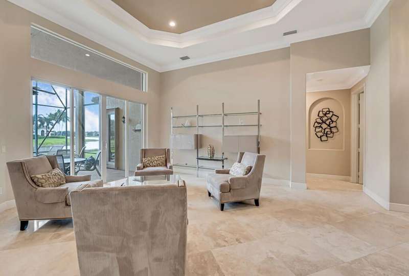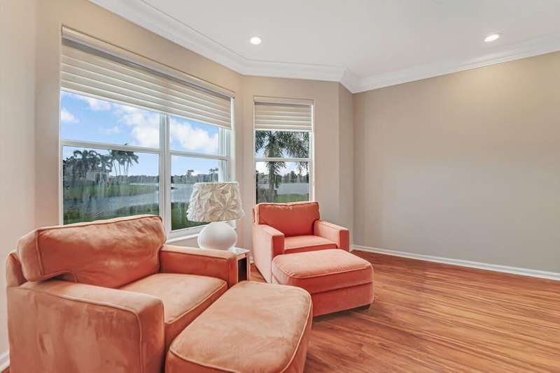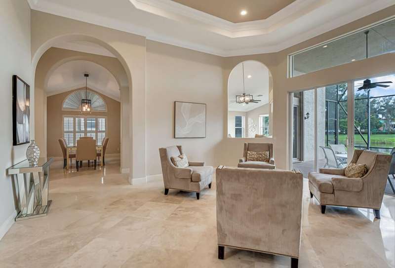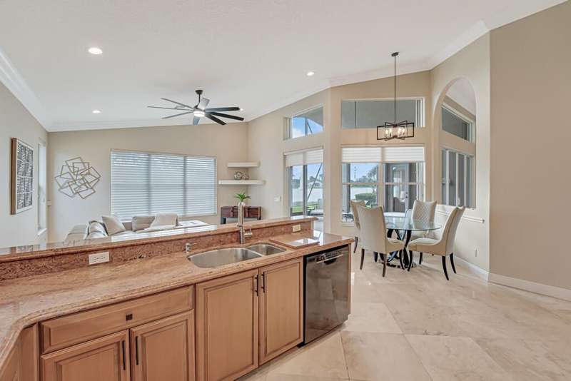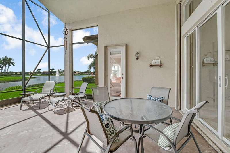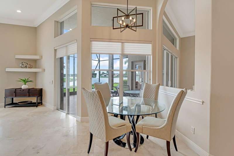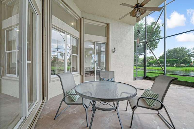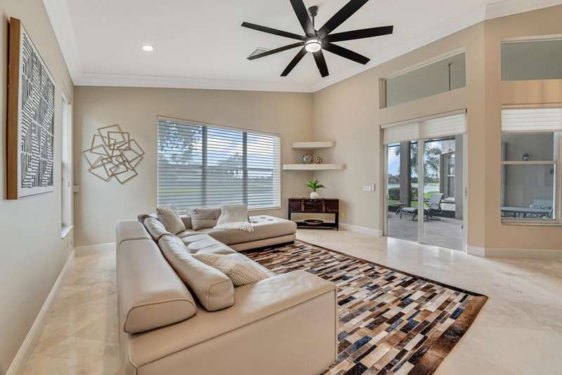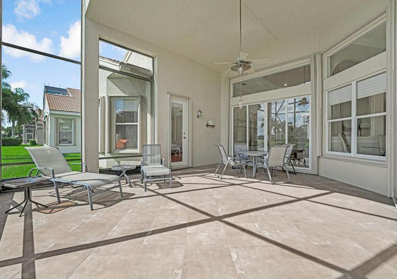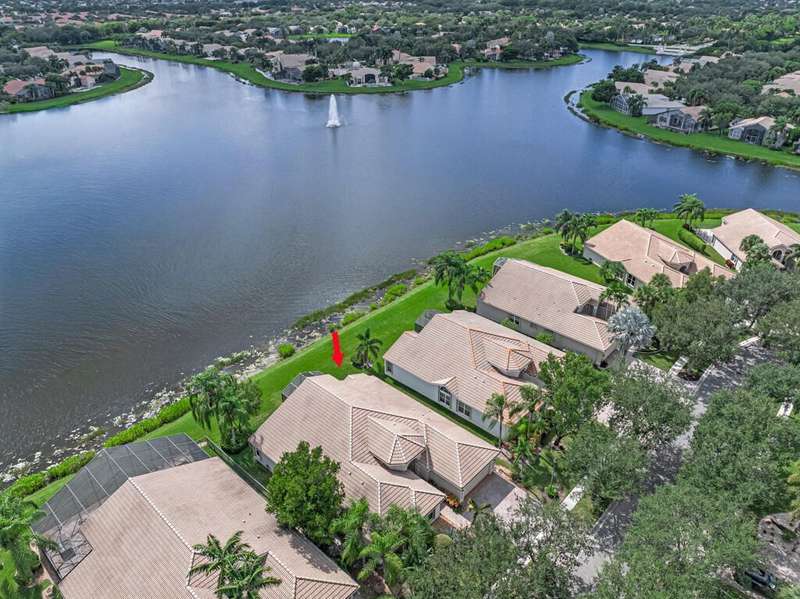 Magnificent MAIN LAKE WITH FOUNTAIN VIEWS make this 4 bedrm, 2 1/2 bath model home one of the most desirable in the community! A rare find, gorgeous marble floors & double entry doors greet you with light and bright open, airy space throughout! Gorgeous new lighting fixtures, LED high hats, super high ceilings, & a huge screened lanai with beautiful flooring , privacy overlooking water water everywhere create instant peace & serenity! No carpeting! Accordian shutter protection throughout! Walk to clubhouse, social tropical pool, full Serv restaurant, 6 pickleball crts, 3 Bocce crts! 10 tennis crts, 2 indoor racquetball CRTs, indoor whirlpool,resistance pool, lap pool too! Suana,steam, massage, Beaty salon, STATE OF ART FITNESS CTR! Country club lifestyle without the dues! LOVE THIS HOUSE!