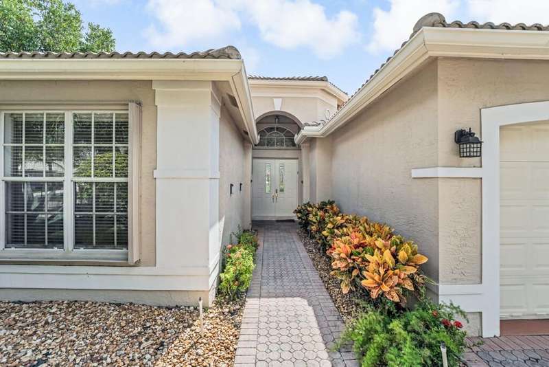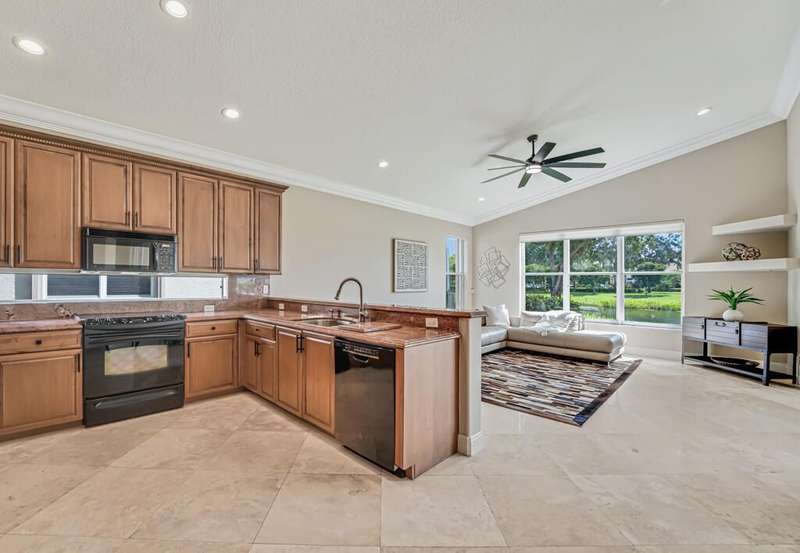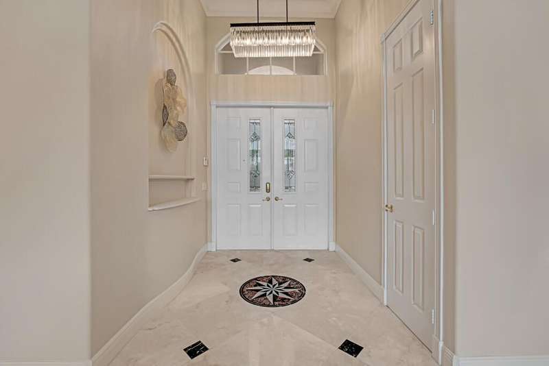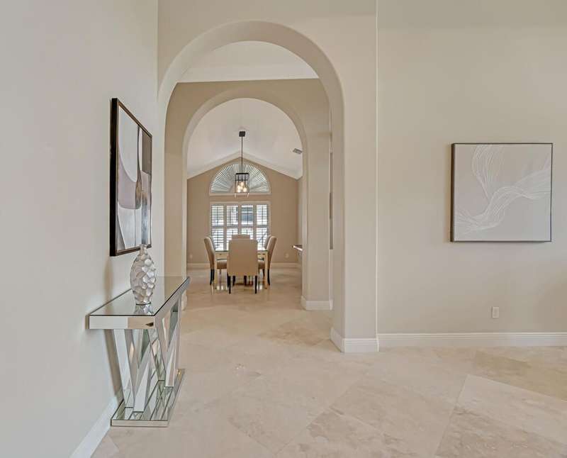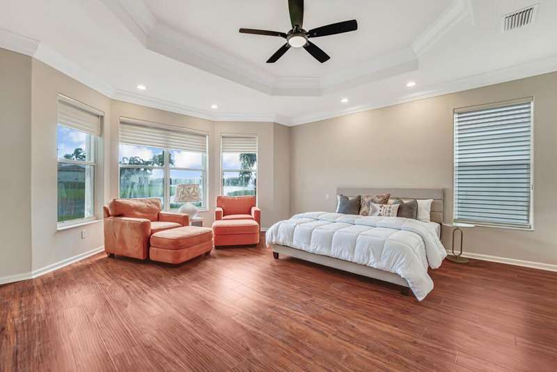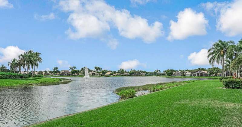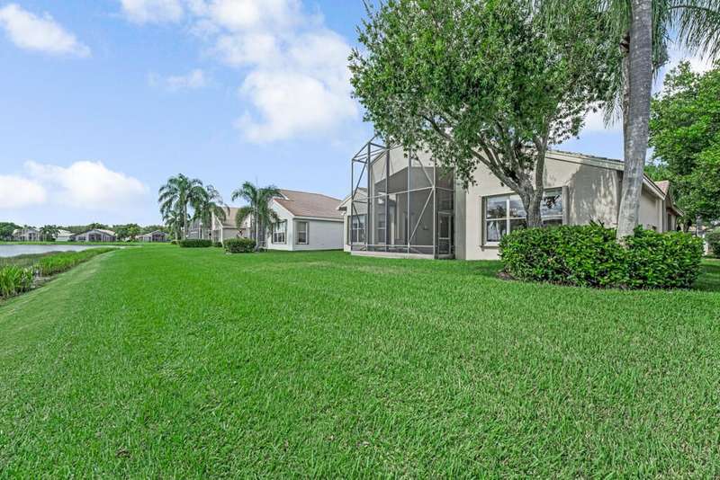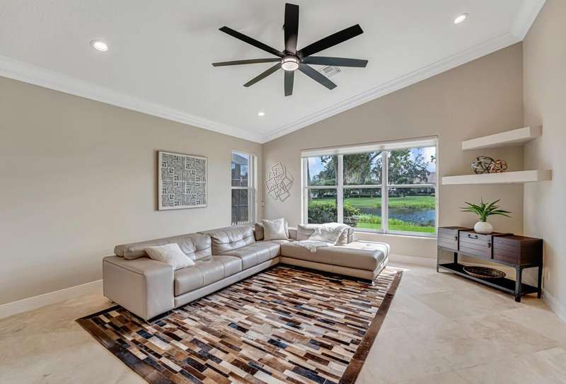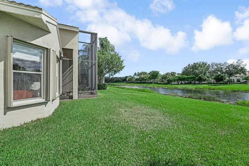 Magnificent MAIN LAKE WITH FOUNTAIN VIEWS make this 4 bedrm, 2 1/2 bath model home one of the most desirable in the community! A rare find, gorgeous marble floors & double entry doors greet you with light and bright open, airy space throughout! Gorgeous new lighting fixtures, LED high hats, super high ceilings, & a huge screened lanai with beautiful flooring , privacy overlooking water water everywhere create instant peace & serenity! No carpeting! Accordian shutter protection throughout! Walk to clubhouse, social tropical pool, full Serv restaurant, 6 pickleball crts, 3 Bocce crts! 10 tennis crts, 2 indoor racquetball CRTs, indoor whirlpool,resistance pool, lap pool too! Suana,steam, massage, Beaty salon, STATE OF ART FITNESS CTR! Country club lifestyle without the dues! LOVE THIS HOUSE!