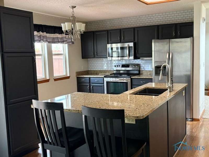 Amazing beautiful space in this family home including great room, Family room with gas fireplace, and FULL basement. Updates galore including modern kitchen with all appliances included, flooring, second story laundry and extras. Full finished basement for multiple uses. Incredible insulated Man cave, extra parking, two- story decking, large yard with backdrop of trees. Immediate occupancy available. Ideal location near school campus.