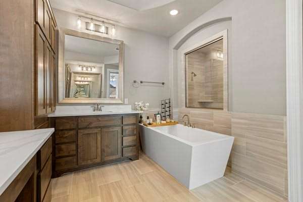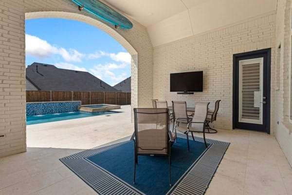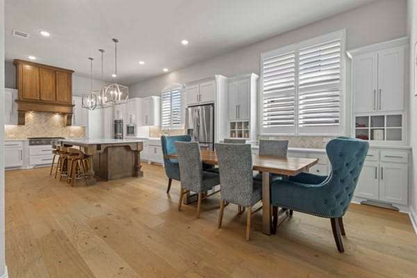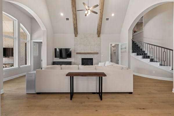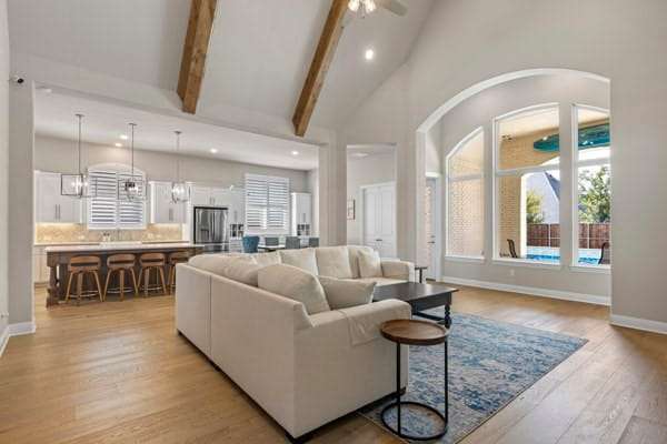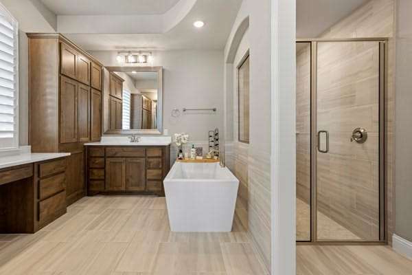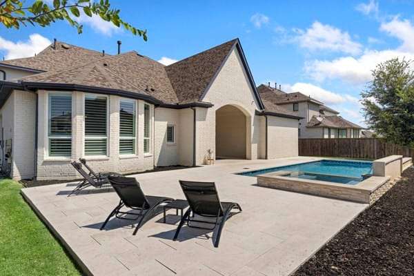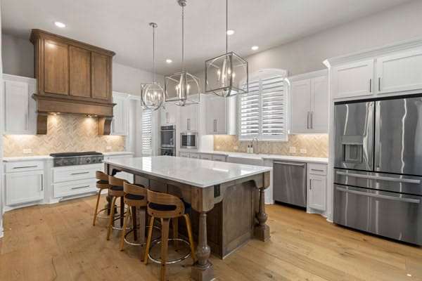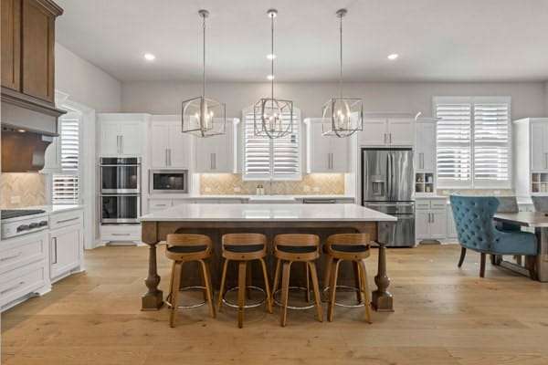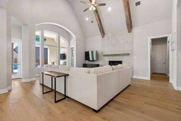 Discover this highly sought-after, north-facing residence, where elegance meets comfort. Insise you will find exquisite white oak floors that stretch throughout the home, setting a refined tone. The heart of the home features an open-concept floor plan, and soaring ceilings adorned with rustic wood beams. A magnificent floor-to-ceiling fireplace serves as a stunning focal point. Thoughtful incorporation of natural wood elements throughout the house infuses warmth into this bright and airy living space, creating a welcoming atmosphere. Culinary enthusiasts will delight in this kitchen equipped with a gas cooktop, state-of-the-art stainless steel appliances, and a charming farmhouse sink. A generous island provides ample space for meal preparation and is ideal for gatherings and entertaining. The kitchen seamlessly connects to both the media room and the expansive family room. This home features a media room conveniently located on the ground floor. Retreat to the primary bedroom, a sanctuary featuring a wall of windows that fill the room with natural light, complemented by elegant shutters throughout. The luxury primary bath is designed for ultimate relaxation,with rich wood finishes and abundance of storage, with a free-standing tub. The primary closet is a spacious walk-in, offering direct access to the laundry room. Step outside to a large covered patio, complete with spacious decking, ideal for outdoor cookouts and enjoying the sun. The expansive lot offers a private oasis, featuring a resort-style pool and spa, promising endless relaxation and entertainment possibilities. Upstairs, a large loft provides a versatile space, perfect for a teen retreat, dedicated second office, or a flexible room to suit your needs. For ultimate comfort and privacy, all bedrooms in this home are ensuites, ensuring no sharing of bathrooms.Residents enjoy resort-style amenities, sparkling pools, tennis,pickleball courts, playgrounds, lakes, & miles of tree-lined walking trails.