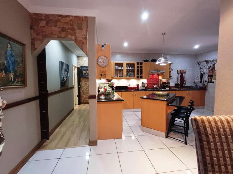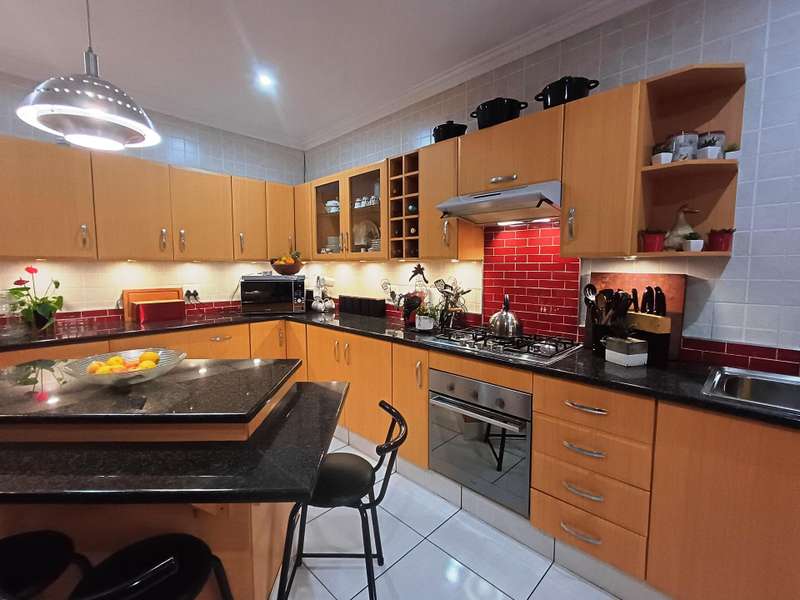 Beautiful open plan living area leading into a gourmet kitchen with lovely wooden cupboards, granite counter tops, gas hob, under counter oven, extractor fan, breakfast nook.