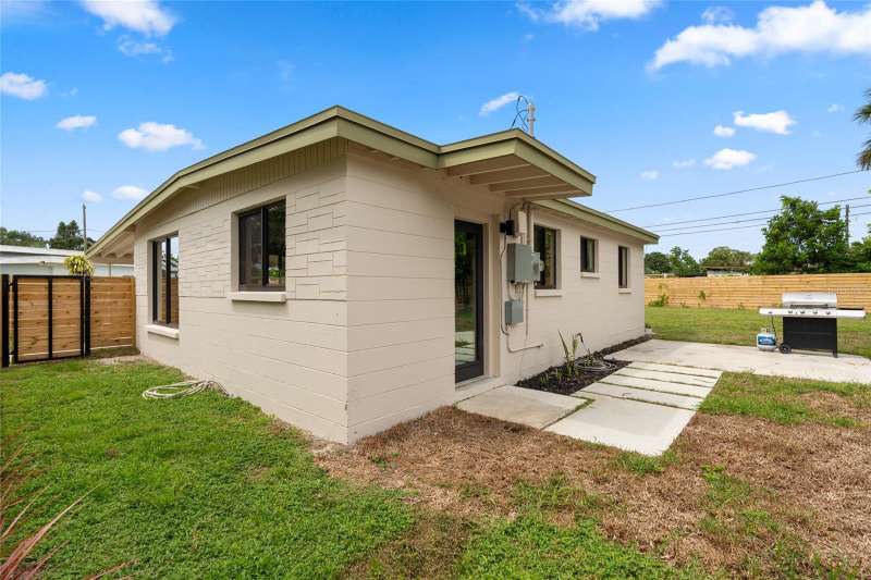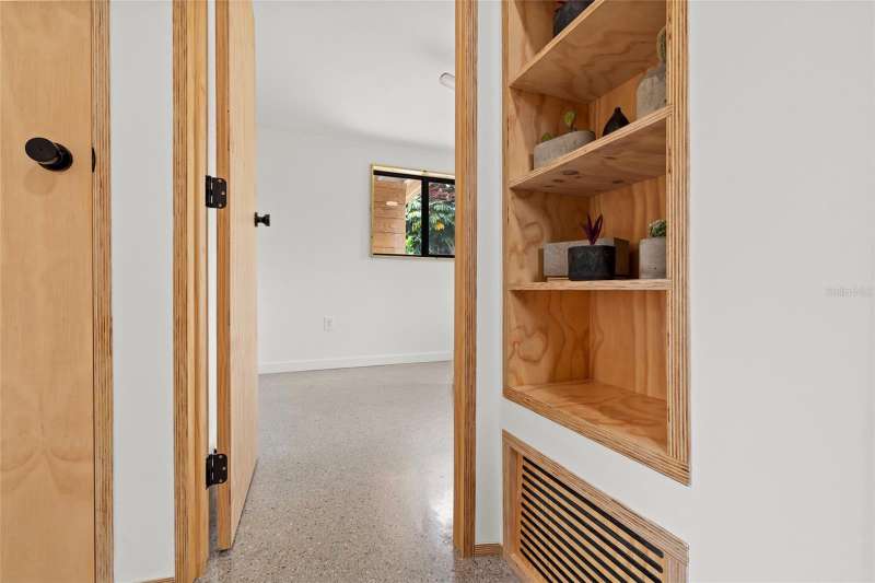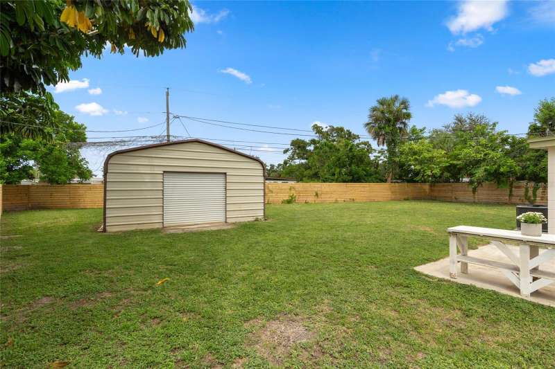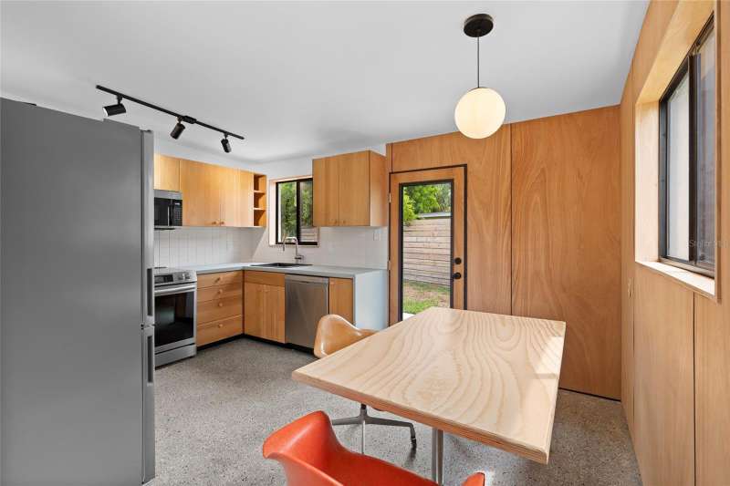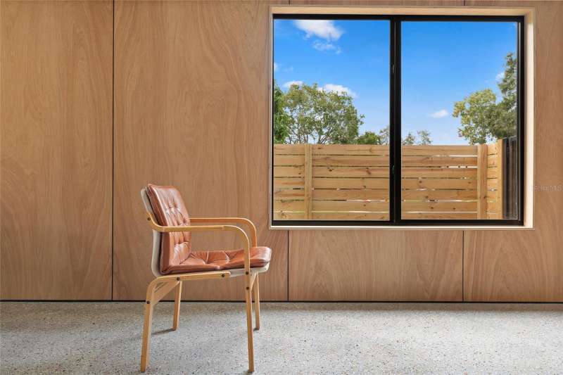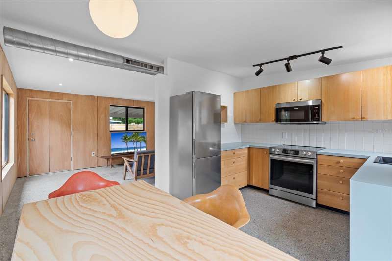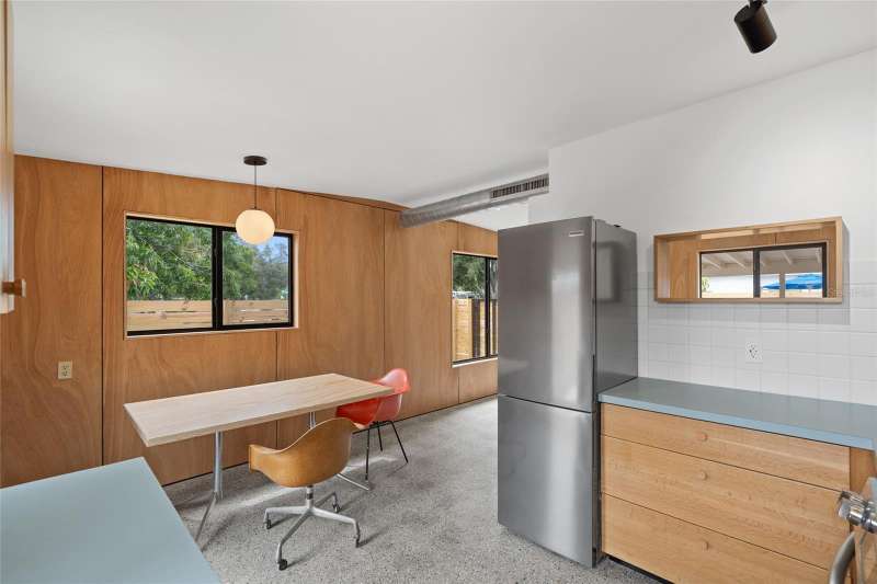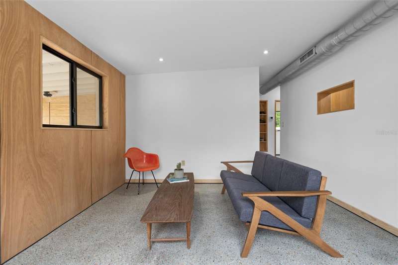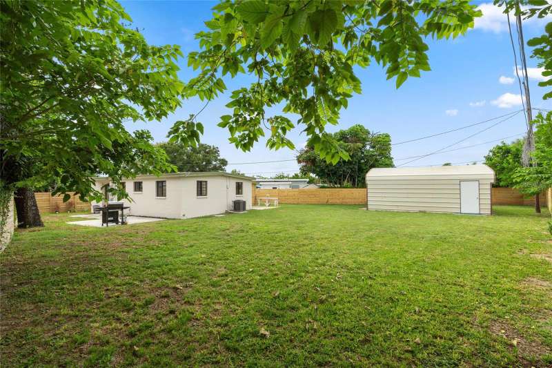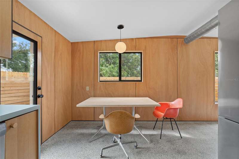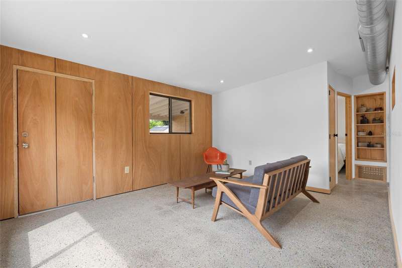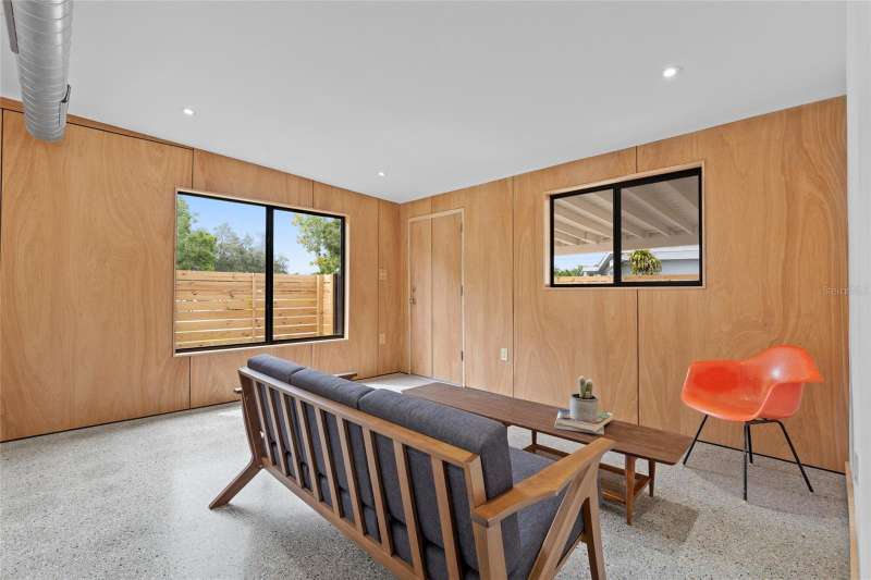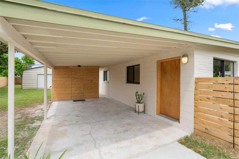 A mid-century ranch, reborn. This is The Turnaround House. For the admirer of minimalist, modernist design, this home has been thoughtfully renovated with inspiration from the greatest architects of our time. Clean lines, natural light and meticulous design defines each space. With the charm of an MCM home, it been masterfully renovated with new hurricane impact windows, new roof, new appliances, new HVAC with exposed industrial ductwork, new electrical, new plumbing, new indoor laundry and new fencing. Inside, discover custom built-ins, newly installed wood paneling with grain that flows seamlessly from ceiling to wall, immaculate trim work and polished terrazzo floors with the soft sheen of modern concrete. Set on an oversized lot along a quiet street, the property offers a carport, abundant attached storage, and an additional large shed ideal for a workshop. Outdoor spaces invite gatherings, with room in the backyard for a boat or RV. The front yard is graced with a mature mango tree and new concrete pavers, providing generous on-site parking. All of this, on a high-and-dry lot where flood insurance is not currently required. A rare find for this level of craftsmanship!