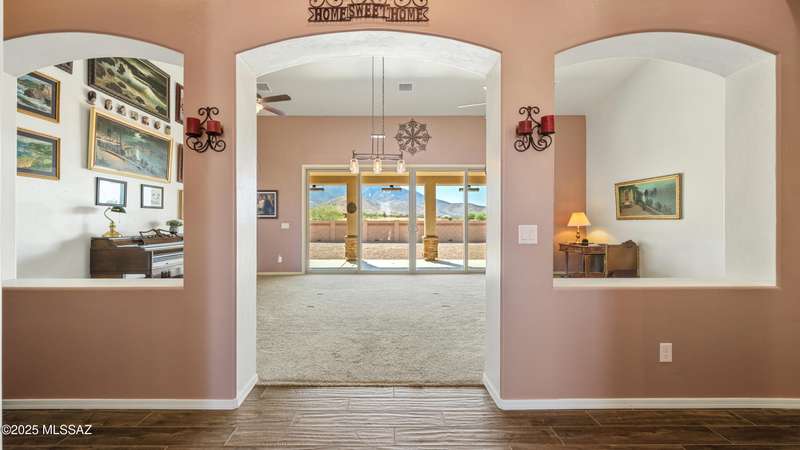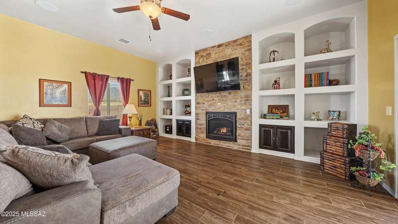 Another stunning Semi-Custom Workman-Build beauty in highly desirable Wild Horse!!! 3,040SF packed w/premium upgrades & thoughtful details throughout featuring 4BR, 2.5BA, oversized 3CG...built for both Comfort and Style...the Heart of this Home... a Gourmet Chef's Kitchen w/GE Profile SS Appliances, Side Bar, Double Wall Oven, Built-in MW Oven, Gas Cooktop w/Hood, Glass Rinser at Sink, Under Cabinet Lights, Rich Cabinetry w/Silent-Close features, Extensive Storage, Convenient Pull-Outs, In-Cabinet Waste Baskets, Spice Rack by Cooktop, Separate Walk-in Pantry...a Massive Granite Island opens into spacious LR, showcasing Entertainment Center w/Built-in Lighted features, Full-Height Stone Gas-Log FP, Surround Sound System w/2-zones (5 speakers in Great Room 2 speakers on Patio...see MORE!