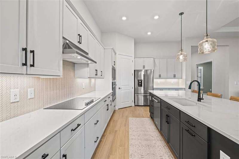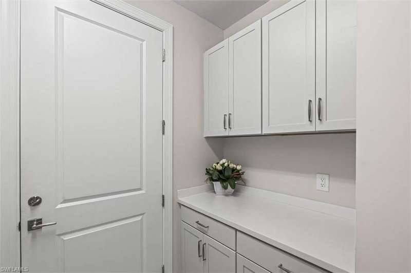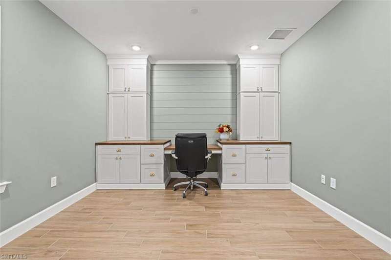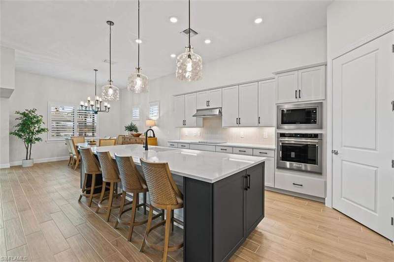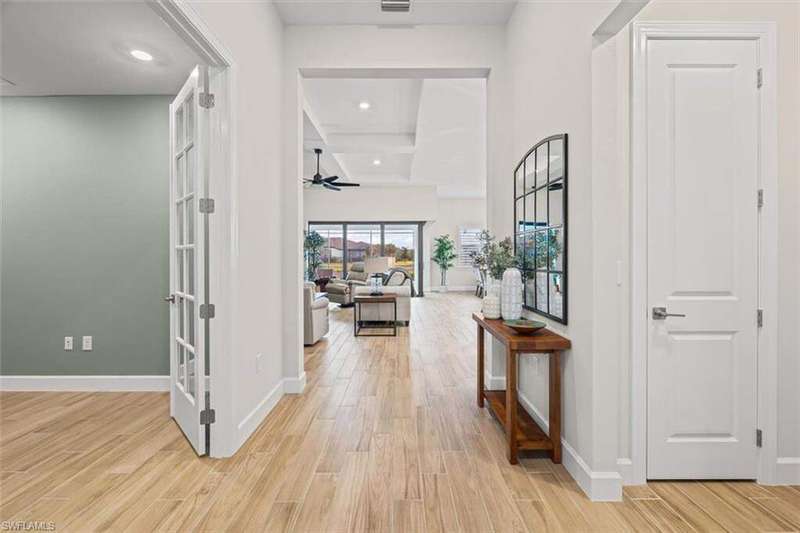 Experience refined elegance in this stunning, model-inspired home nestled on a serene cul-de-sac lot with breathtaking water and golf course views in the prestigious River Hall Country Club. From the moment you enter, exquisite craftsmanship captivates, with soaring coffered ceilings in the living room, elegant tray ceilings in the primary and guest suites, and custom built-ins in the private office, complete with cabinets and a desk for work or relaxation. Vibrant custom accent walls, designer paint, and a dramatic entertainment wall in the living room create a sophisticated ambiance. The open-concept chef's kitchen, with sleek darker island cabinets for bold contrast, flows seamlessly into the great room and dining area-an entertainer's dream. Plantation shutters throughout add timeless charm. The primary suite is a tranquil sanctuary, featuring custom wall accents, a spa-inspired bath with dual vanities, an oversized walk-in shower, and a meticulously organized walk-in closet. Guests will feel pampered in private retreats, one with an en-suite bath and another offering ample comfort and privacy. Glass zero-corner sliding doors open to an expansive covered lanai, perfect for unforgettable gatherings, complete with a heated pool and spa for year-round relaxation and generous deck space for lounging or games. The three-car garage, ideal for car enthusiasts or golf cart lovers, provides abundant storage, blending function with luxury. River Hall Country Club offers a vibrant lifestyle with HOA and golf fees covering an array of premium amenities: cable, high-speed internet/WiFi, irrigation water, lawn/land maintenance, exterior pest control, access to recreational facilities, 24/7 security, street lights, street maintenance, and the renowned championship golf course. Enjoy pickleball courts, a resort-style pool, a state-of-the-art fitness center, a clubhouse, and on-site dining. Seize this extraordinary opportunity-schedule your private tour today and elevate your lifestyle in this unparalleled haven of luxury and leisure! No Flood Insurance required...located in desireable Zone "X"