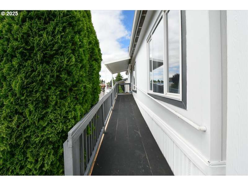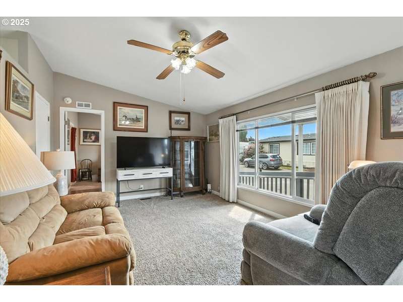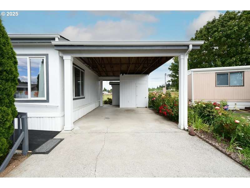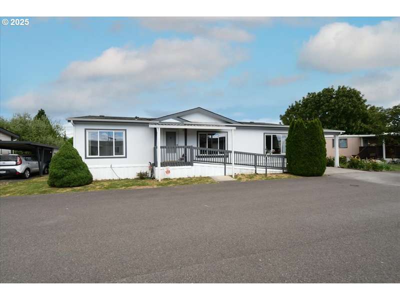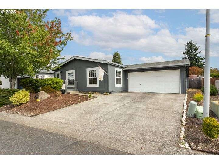 Very well-maintained 3BR/2BA Fleetwood home and one of the few in this 55+ community that backs to Heritage Farms/WSU Community Gardens. Sip coffee on the covered back deck and enjoy the view. Large primary w/huge bath. Big kitchen w/eating bar on island. Newer dishwasher, all appliances included. 8x8 garden shed, extra storage in 2-car covered carport. Listing agent related to seller. One year of space rent credit to buyer with accepted offer!