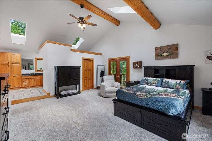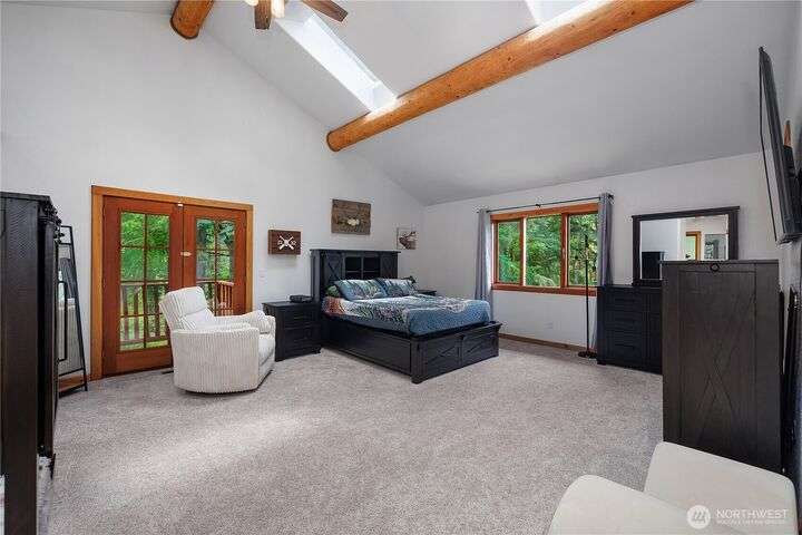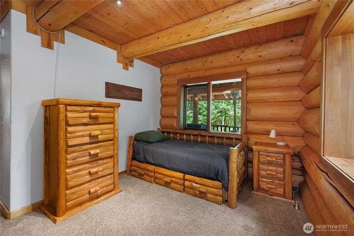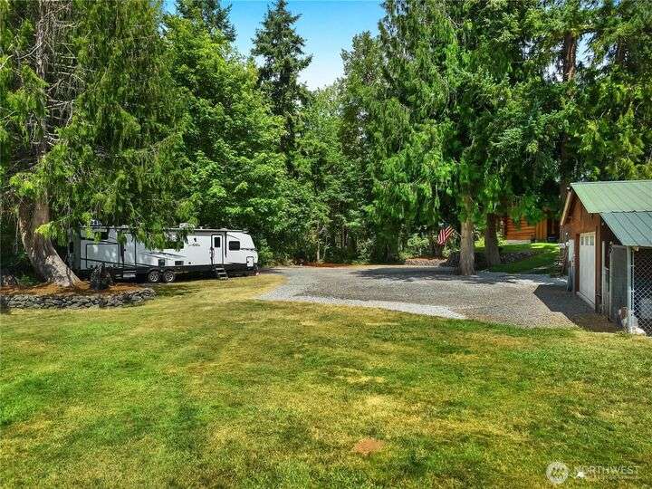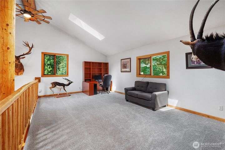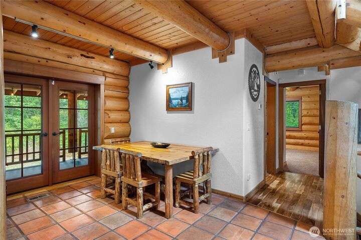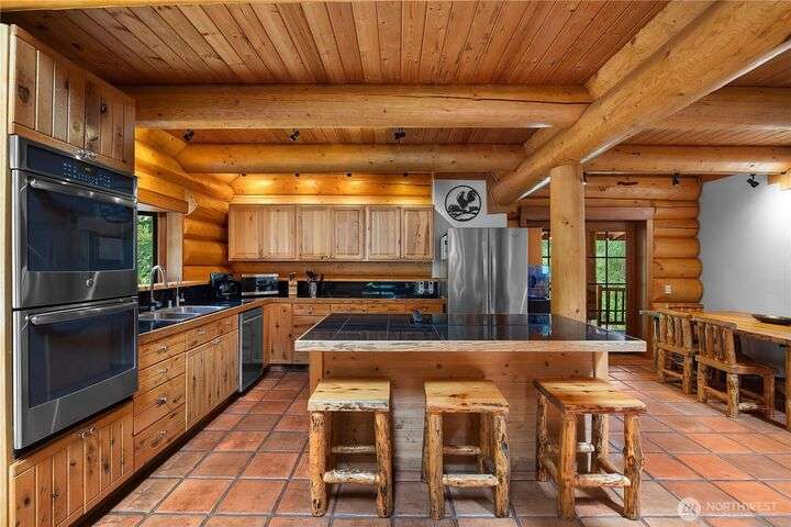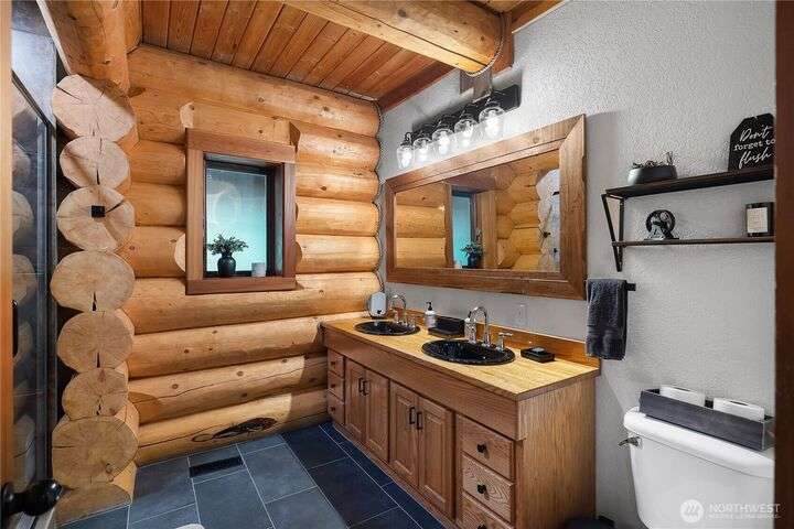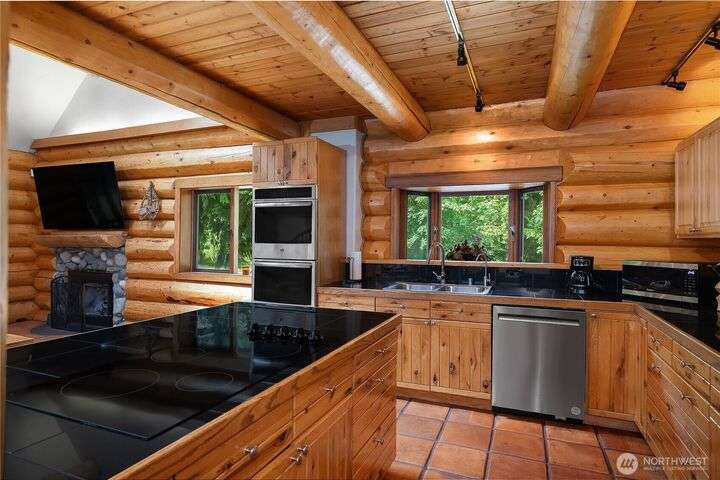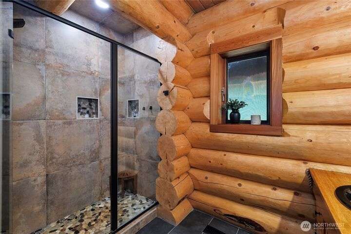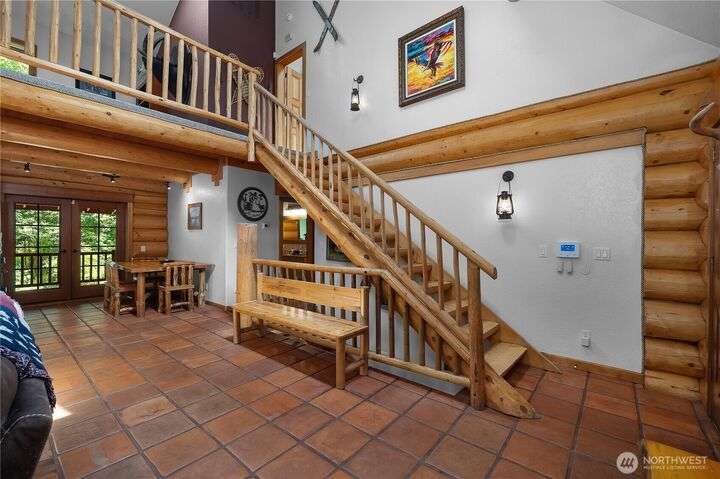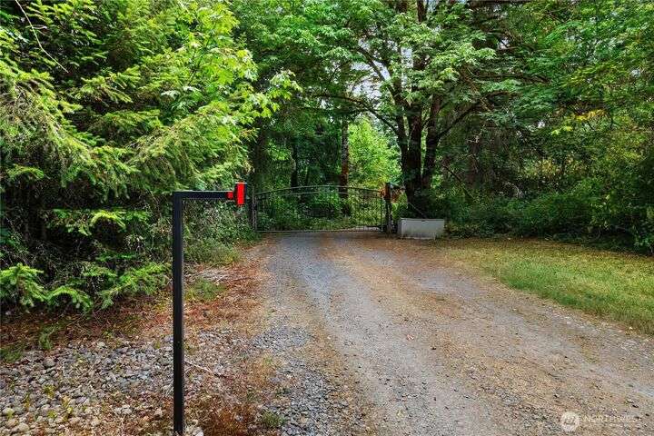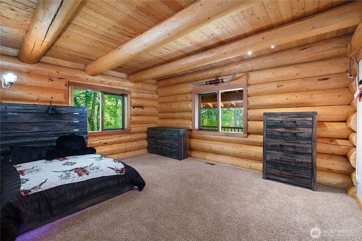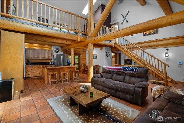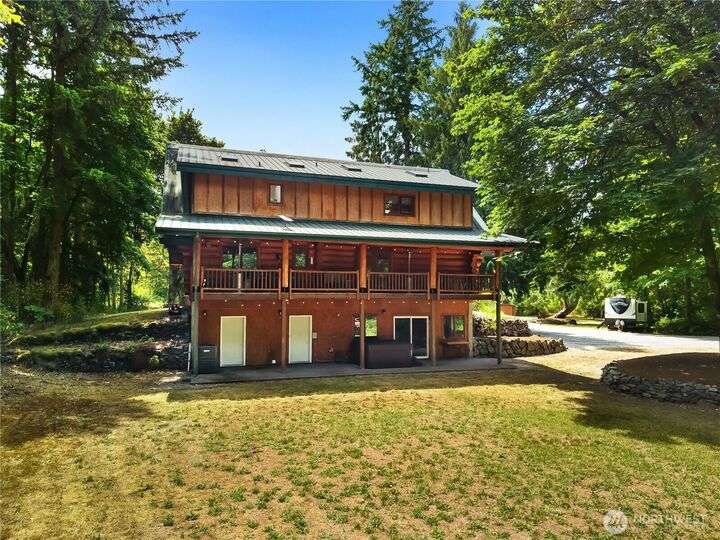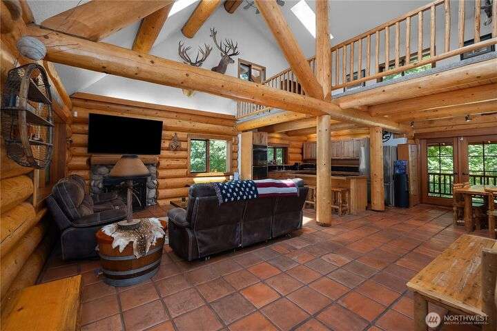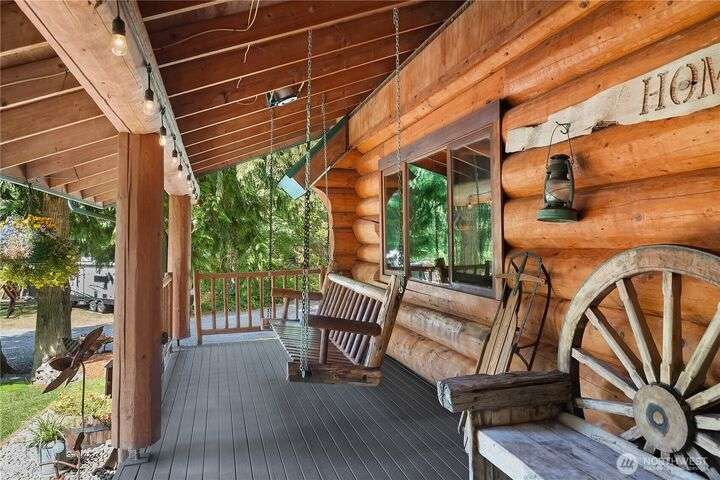 A captivating 3544 sq ft log home offering rustic charm and modern luxury. This Pacific NW retreat provides a privately gated and secluded 10+ acres. The multi-level functional design has 3 bedrooms, a den & 3 bathrooms. Large windows and skylights invite natural light and offer breathtaking views of the surrounding landscape. The gourmet kitchen boasts custom wood cabinetry, high-end appliances, and stunning countertops. A focal point of the living area is the stone fireplace, perfect for cozy nights and gatherings. The primary suite is a private sanctuary, complete with spa-like bathroom, walk-in closet, and dedicated balcony. Multiple viewing decks and patio with hot tub for outdoor enjoyment. Bonus: Oversized garage with shop.
